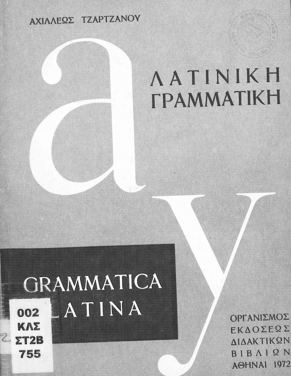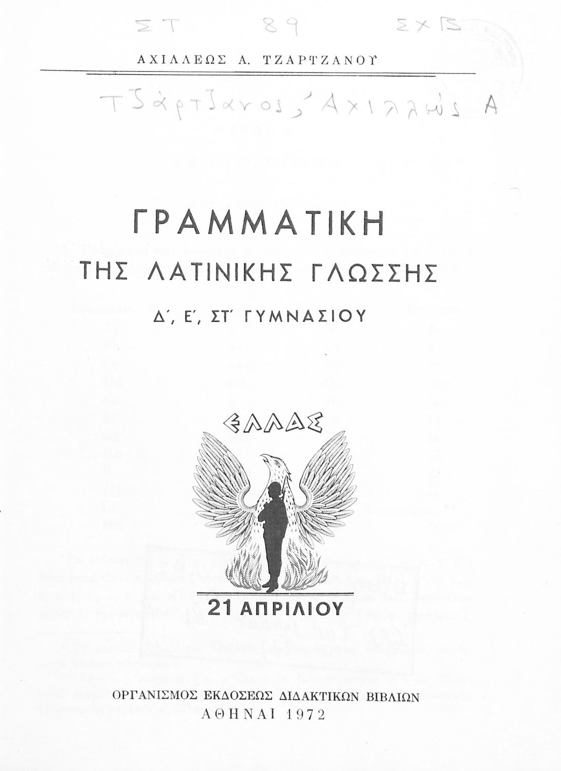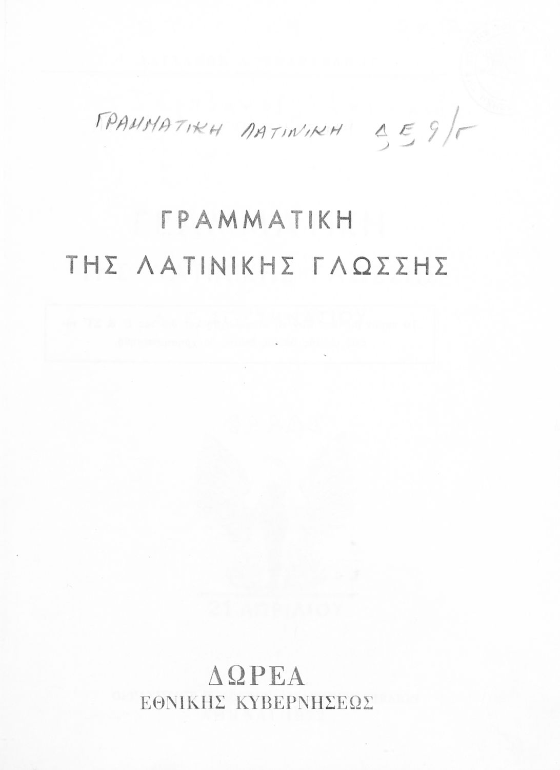 Σχολικό εγχειρίδιο Λατινικών Δ΄, Ε΄ και ΣΤ΄ Γυμνασίου που περιλαμβάνει γραμματική και συντακτικό και είναι χωρισμένο σε φθογγολογικό, τυπολογικό και ετυμολογικό μέρος. Φέρει το σύμβολο της δικτατορίας.