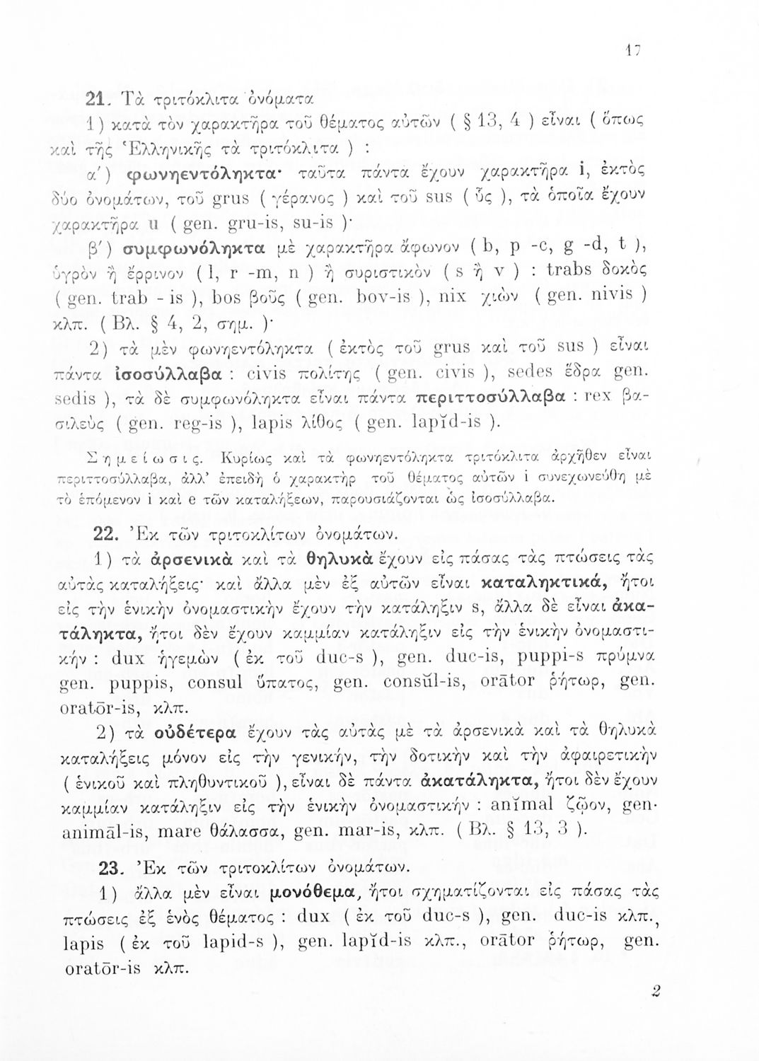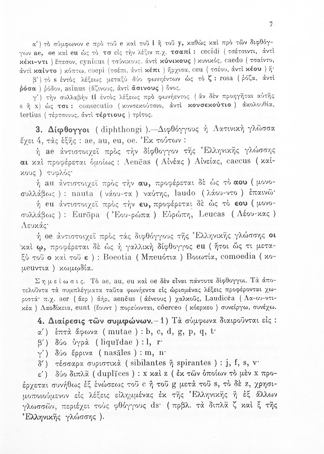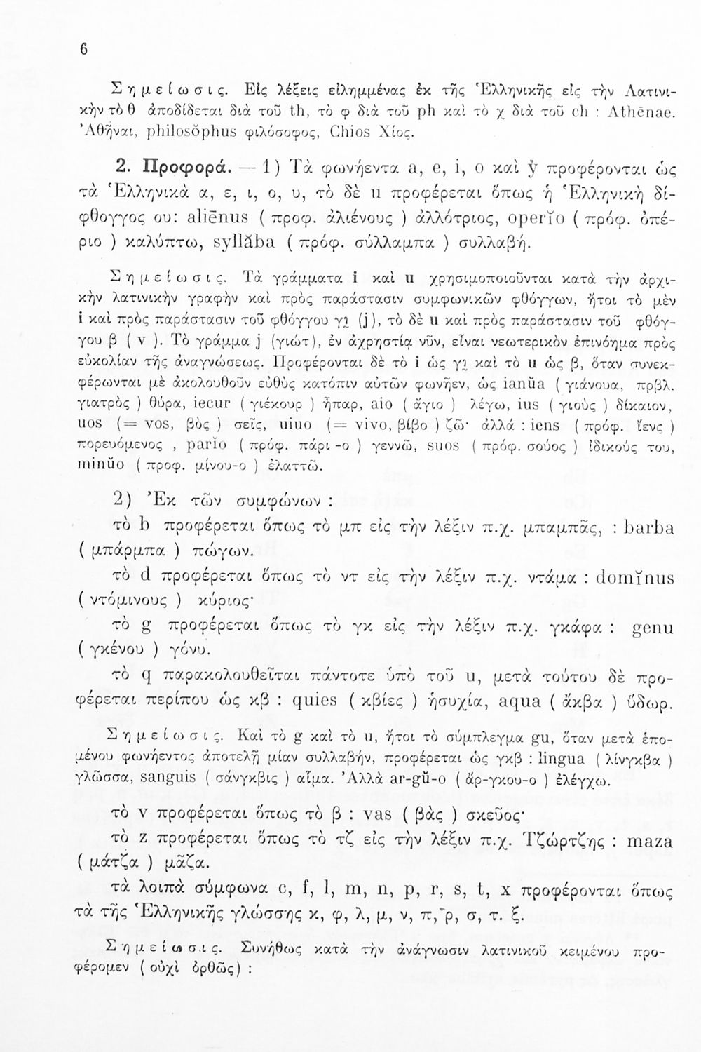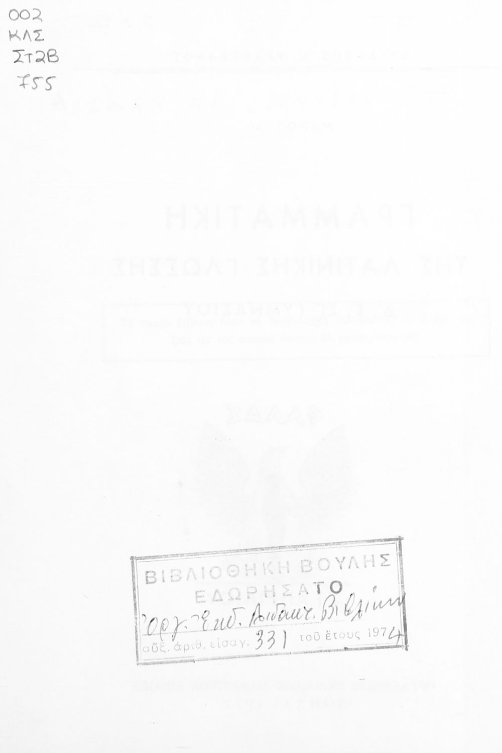Σχολικό εγχειρίδιο Λατινικών Δ΄, Ε΄ και ΣΤ΄ Γυμνασίου που περιλαμβάνει γραμματική και συντακτικό και είναι χωρισμένο σε φθογγολογικό, τυπολογικό και ετυμολογικό μέρος. Φέρει το σύμβολο της δικτατορίας.