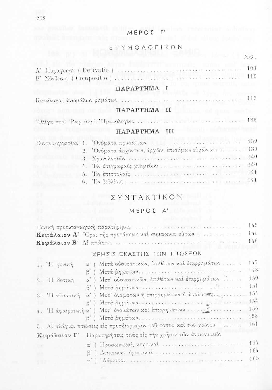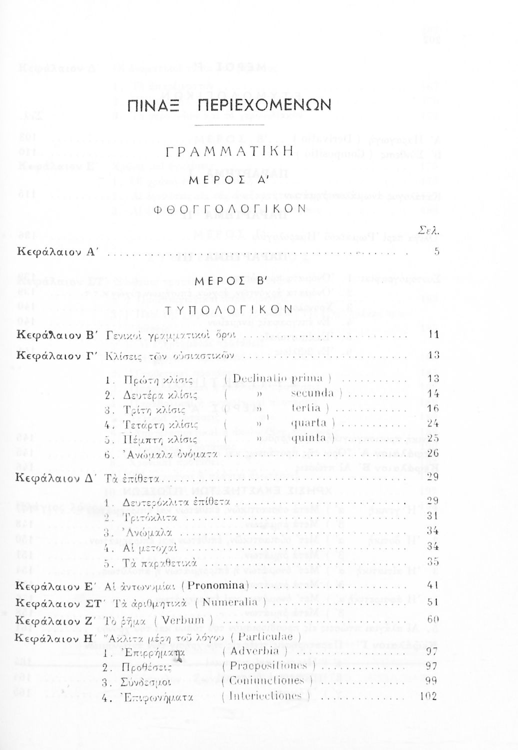 Σχολικό εγχειρίδιο Λατινικών Γυμνασίου που περιλαμβάνει γραμματική και συντακτικό και είναι χωρισμένο σε φθογγολογικό, τυπολογικό και ετυμολογικό μέρος.