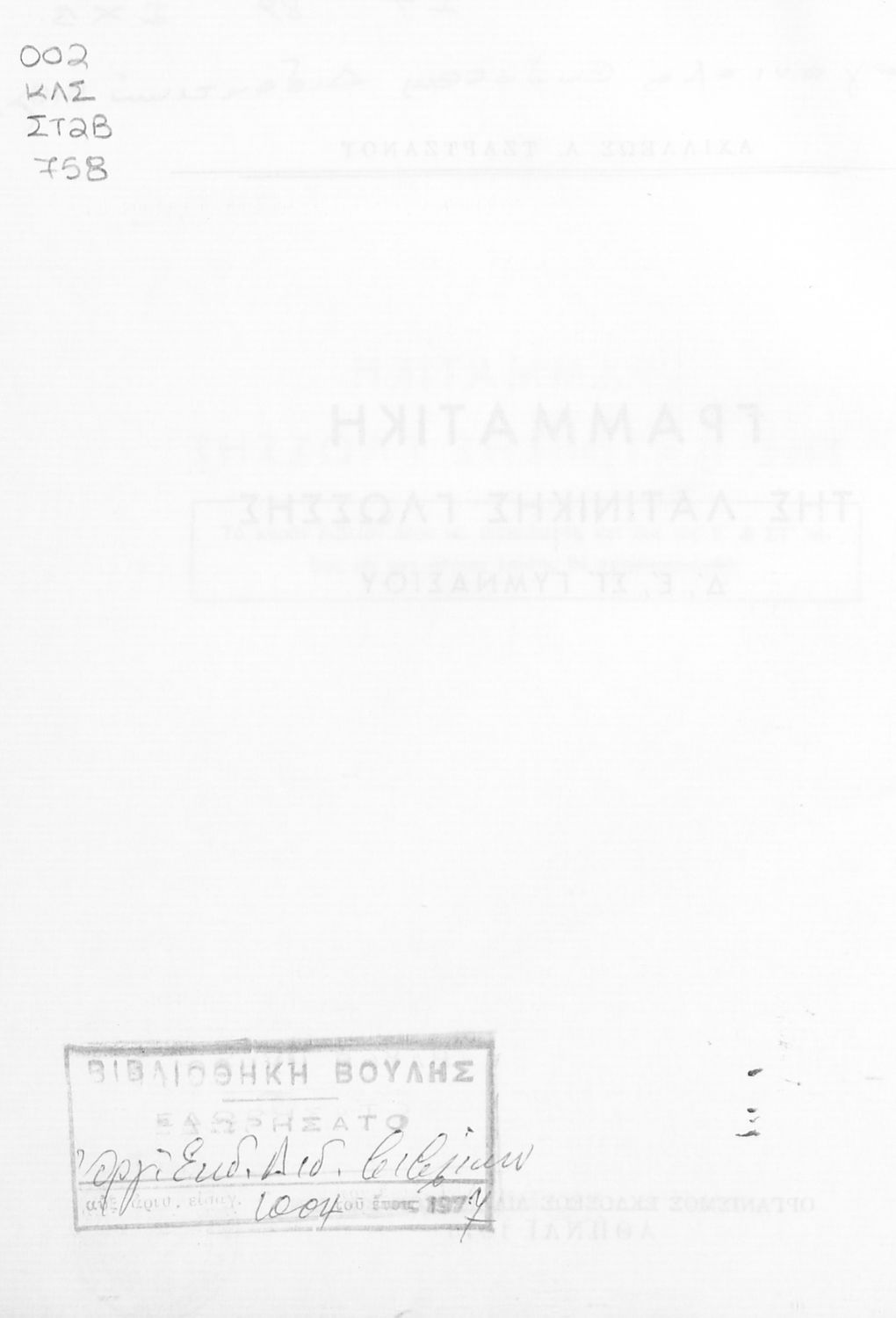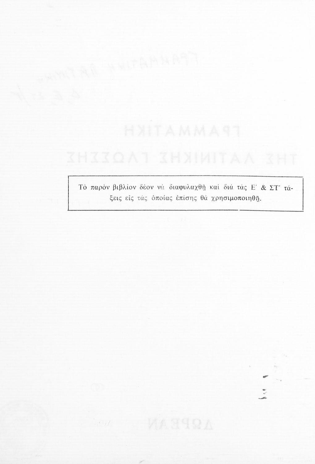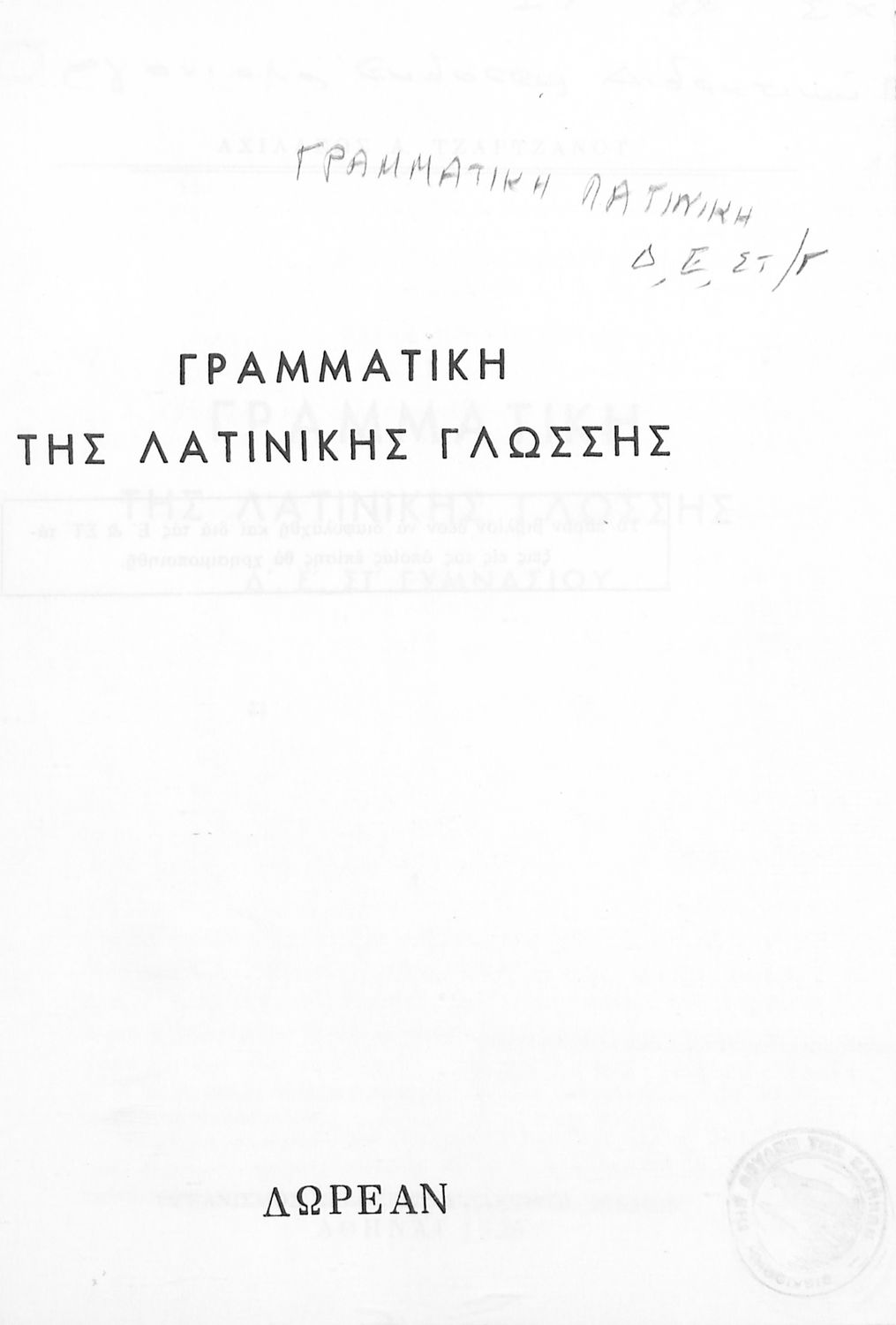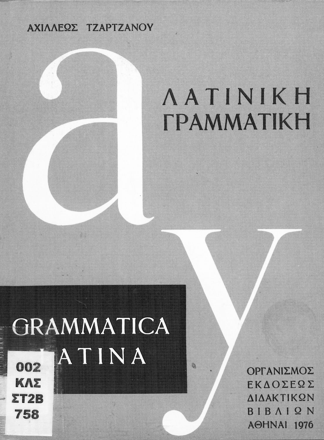 Σχολικό εγχειρίδιο Λατινικών Δ΄, Ε΄ και ΣΤ΄ Γυμνασίου που περιλαμβάνει γραμματική και συντακτικό και είναι χωρισμένο σε φθογγολογικό, τυπολογικό και ετυμολογικό μέρος.