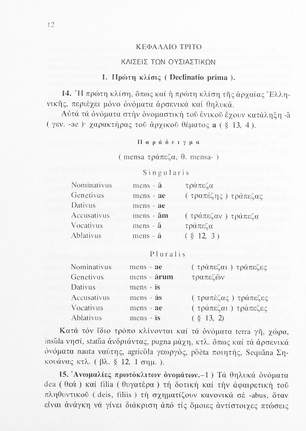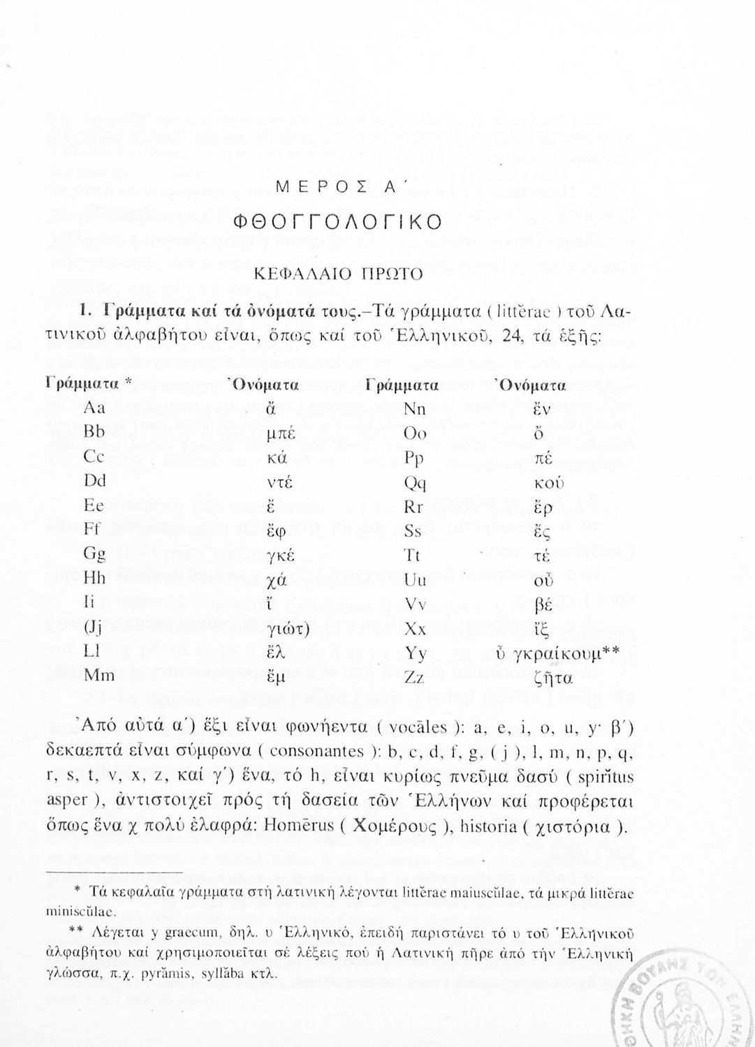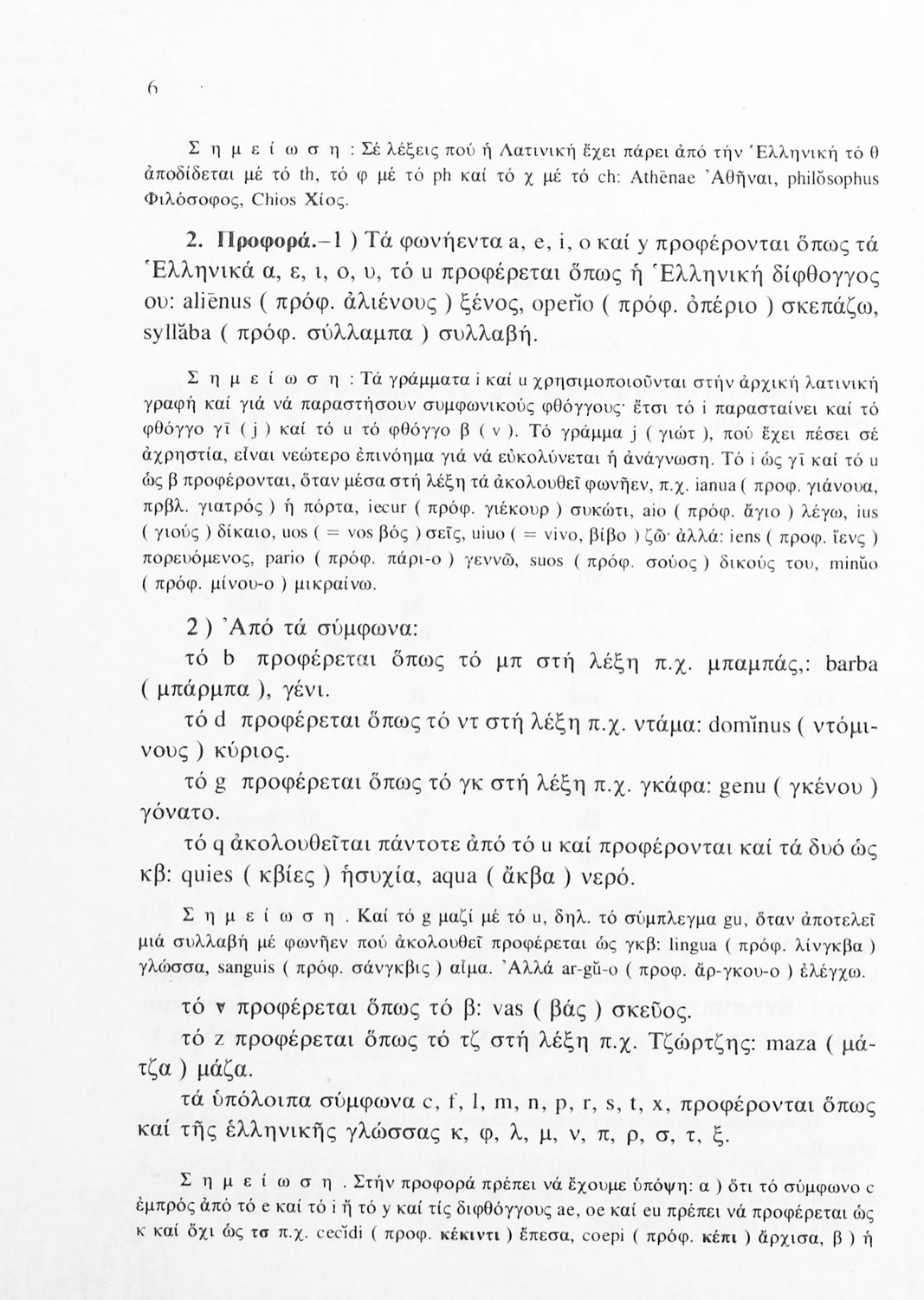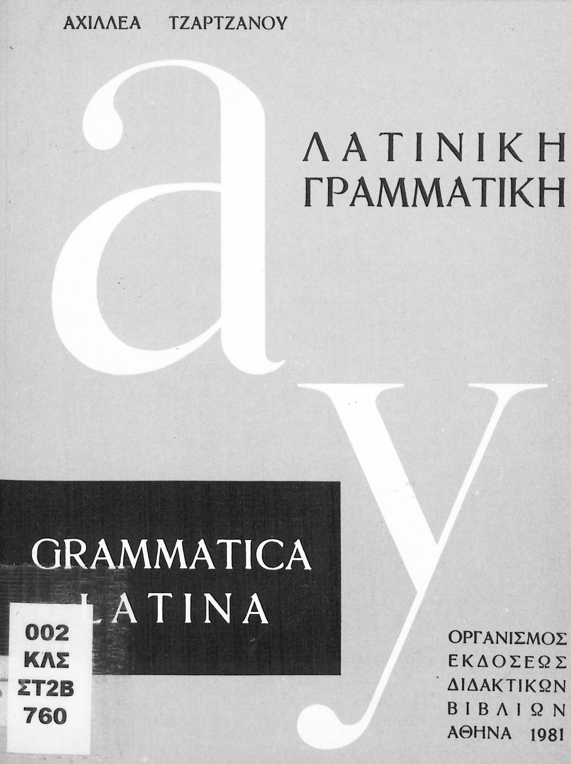 Σχολικό εγχειρίδιο Λατινικών Α' Κλασικού Λυκείου και Β' Γενικού Λυκείου που περιλαμβάνει τη γραμματική της λατινικής και είναι χωρισμένο στο φθογγολογικό, το τυπολογικό και το ετυμολογικό μέρος. Περιέχει και τους συντακτικούς κανόνες της λατινικής.