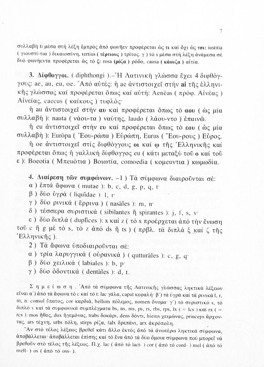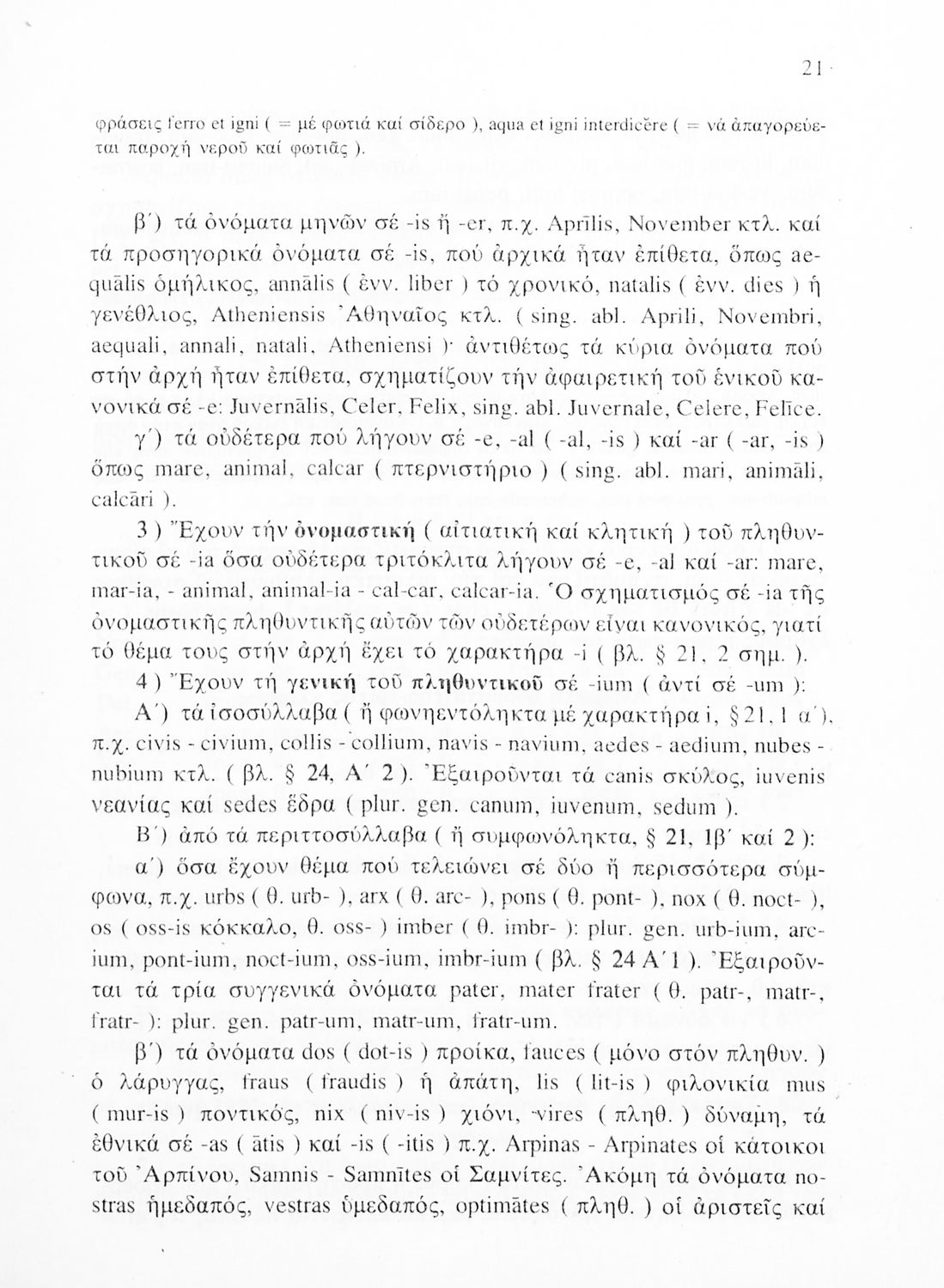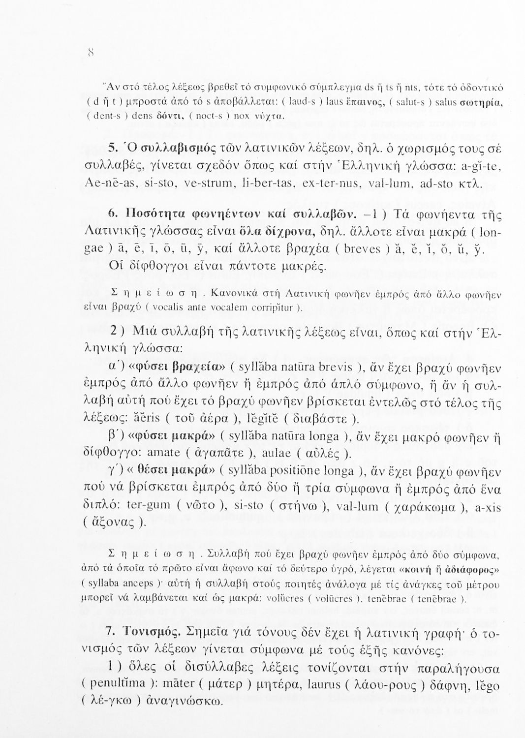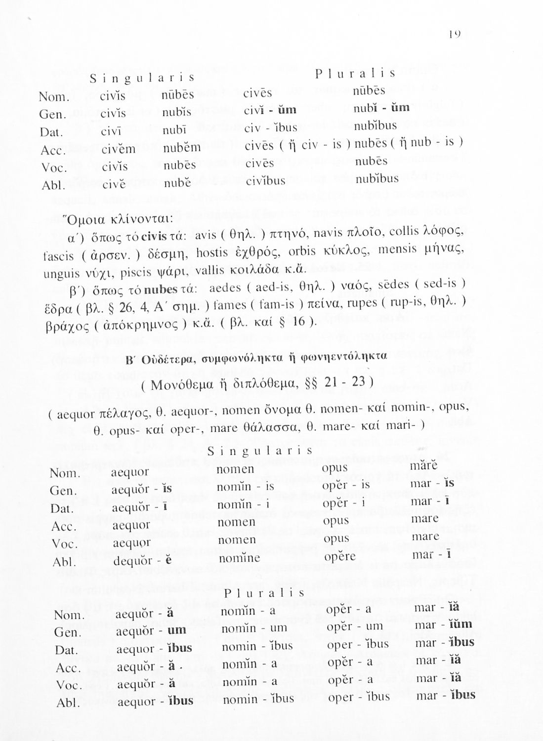 Σχολικό εγχειρίδιο Λατινικών Α' Κλασικού Λυκείου και Β' Γενικού Λυκείου που περιλαμβάνει τη γραμματική της λατινικής και είναι χωρισμένο στο φθογγολογικό, το τυπολογικό και το ετυμολογικό μέρος. Περιέχει και τους συντακτικούς κανόνες της λατινικής.