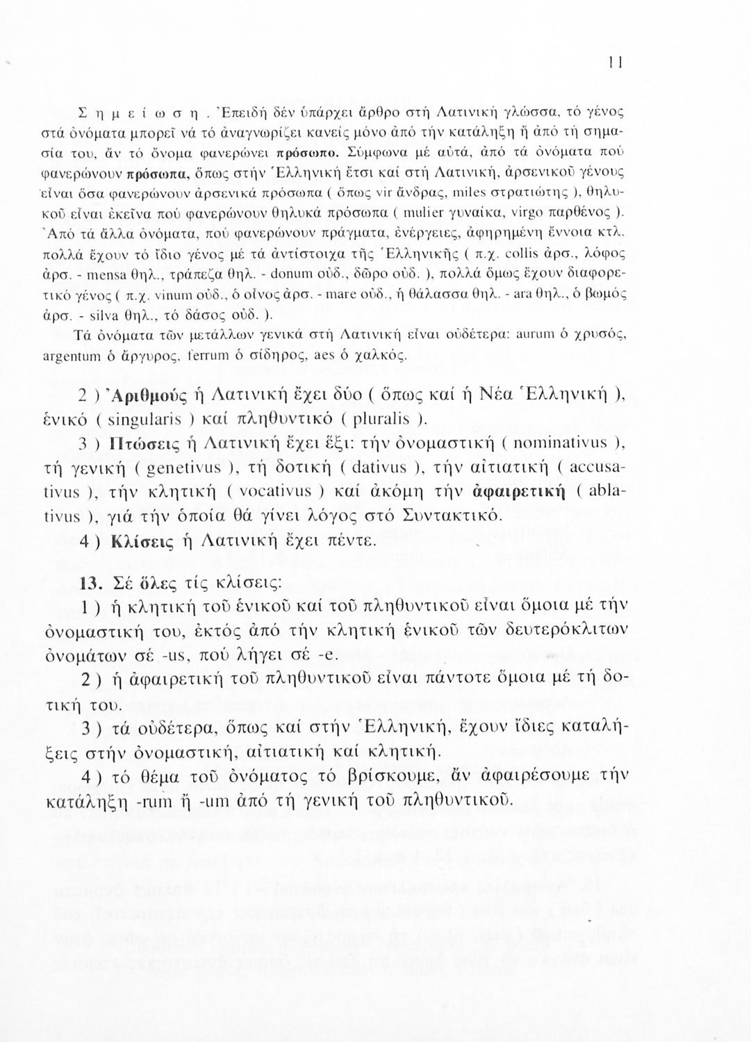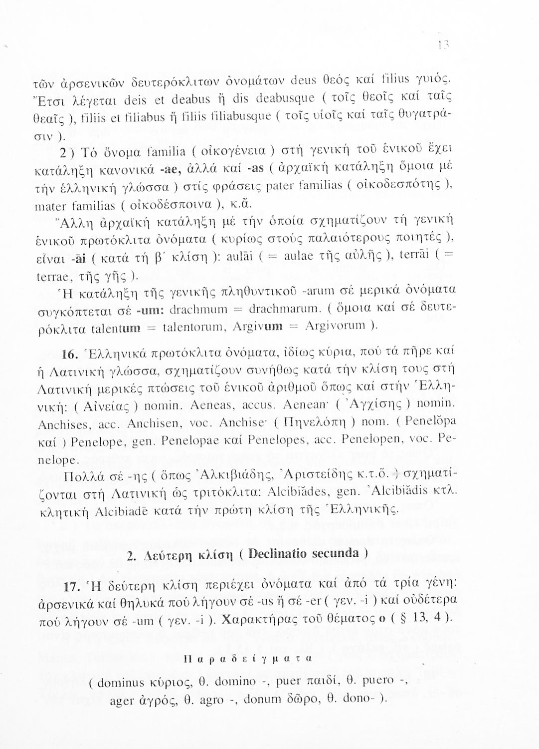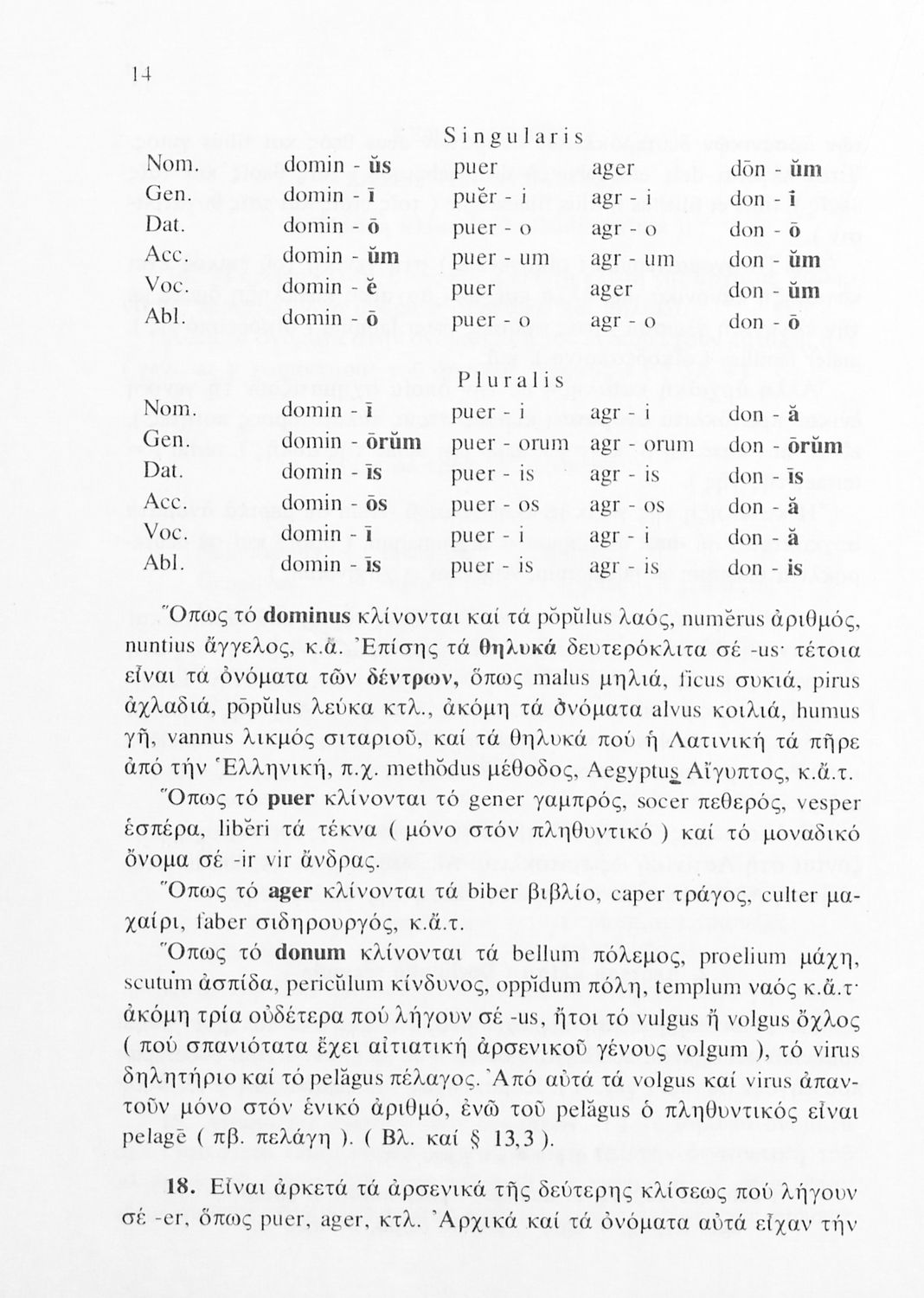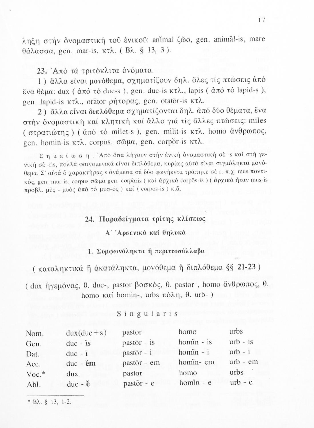 Σχολικό εγχειρίδιο Λατινικών Α' Κλασικού Λυκείου και Β' Γενικού Λυκείου που περιλαμβάνει τη γραμματική της λατινικής και είναι χωρισμένο στο φθογγολογικό, το τυπολογικό και το ετυμολογικό μέρος. Περιέχει και τους συντακτικούς κανόνες της λατινικής.