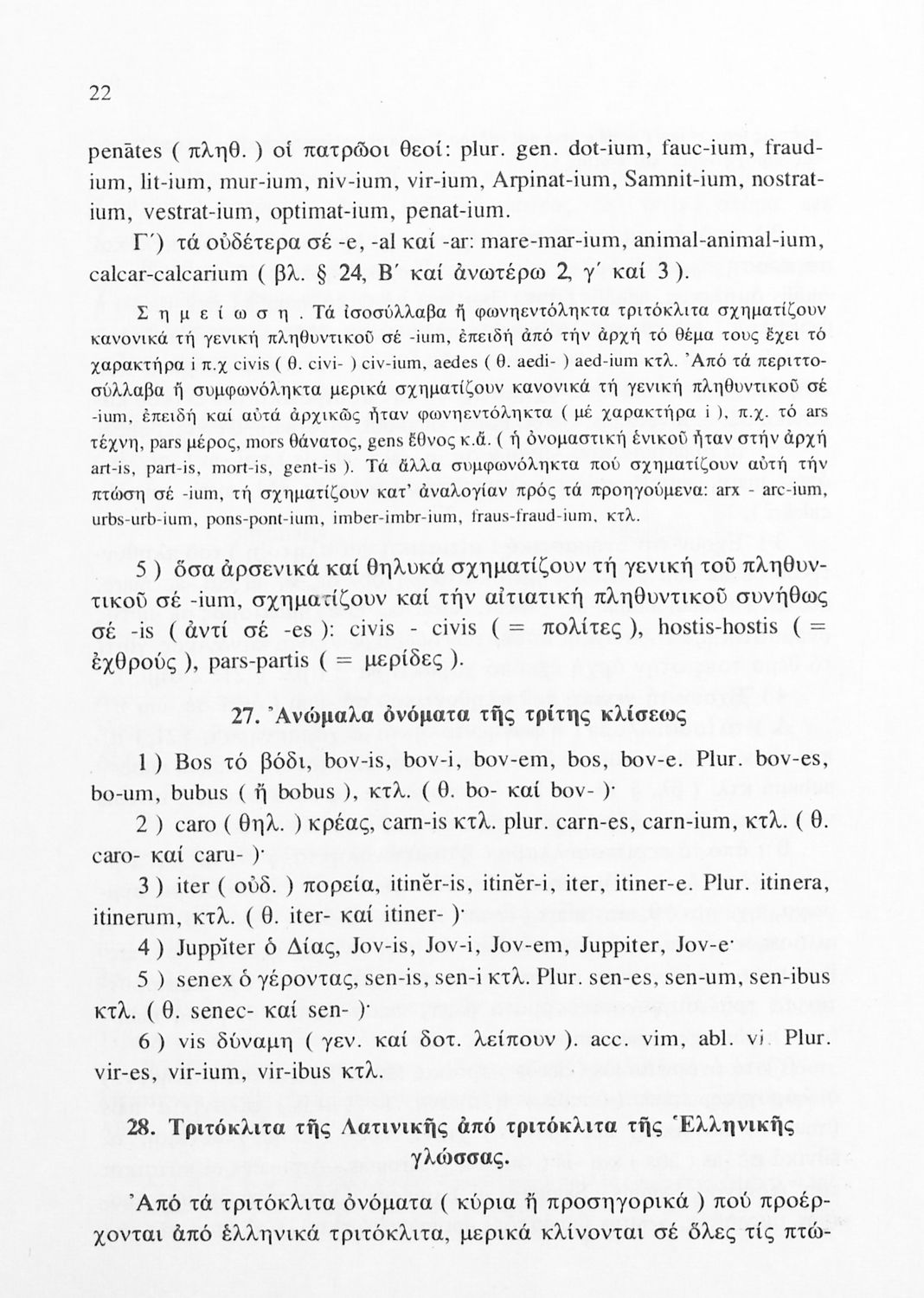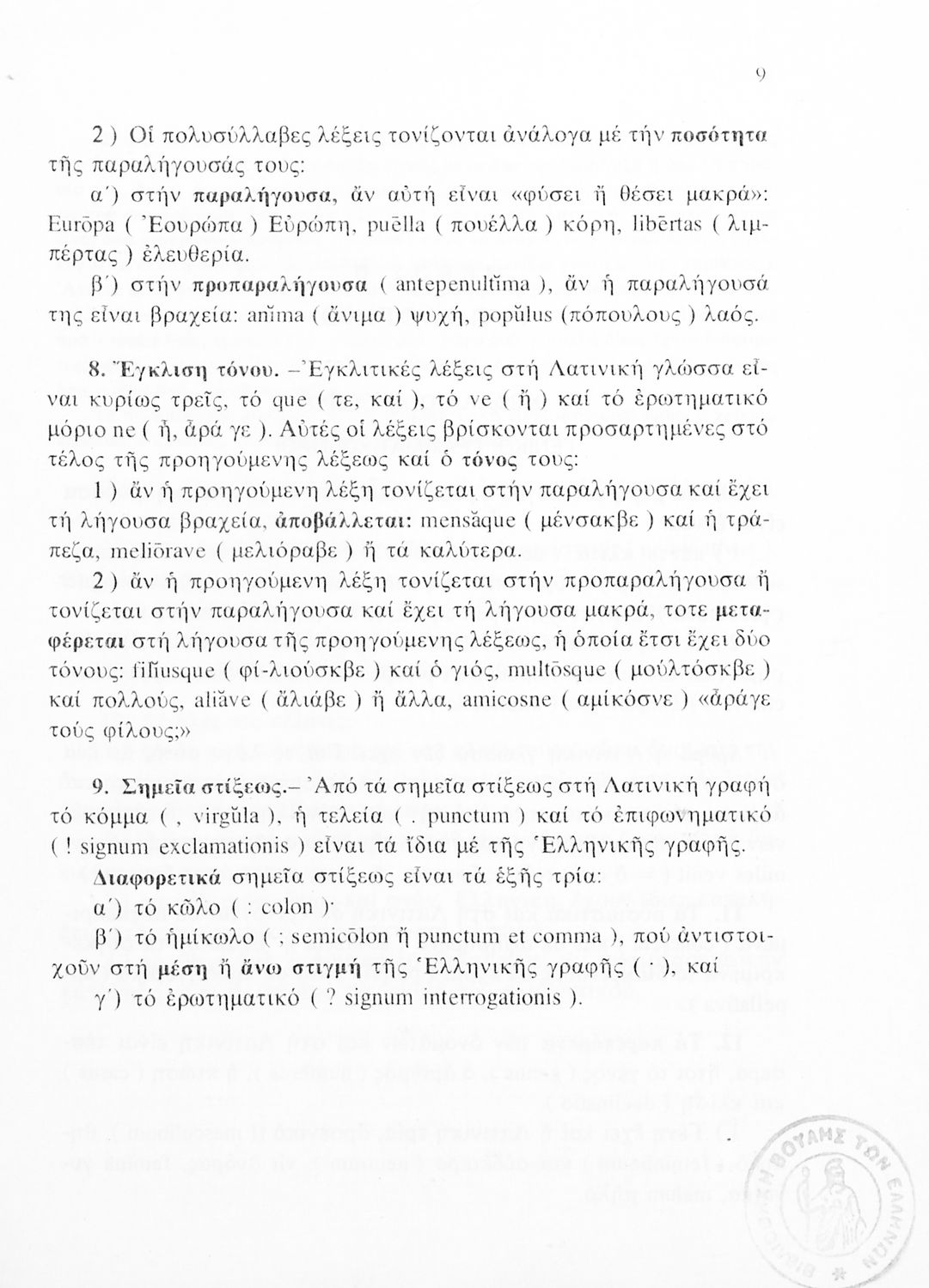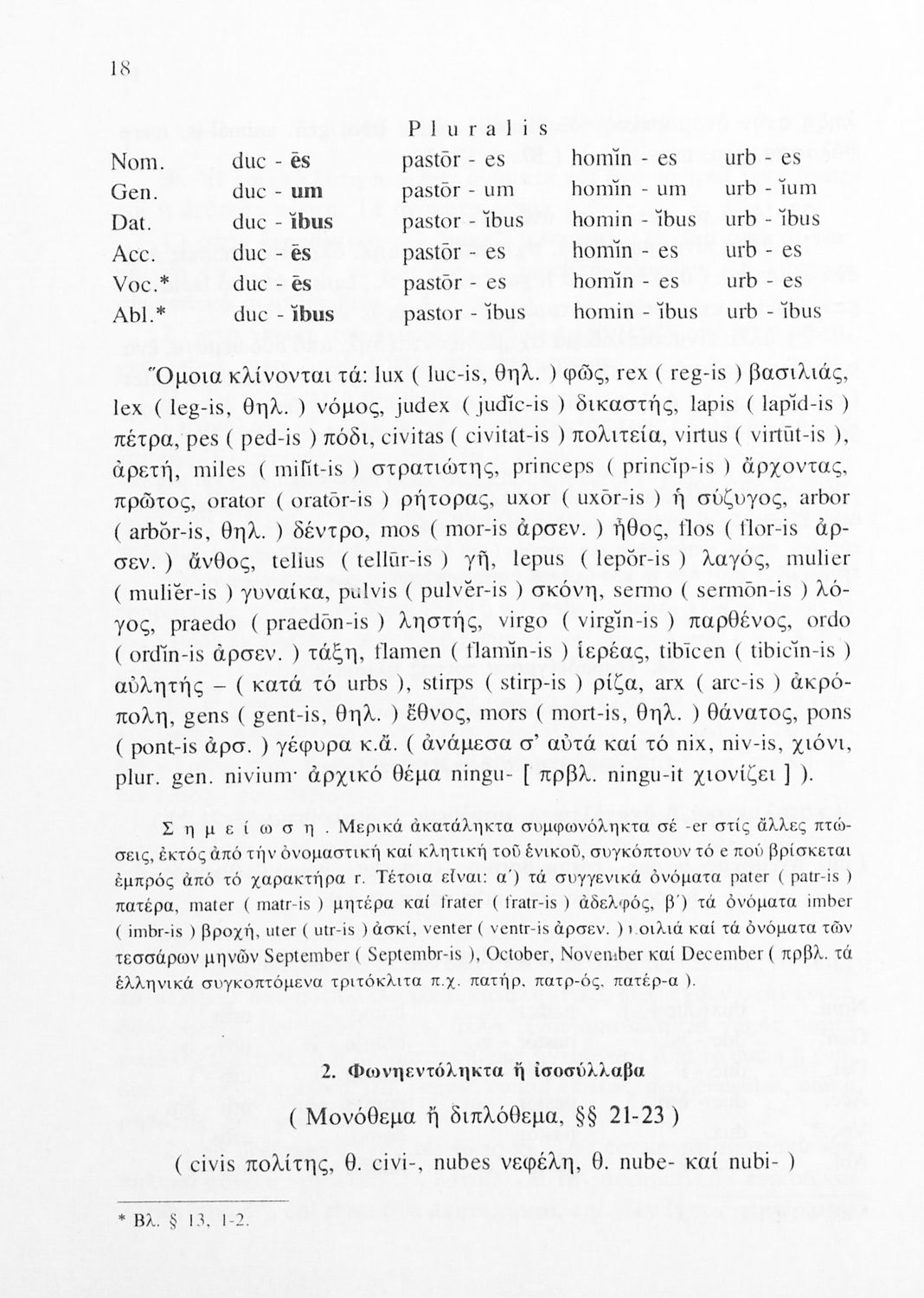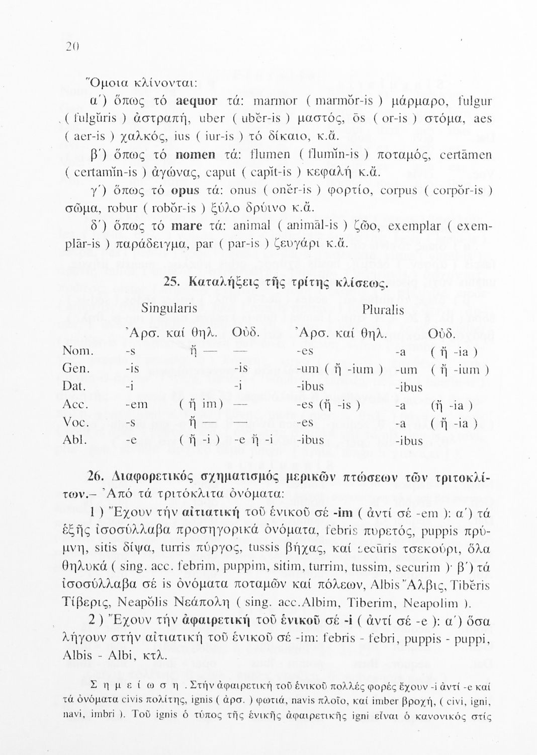 Σχολικό εγχειρίδιο Λατινικών Α' Κλασικού Λυκείου και Β' Γενικού Λυκείου που περιλαμβάνει τη γραμματική της λατινικής και είναι χωρισμένο στο φθογγολογικό, το τυπολογικό και το ετυμολογικό μέρος. Περιέχει και τους συντακτικούς κανόνες της λατινικής.
