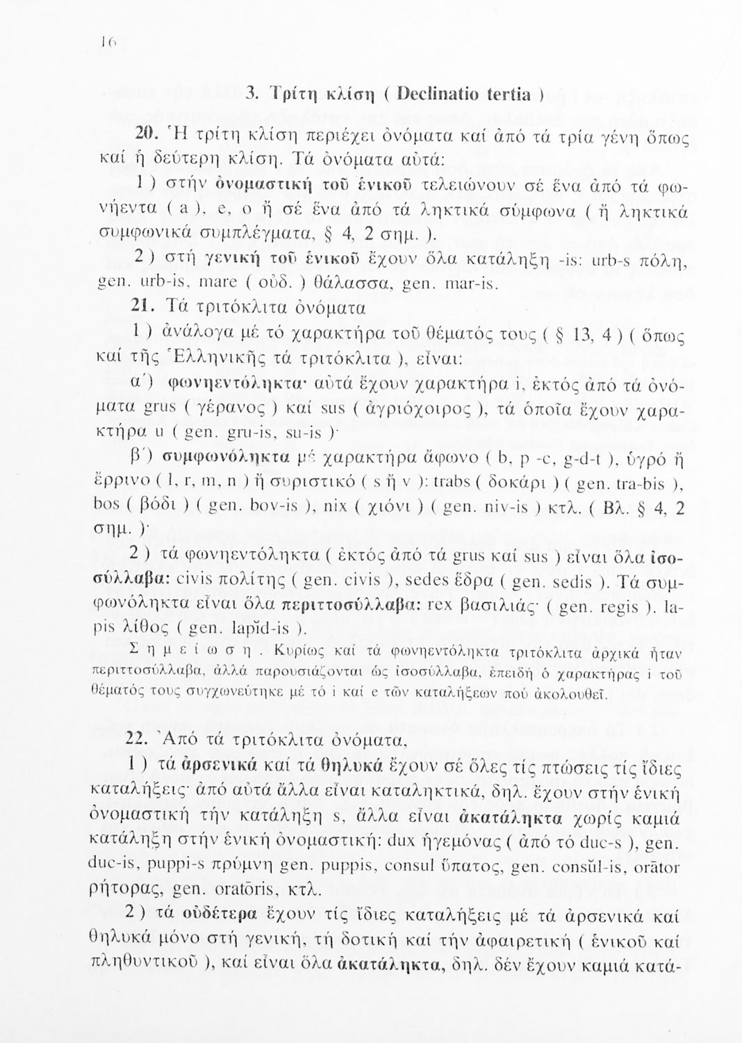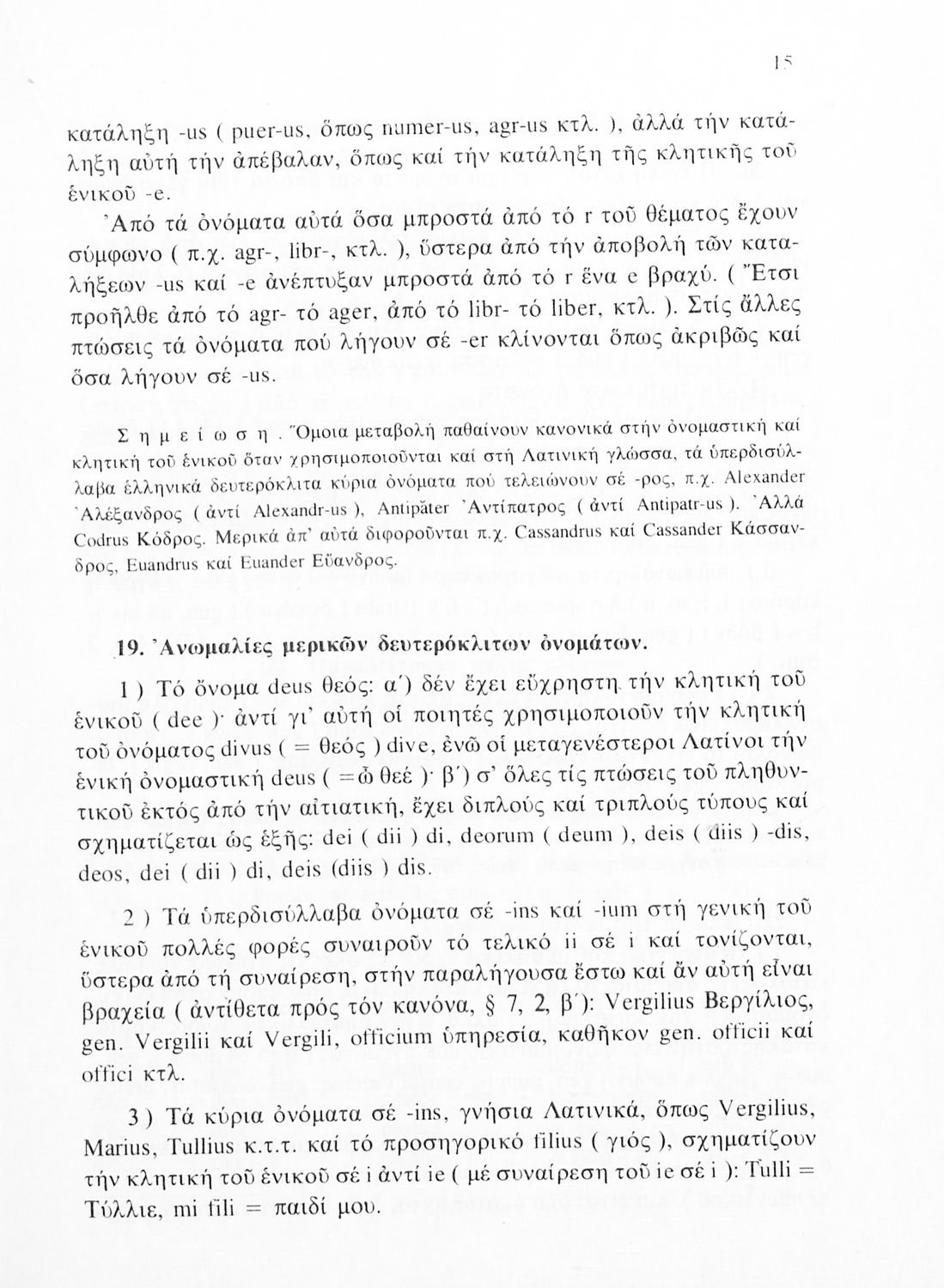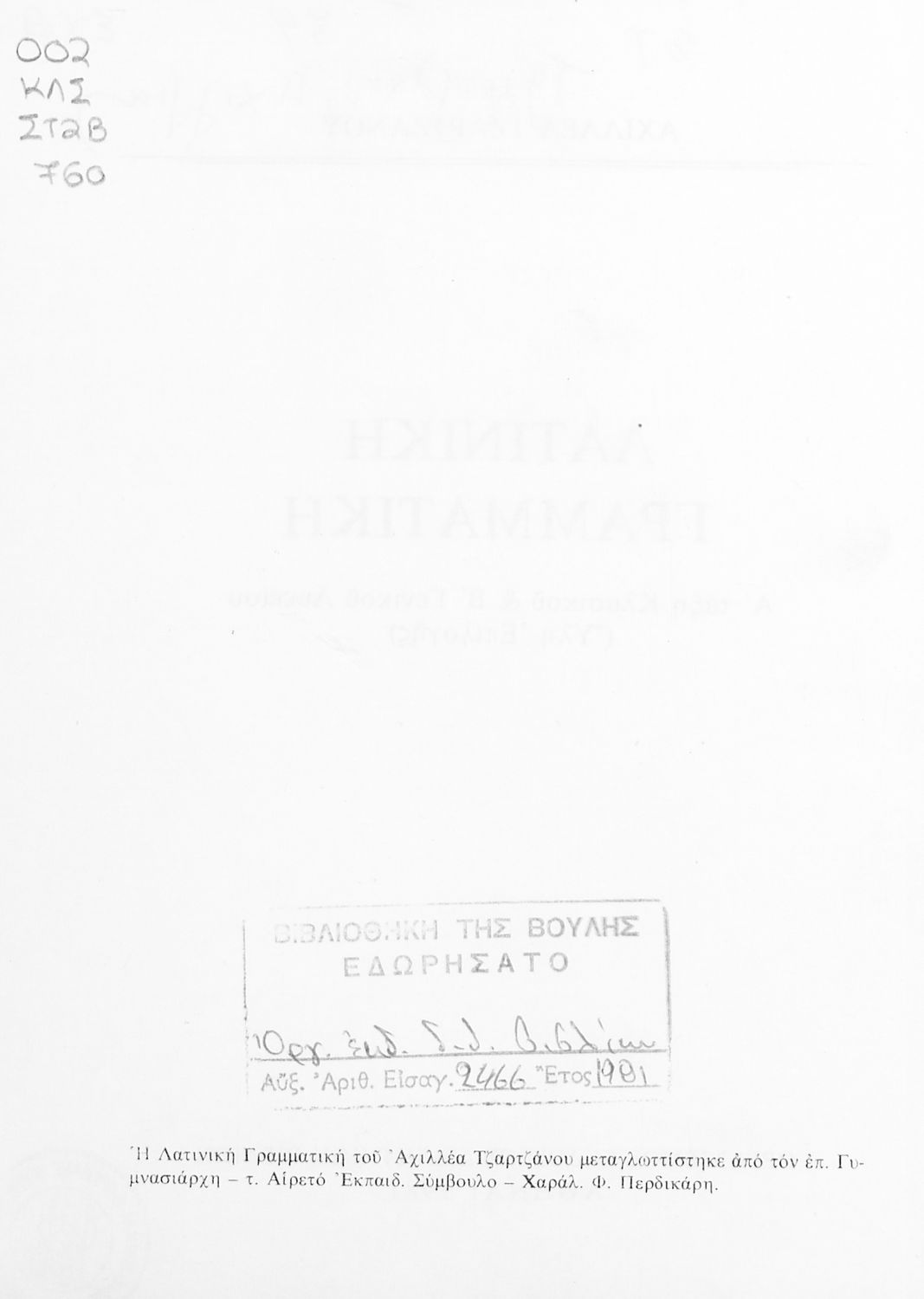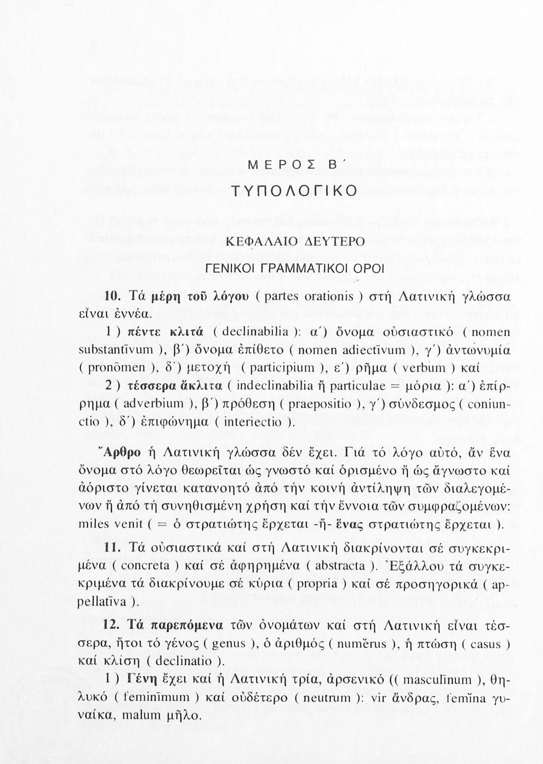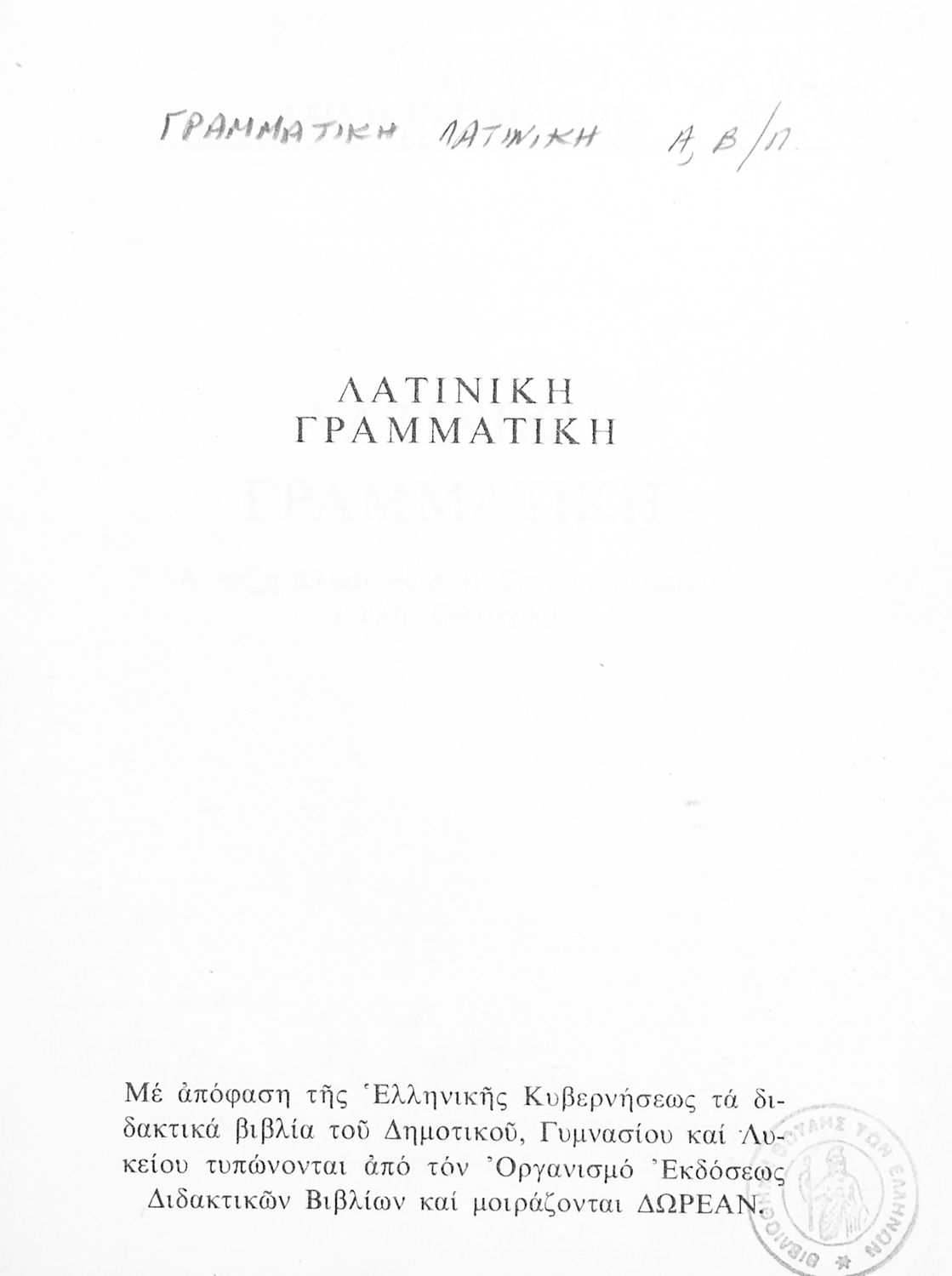 Βαθμίδα εκπαίδευσης: Δευτεροβάθμια Τάξη: Α΄ Κλασικού Λυκείου / Β΄ Γενικού Λυκείου Μάθημα: Λατινικά Γλώσσα: Καθαρεύουσα Παρουσίαση περιεχομένου: Σχολικό εγχειρίδιο Λατινικών Α' Κλασικού Λυκείου και Β' Γενικού Λυκείου που περιλαμβάνει τη γραμματική της λατινικής και είναι χωρισμένο στο φθογγολογικό, το τυπολογικό και το ετυμολογικό μέρος. Περιέχει και τους συντακτικούς κανόνες της λατινικής. |