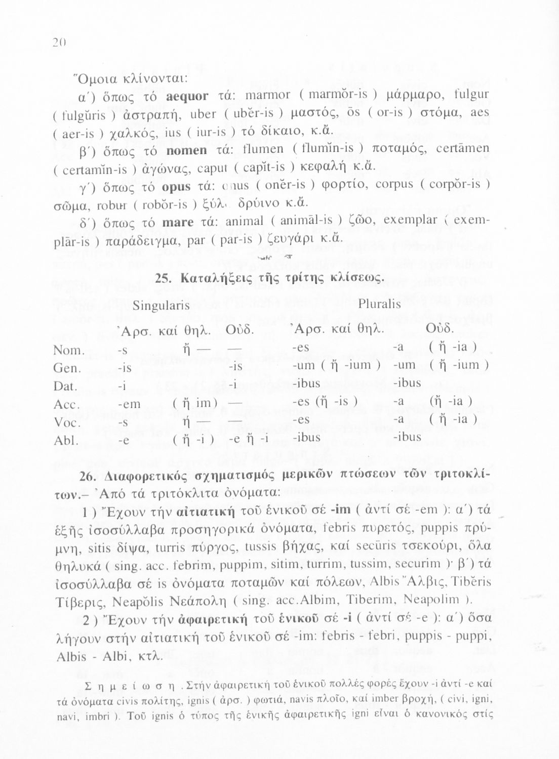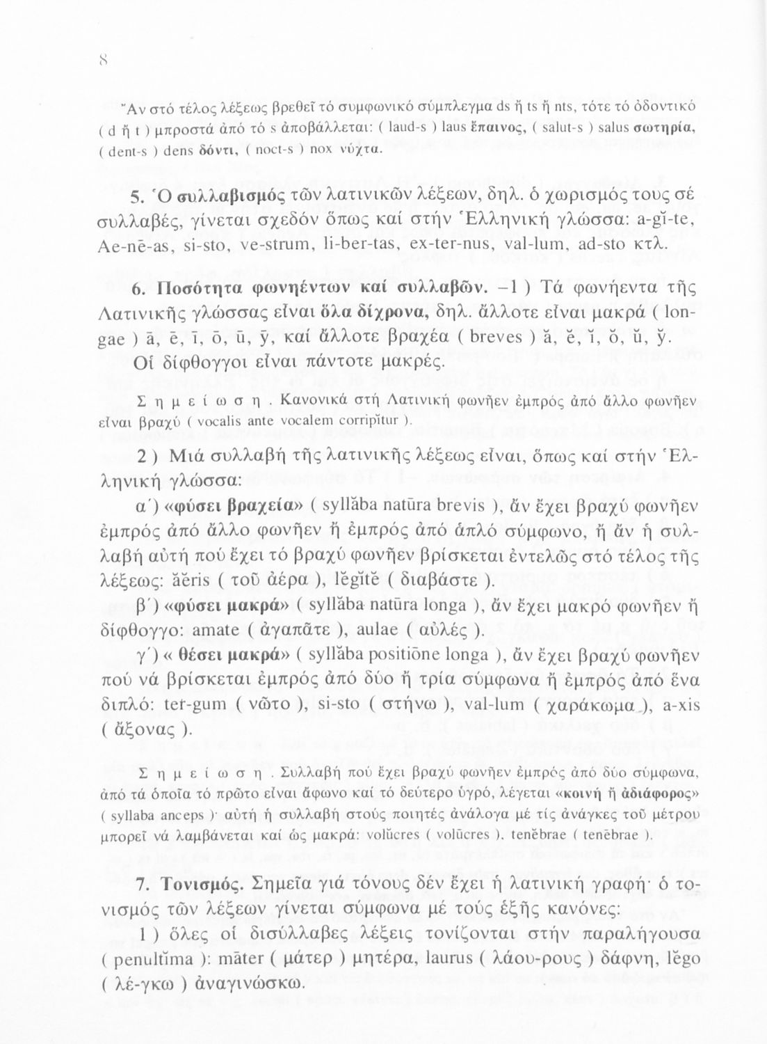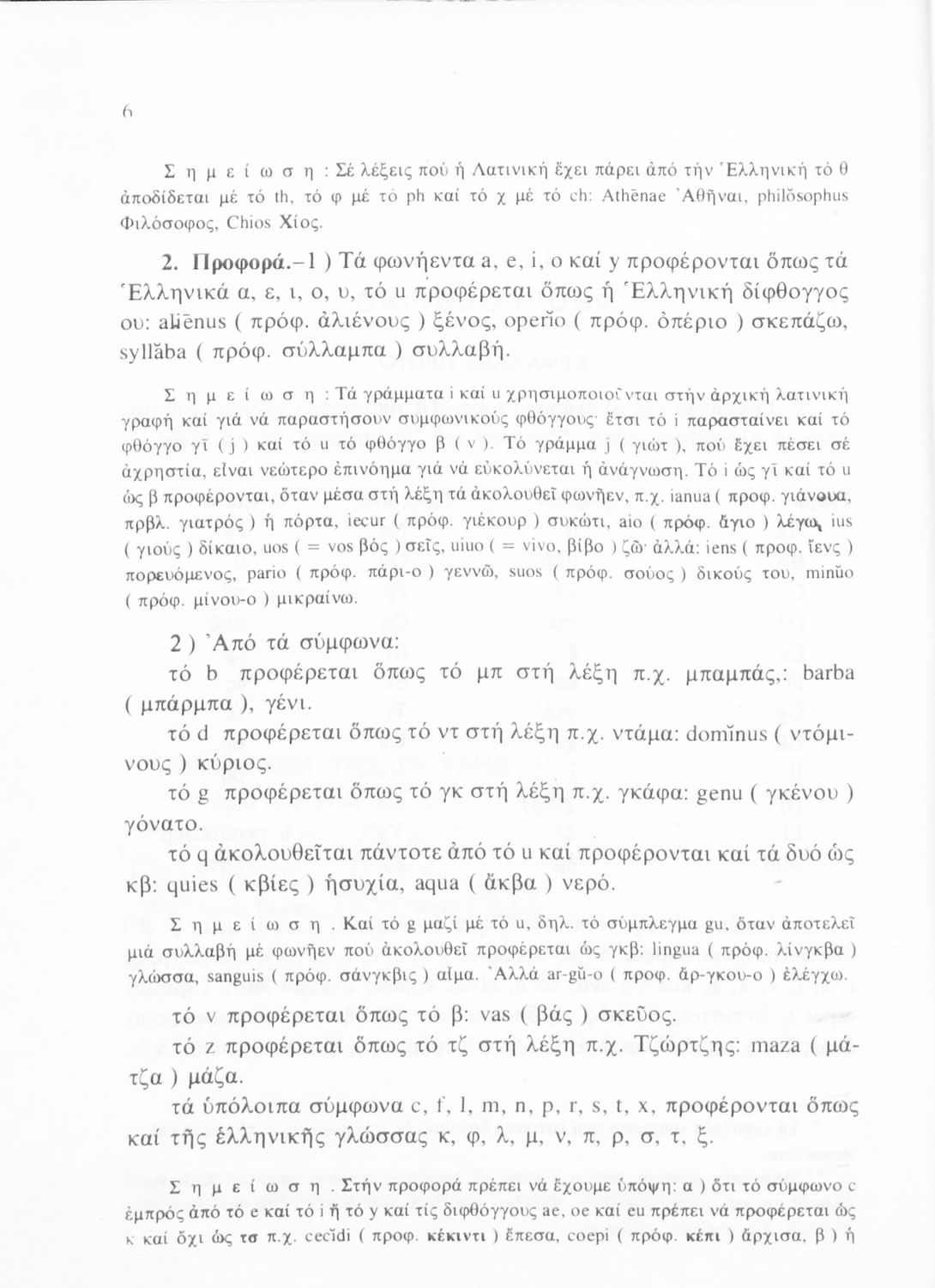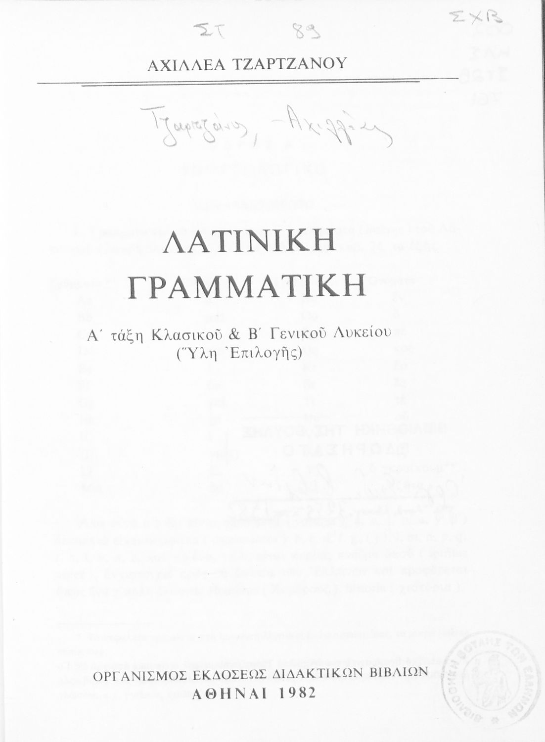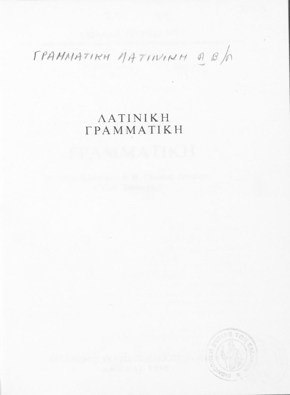 Σχολικό εγχειρίδιο Λατινικών Α΄, Β΄, Γ' Γυμνασίου που περιλαμβάνει γραμματική και συντακτικό και είναι χωρισμένο σε φθογγολογικό, τυπολογικό και ετυμολογικό μέρος.