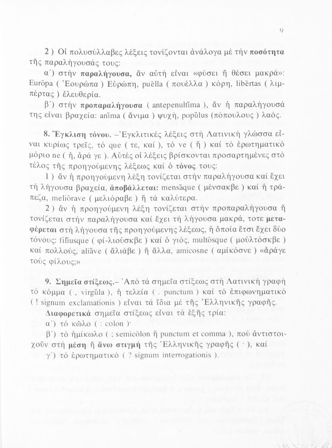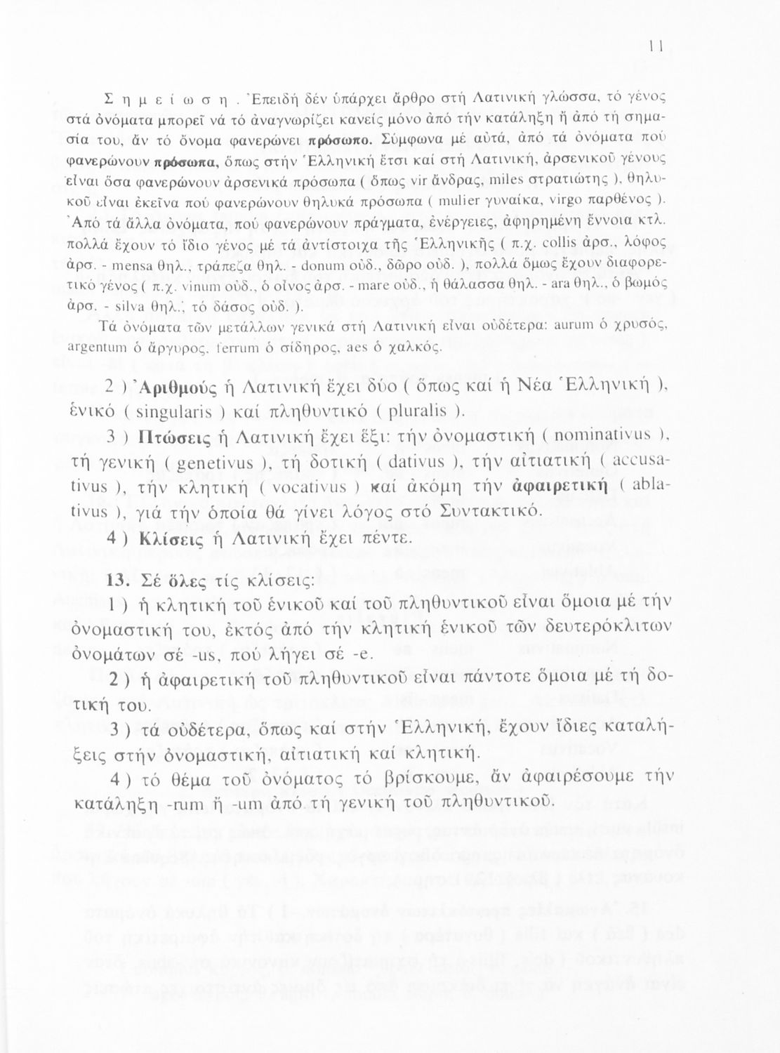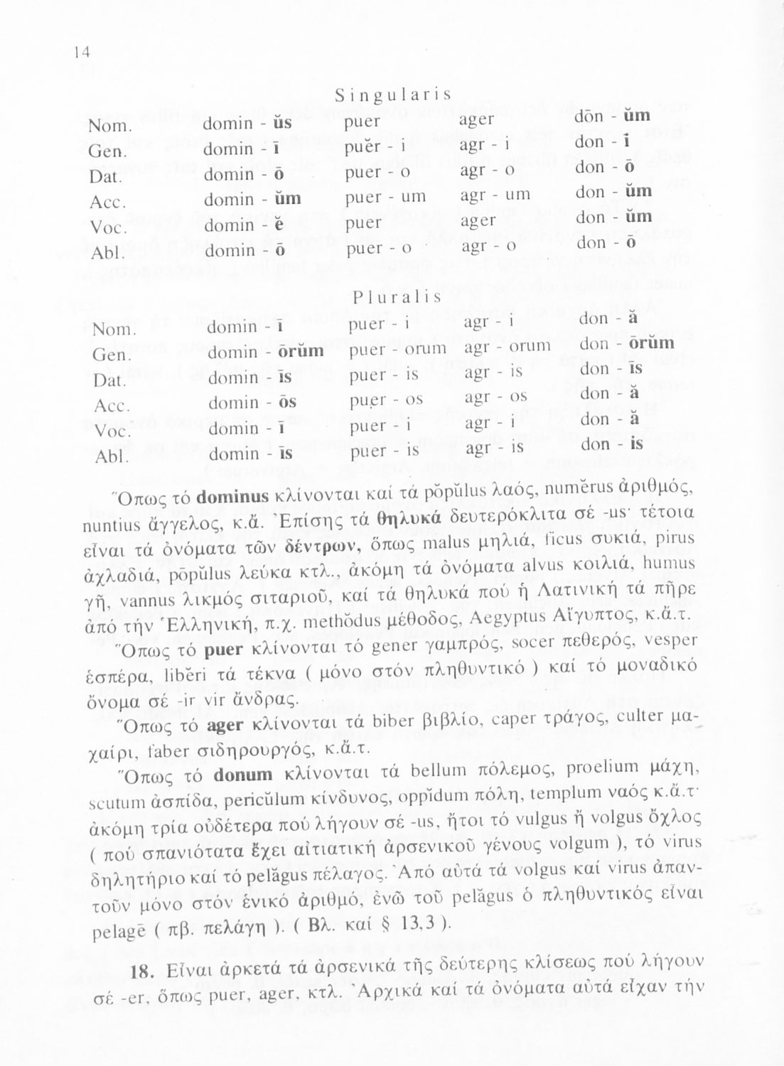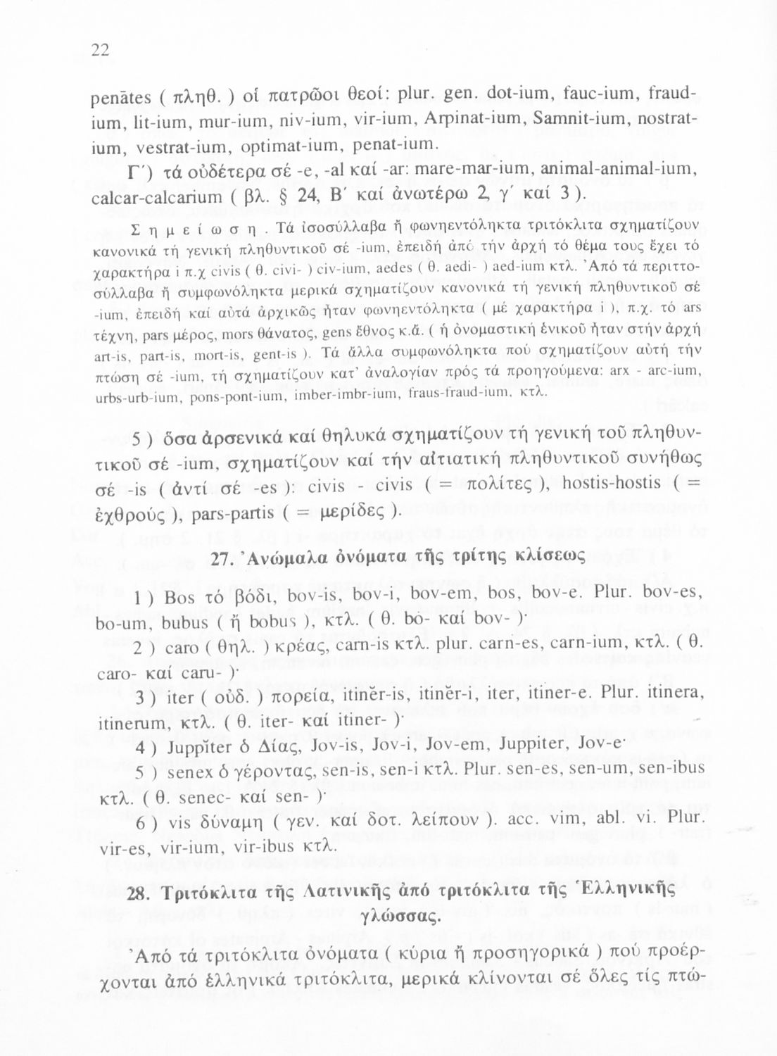Σχολικό εγχειρίδιο Λατινικών Α΄, Β΄, Γ' Γυμνασίου που περιλαμβάνει γραμματική και συντακτικό και είναι χωρισμένο σε φθογγολογικό, τυπολογικό και ετυμολογικό μέρος.