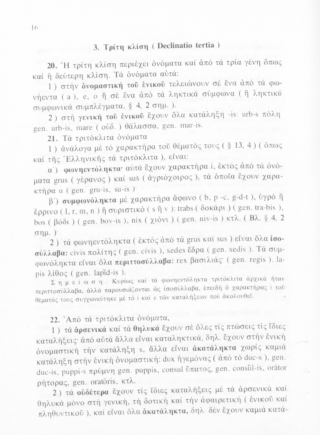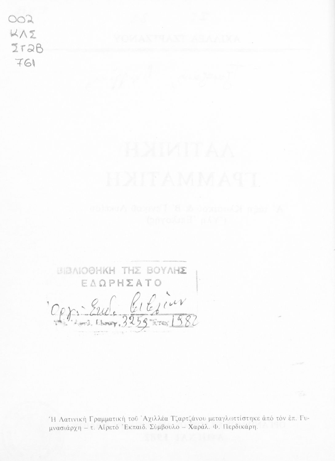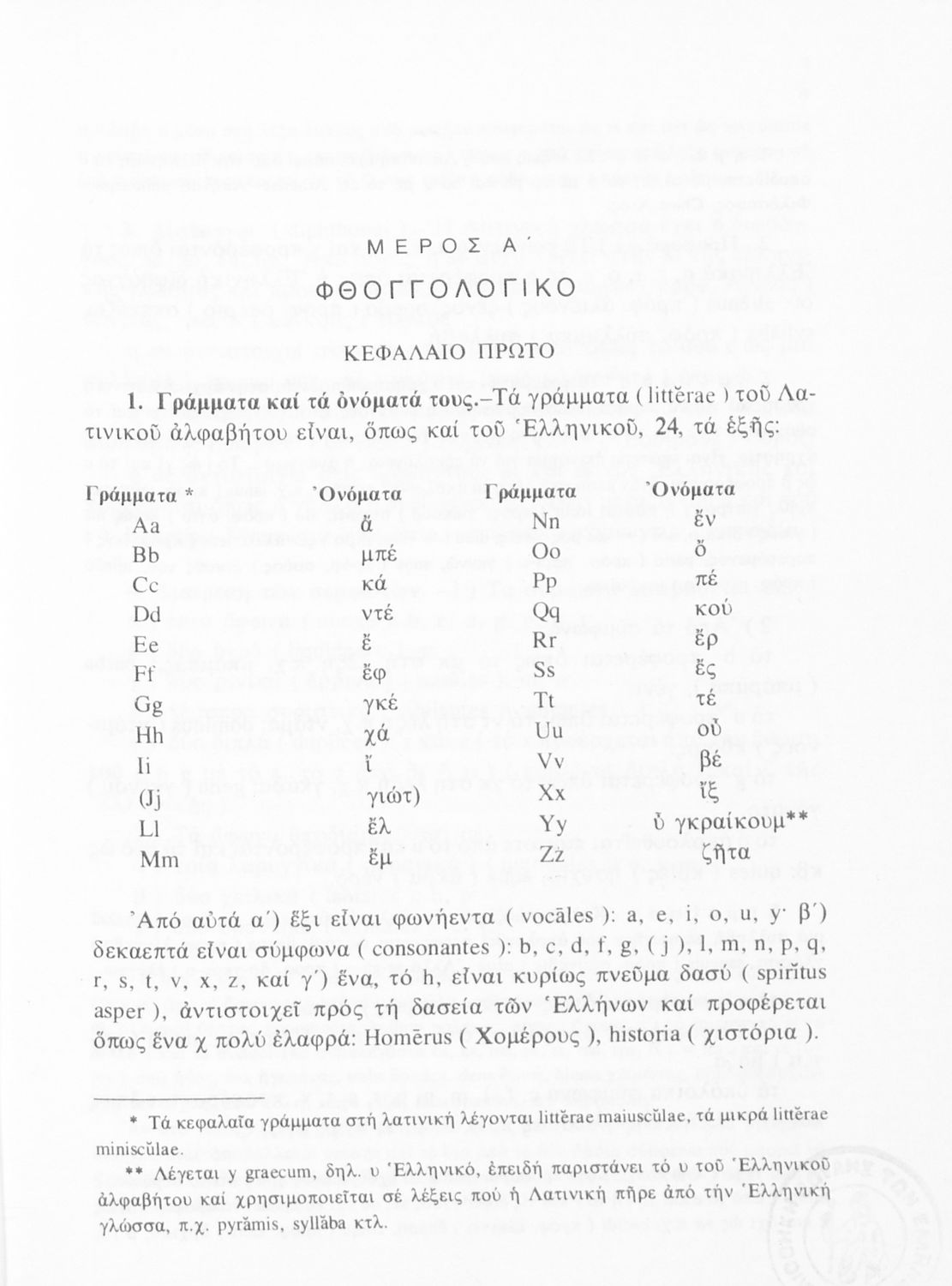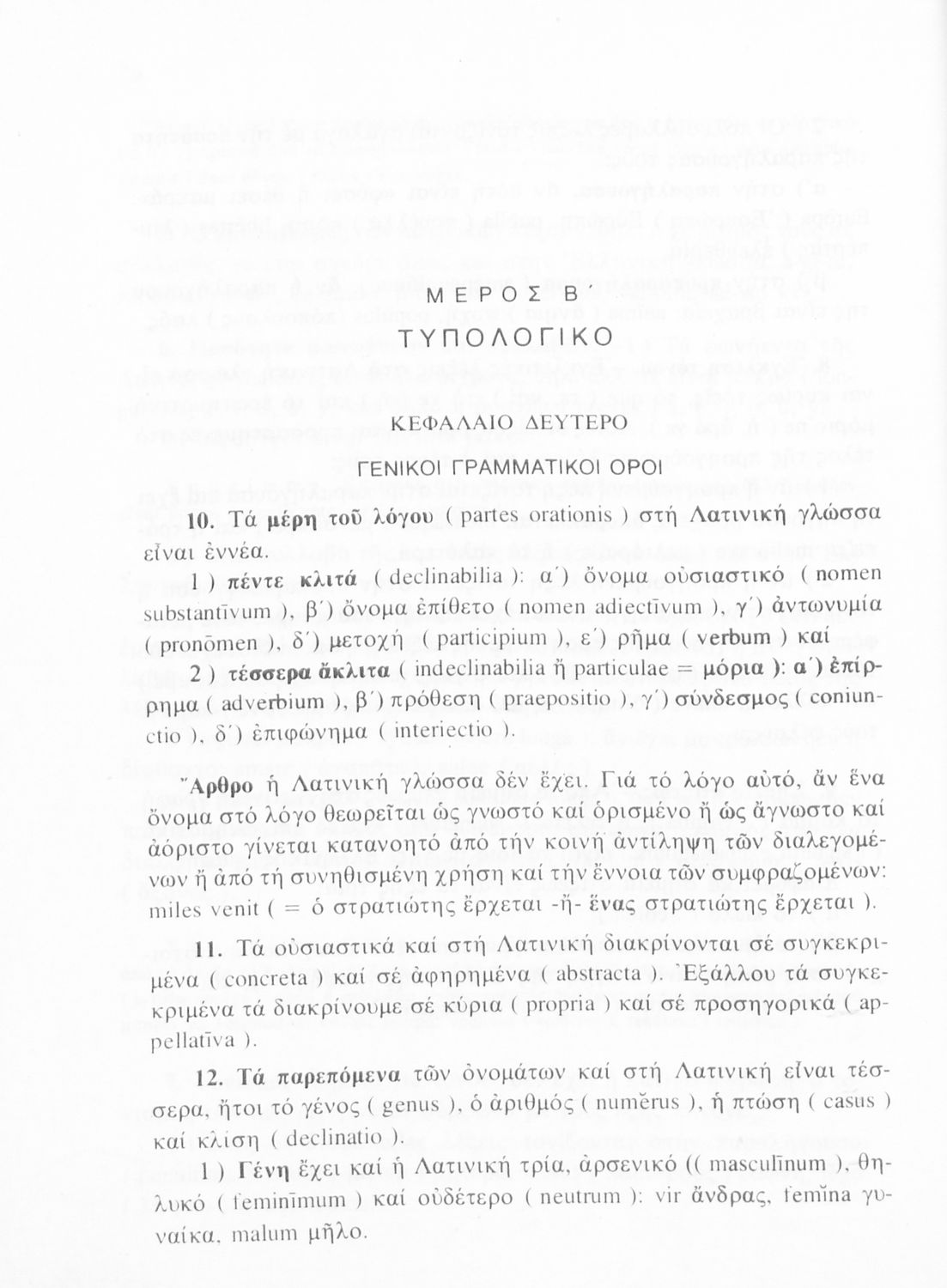Σχολικό εγχειρίδιο Λατινικών Α΄, Β΄ και Γ΄ Λυκείου που περιλαμβάνει γραμματική και συντακτικό και είναι χωρισμένο σε φθογγολογικό, τυπολογικό και ετυμολογικό μέρος.