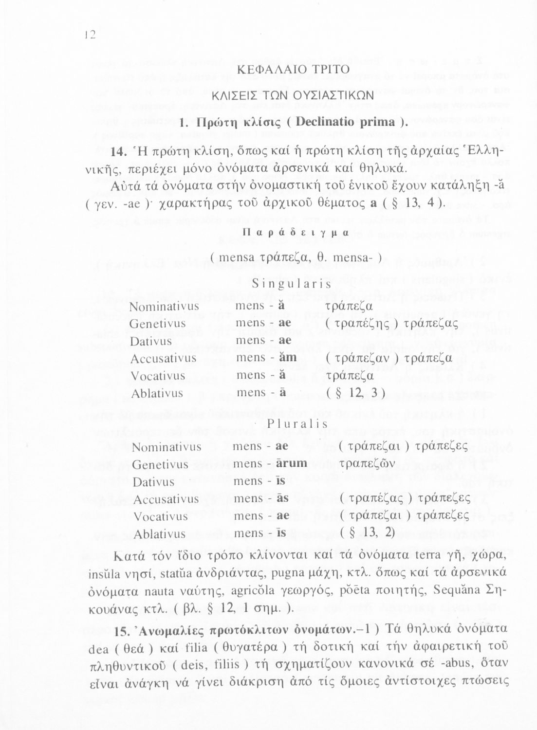 Σχολικό εγχειρίδιο Λατινικών Α' Κλασικού Λυκείου και Β' Γενικού Λυκείου που περιλαμβάνει τη γραμματική της λατινικής και είναι χωρισμένο στο φθογγολογικό, το τυπολογικό και το ετυμολογικό μέρος. Περιέχει και τους συντακτικούς κανόνες της λατινικής.