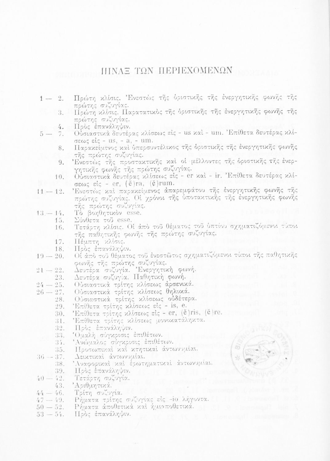 Σχολικό εγχειρίδιο Λατινικών Α΄, Β΄ και Γ΄ Λυκείου που περιλαμβάνει γραμματική και συντακτικό και είναι χωρισμένο σε φθογγολογικό, τυπολογικό και ετυμολογικό μέρος.