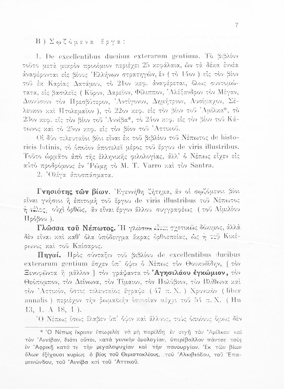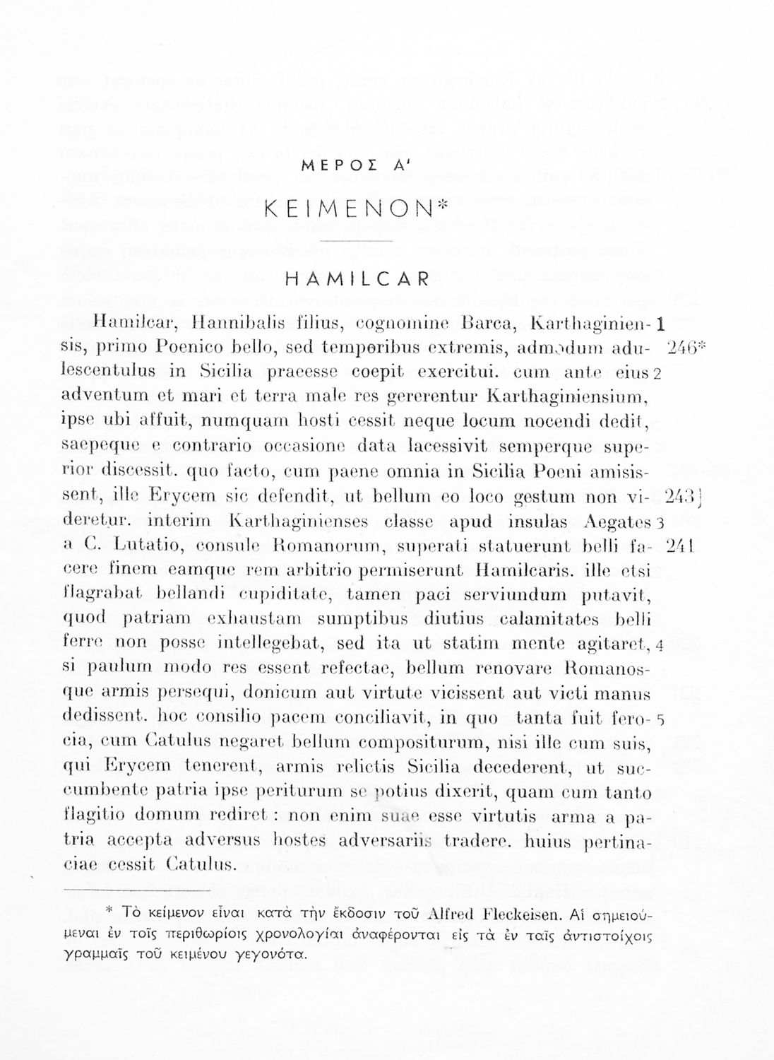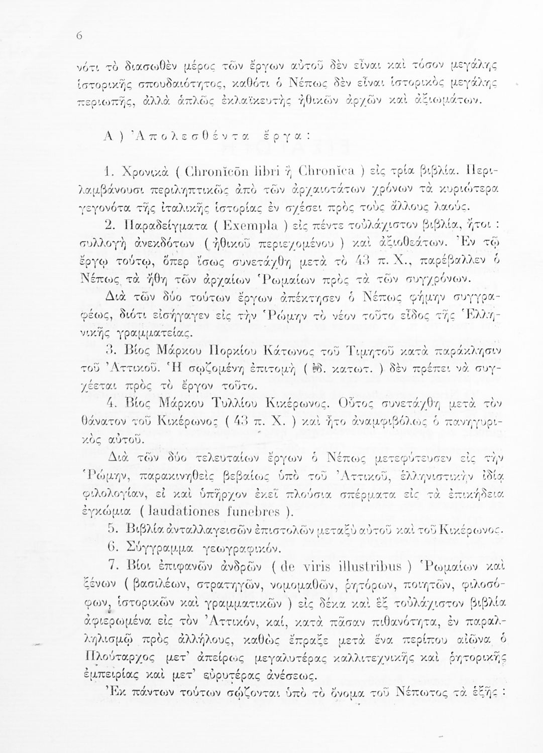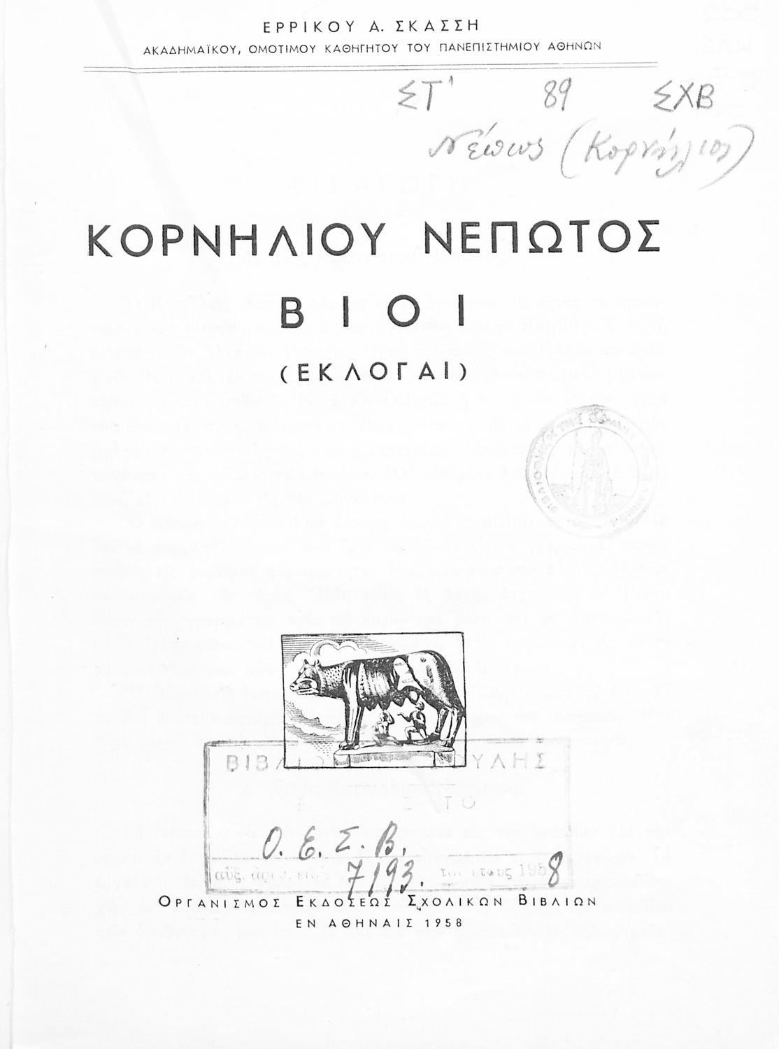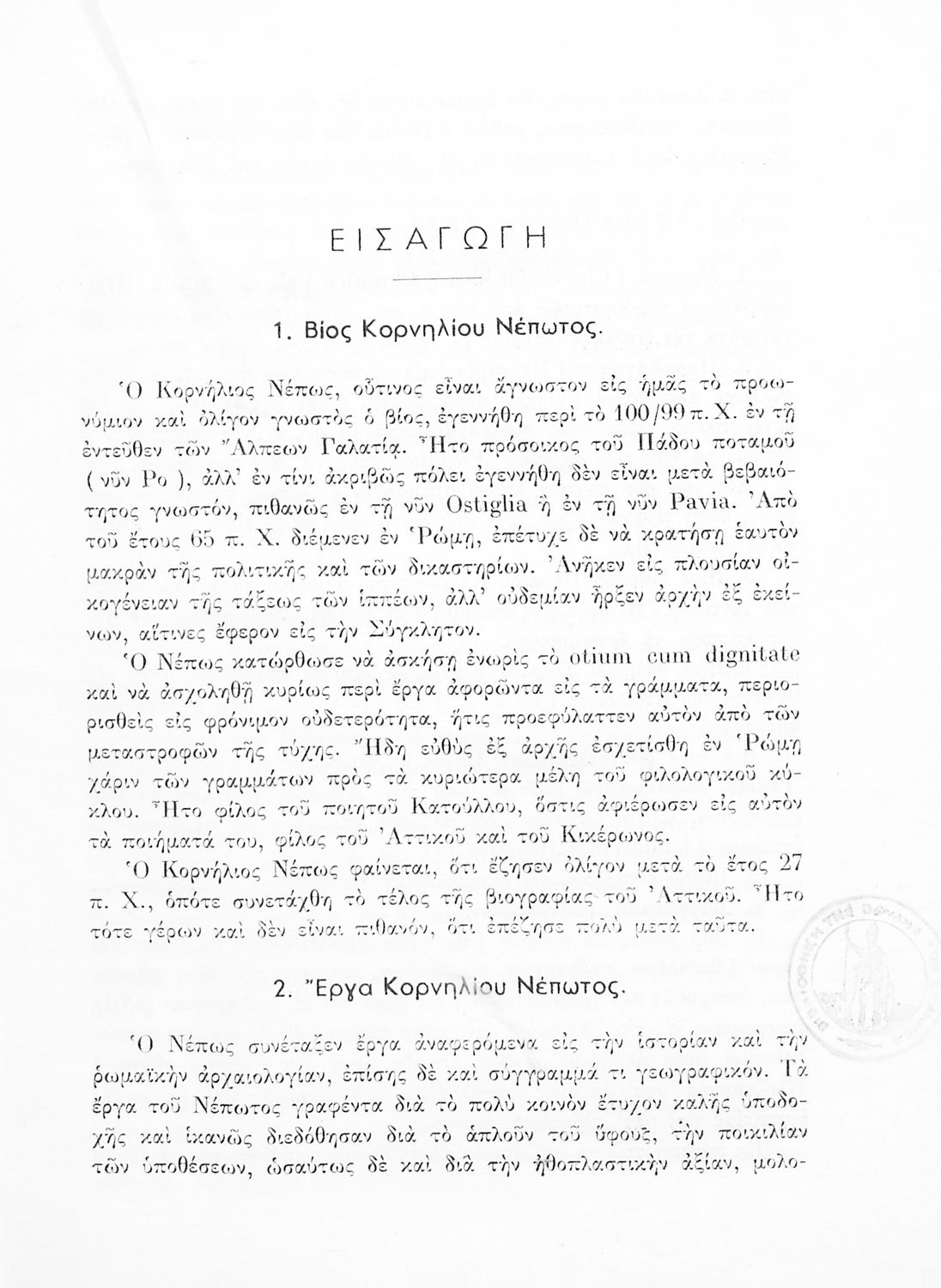Σχολικό εγχειρίδιο Λατινικών που περιέχει σύντομο βιογραφικό σημείωμα του Νέπωτα, αποσπάσματα από τα έργα Αμίλκας, Αννίβας, Κάτων και Αττικός, ιστορικό και γεωγραφικό πίνακα και λεξιλόγιο. Ο συγγραφέας ήταν καθηγητής της Λατινικής Φιλολογίας στο Πανεπιστήμιο Αθηνών.