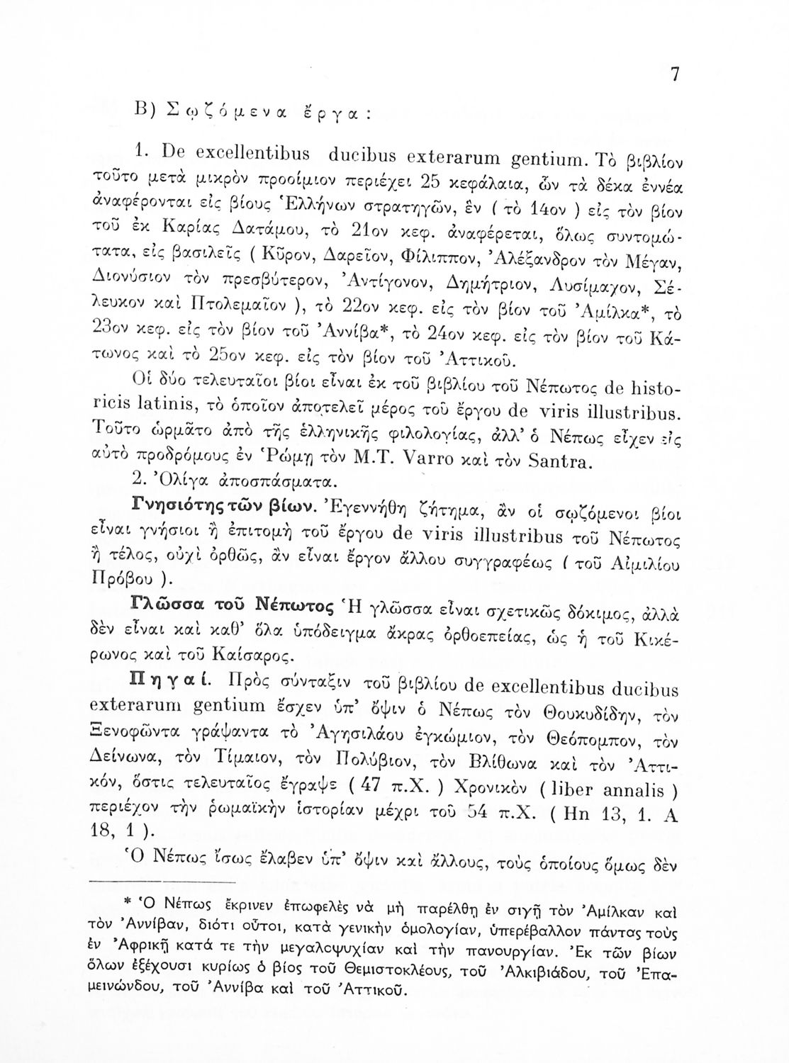 Σχολικό εγχειρίδιο Λατινικών που περιέχει σύντομο βιογραφικό σημείωμα του Νέπωτα, αποσπάσματα από τα έργα Αμίλκας, Αννίβας, Κάτων και Αττικός, ιστορικό και γεωγραφικό πίνακα και λεξιλόγιο. Ο συγγραφέας ήταν καθηγητής της Λατινικής Φιλολογίας στο Πανεπιστήμιο Αθηνών.