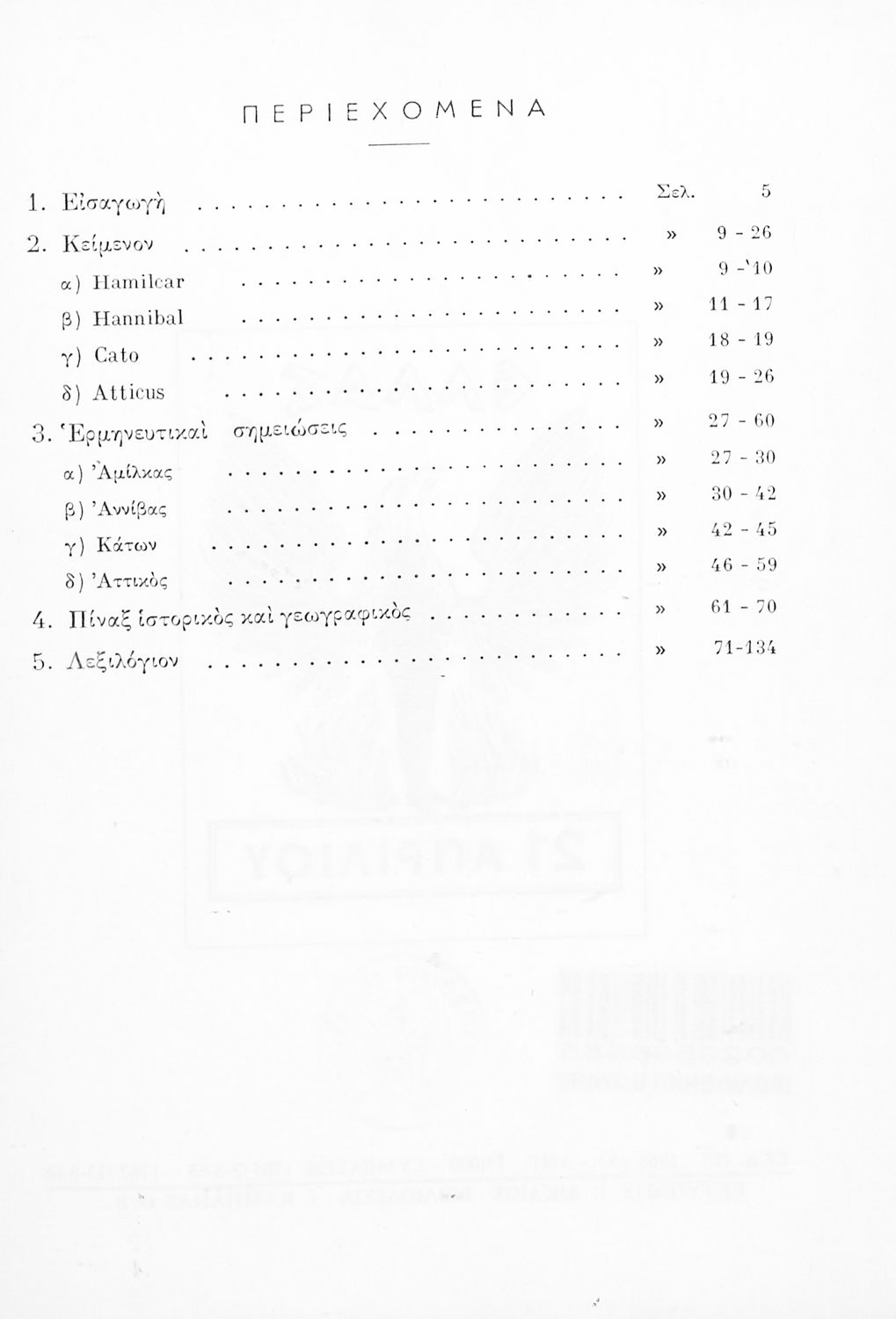 Σχολικό εγχειρίδιο Λατινικών που περιέχει σύντομο βιογραφικό σημείωμα του Νέπωτα, αποσπάσματα από τα έργα Αμίλκας, Αννίβας, Κάτων και Αττικός, ιστορικό και γεωγραφικό πίνακα και λεξιλόγιο. Ο συγγραφέας ήταν καθηγητής της Λατινικής Φιλολογίας στο Πανεπιστήμιο Αθηνών. Φέρει το σύμβολο της δικτατορίας.