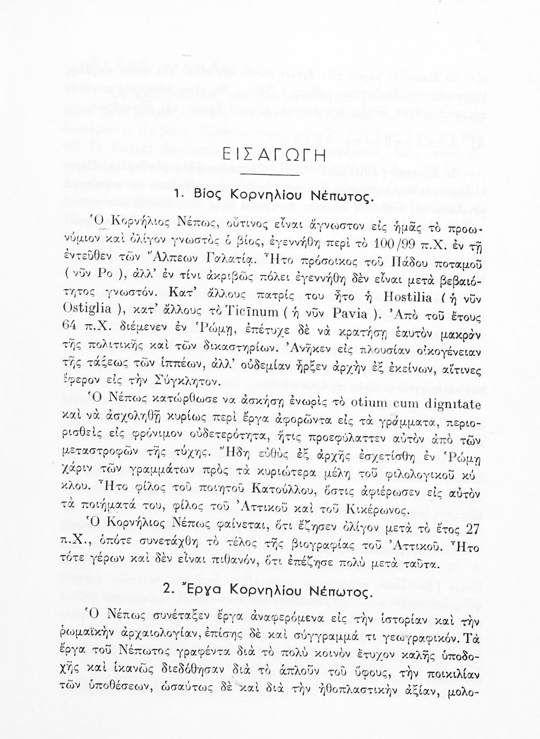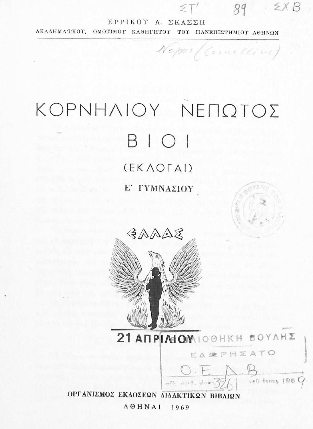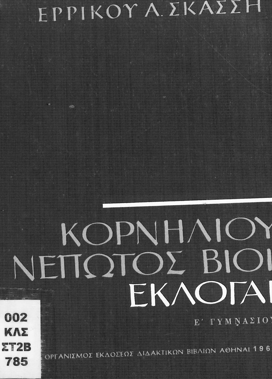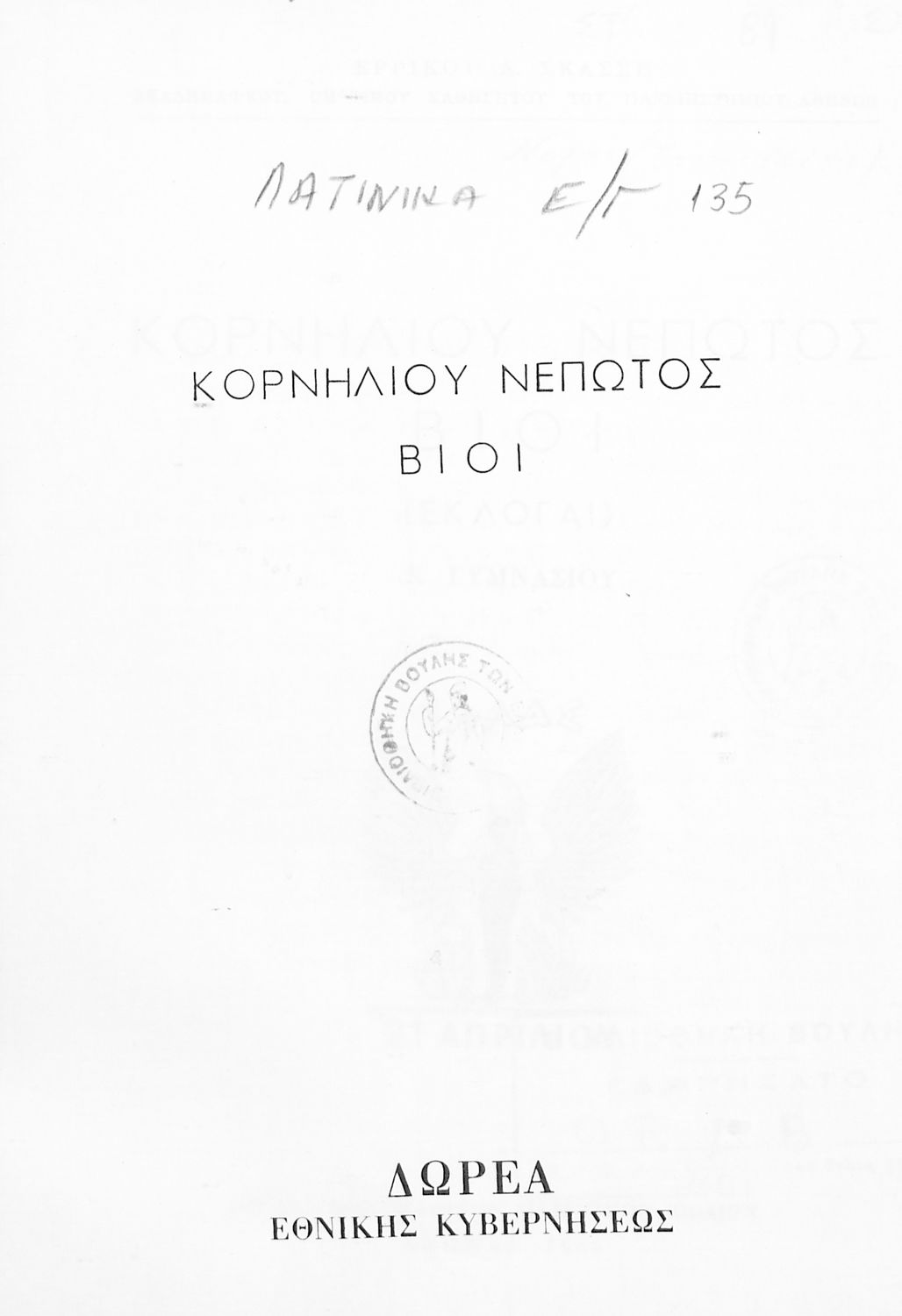 Σχολικό εγχειρίδιο Λατινικών Ε' Γυμνασίου που περιέχει σύντομο βιογραφικό σημείωμα του Νέπωτα, αποσπάσματα από τα έργα Αμίλκας, Αννίβας, Κάτων και Αττικός, ιστορικό και γεωγραφικό πίνακα και λεξιλόγιο. Ο συγγραφέας ήταν καθηγητής της Λατινικής Φιλολογίας στο Πανεπιστήμιο Αθηνών. Φέρει το σύμβολο της δικτατορίας.