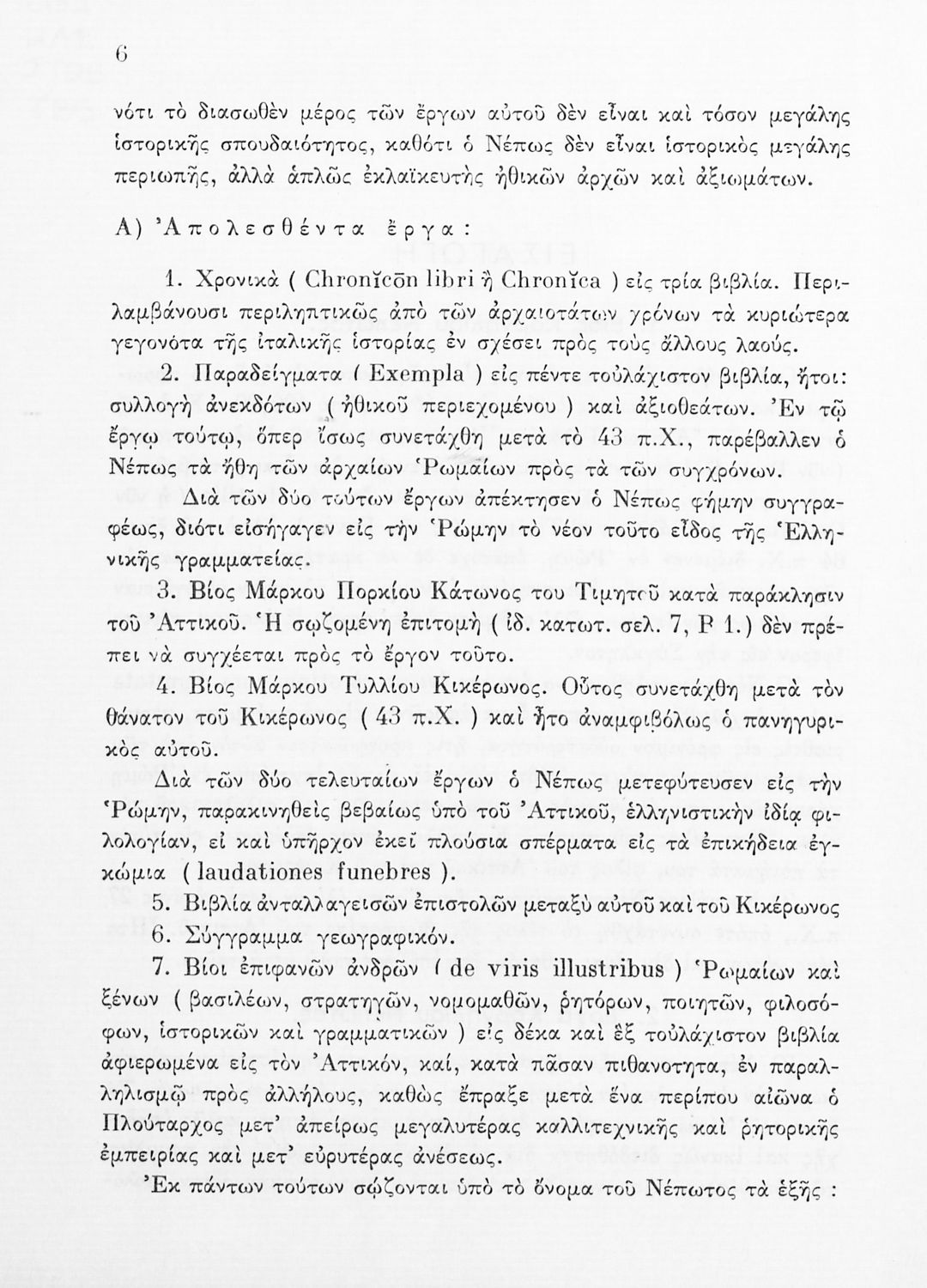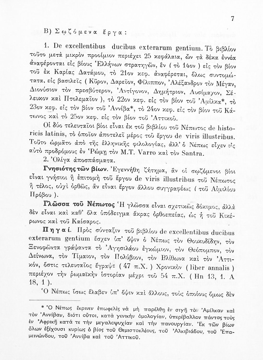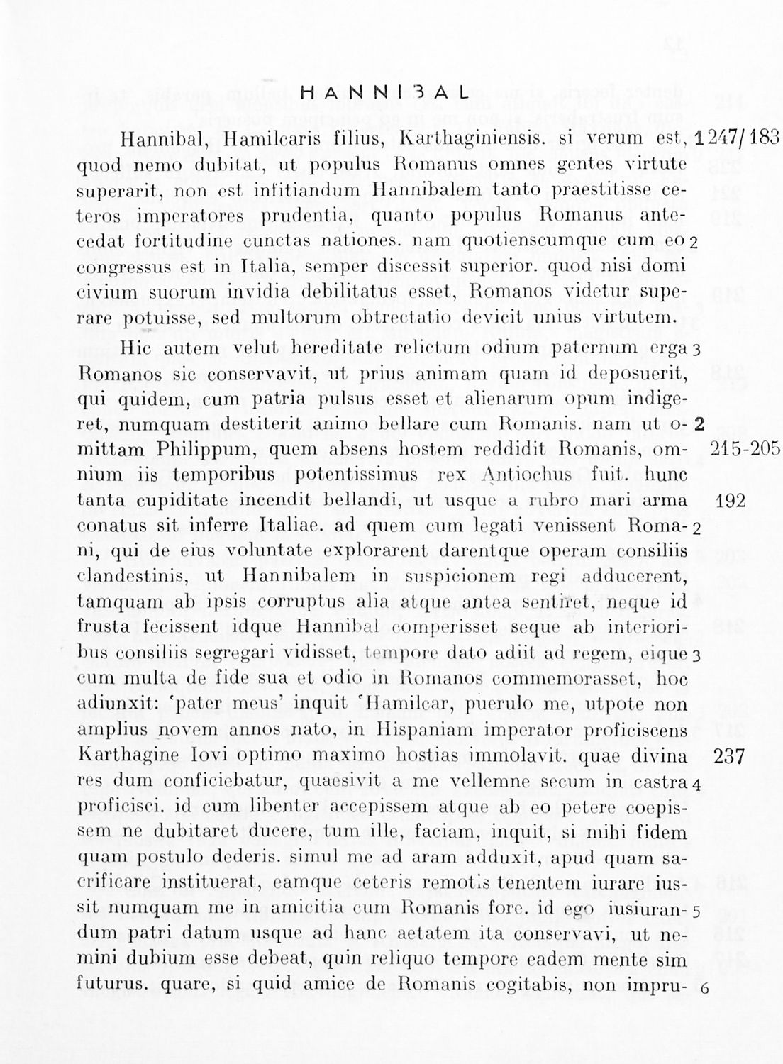 Σχολικό εγχειρίδιο Λατινικών Ε' Γυμνασίου που περιέχει σύντομο βιογραφικό σημείωμα του Νέπωτα, αποσπάσματα από τα έργα Αμίλκας, Αννίβας, Κάτων και Αττικός, ιστορικό και γεωγραφικό πίνακα και λεξιλόγιο. Ο συγγραφέας ήταν καθηγητής της Λατινικής Φιλολογίας στο Πανεπιστήμιο Αθηνών. Φέρει το σύμβολο της δικτατορίας.