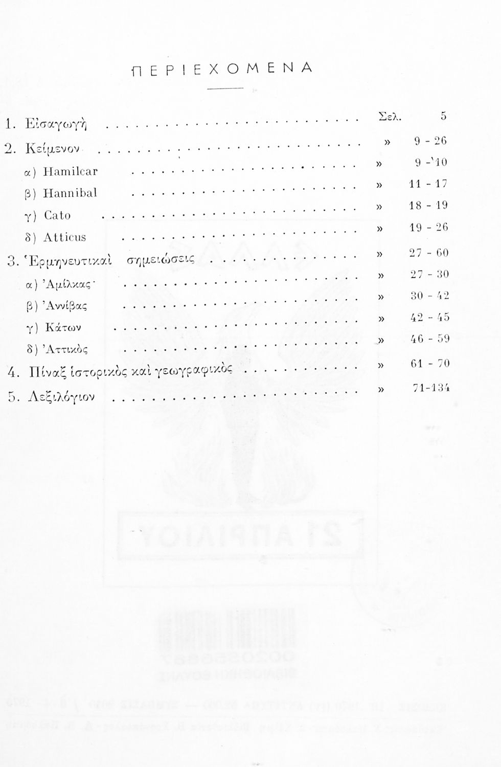 Σχολικό εγχειρίδιο Λατινικών Ε' Γυμνασίου που περιέχει σύντομο βιογραφικό σημείωμα του Νέπωτα, αποσπάσματα από τα έργα Αμίλκας, Αννίβας, Κάτων και Αττικός, ιστορικό και γεωγραφικό πίνακα και λεξιλόγιο. Ο συγγραφέας ήταν καθηγητής της Λατινικής Φιλολογίας στο Πανεπιστήμιο Αθηνών. Φέρει το σύμβολο της δικτατορίας.