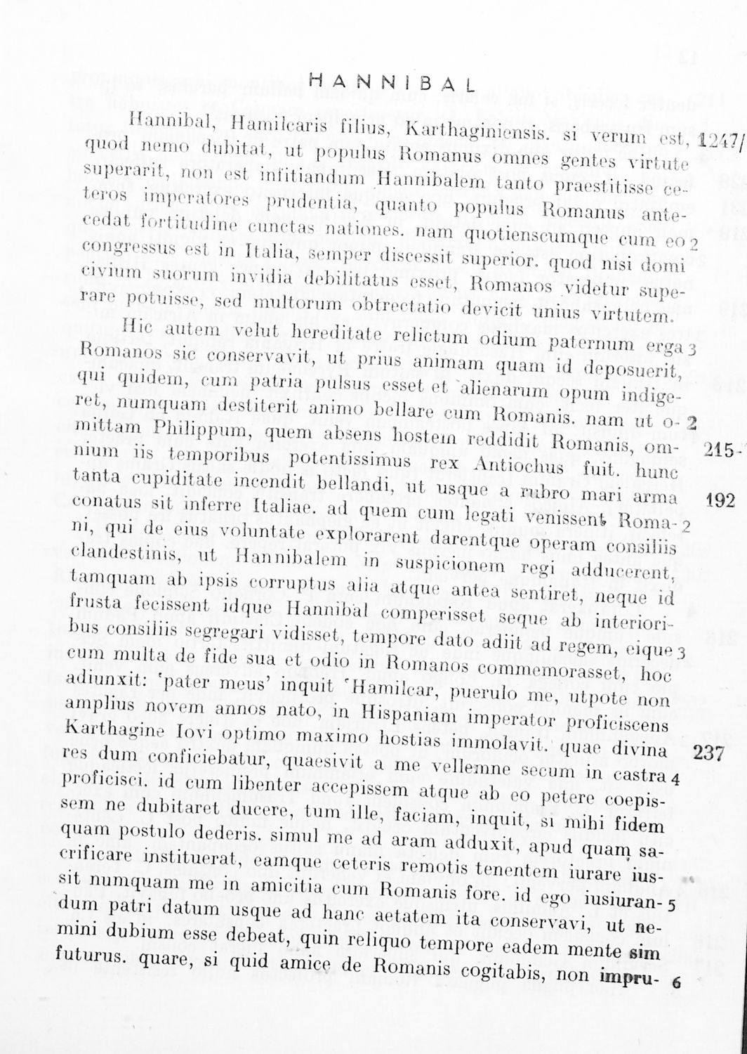 Σχολικό εγχειρίδιο Λατινικών Ε' Γυμνασίου που περιέχει σύντομο βιογραφικό σημείωμα του Νέπωτα, αποσπάσματα από τα έργα Αμίλκας, Αννίβας, Κάτων και Αττικός, ιστορικό και γεωγραφικό πίνακα και λεξιλόγιο. Ο συγγραφέας ήταν καθηγητής της Λατινικής Φιλολογίας στο Πανεπιστήμιο Αθηνών. Φέρει το σύμβολο της δικτατορίας.