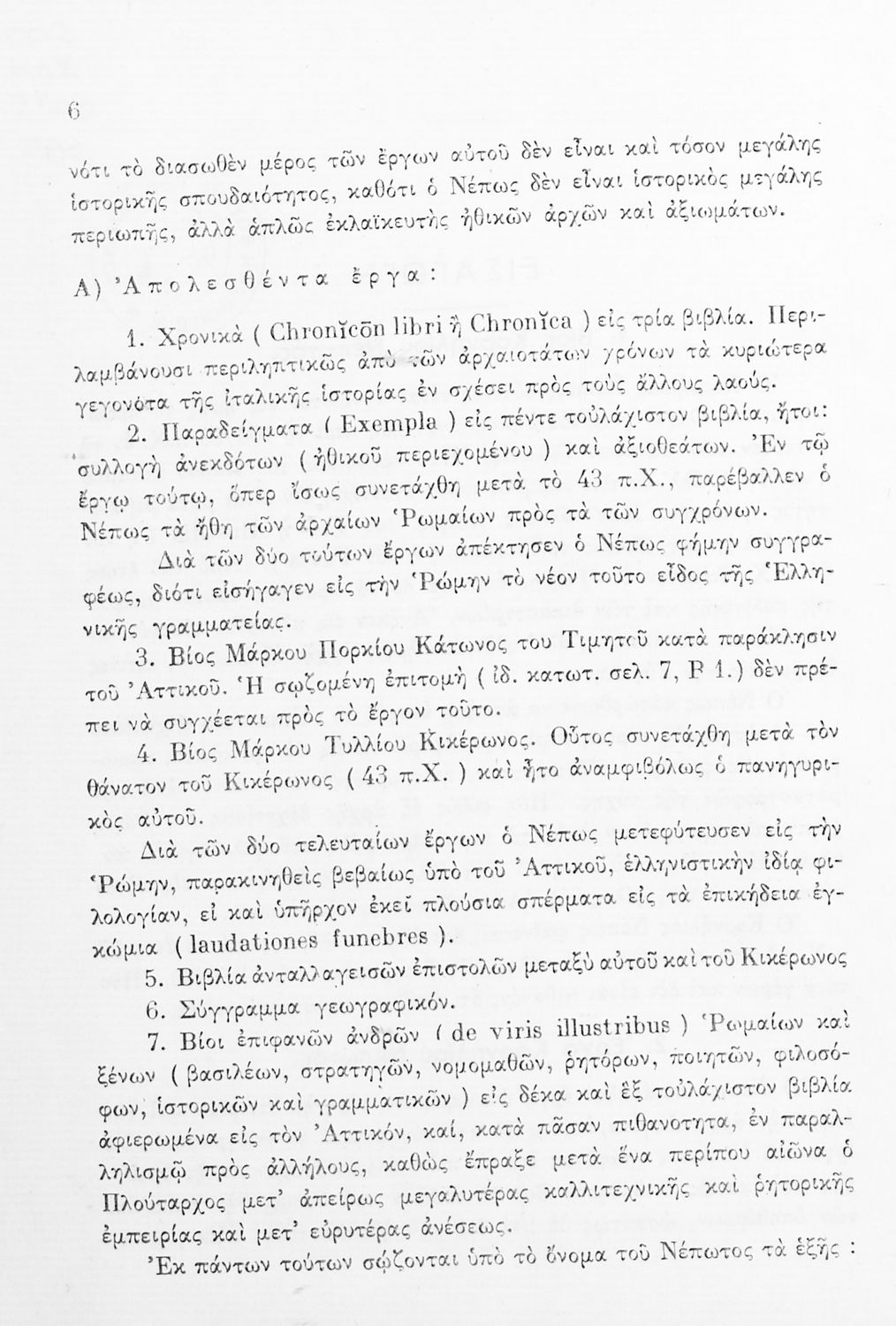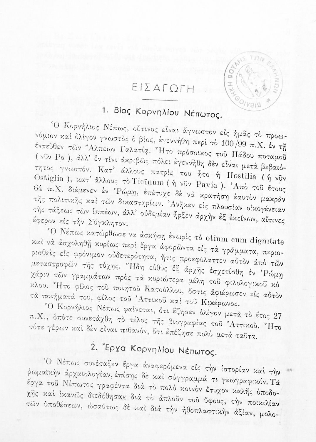 Σχολικό εγχειρίδιο Λατινικών για την Δ΄ Γυμνασίου παλαιού τύπου και την Ε΄ Γυμνασίου νέου τύπου που περιέχει σύντομο βιογραφικό σημείωμα του Νέπωτα, αποσπάσματα από τα έργα Αμίλκας, Αννίβας, Κάτων και Αττικός ...