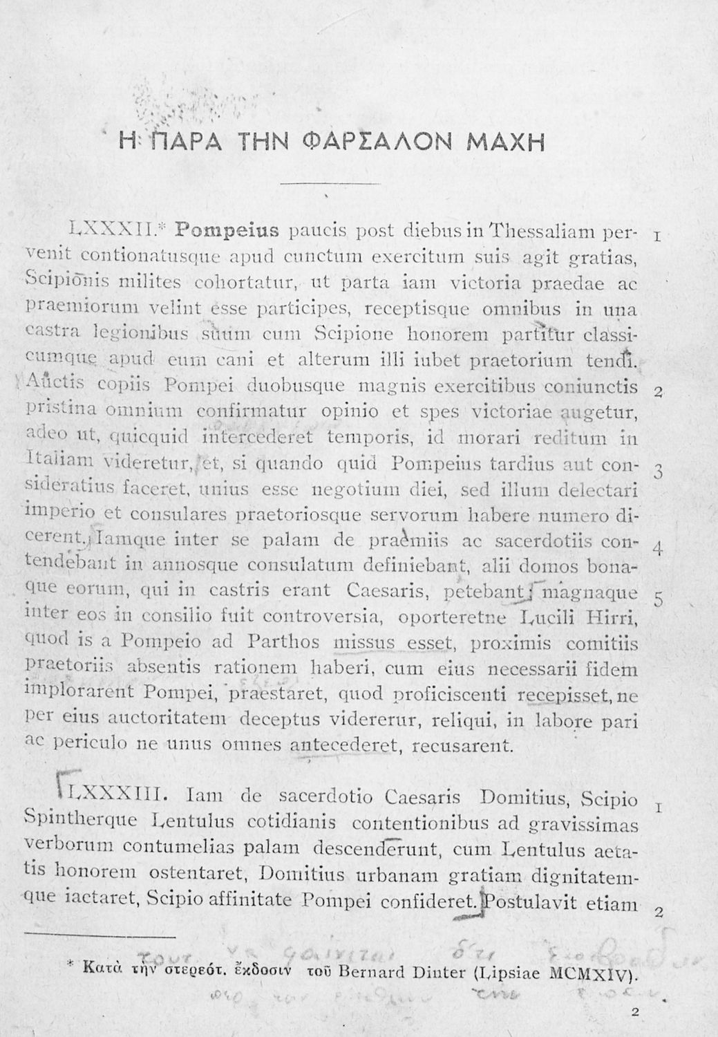 Σχολικό εγχειρίδιο Λατινικών για τη Β΄ Γυμνασίου που περιέχει αποσπάσματα από τα απομνημονεύματα του Ιούλιου Καίσαρα, σύντομο βιογραφικό σημείωμα, εισαγωγή στο έργο και πραγματολογικά και γλωσσικά σχόλια.