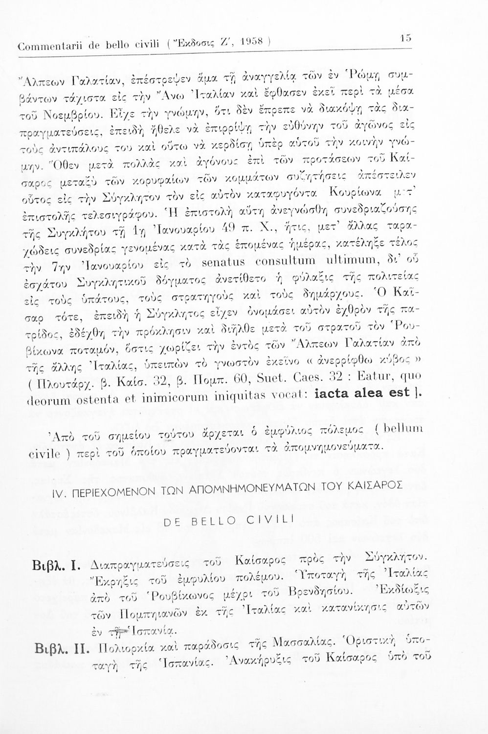 Σχολικό εγχειρίδιο Λατινικών που περιέχει αποσπάσματα από τα απομνημονεύματα του Ιούλιου Καίσαρα, σύντομο βιογραφικό σημείωμα, εισαγωγή στο έργο και πραγματολογικά και γλωσσικά σχόλια. Ο συγγραφέας ήταν καθηγητής της Λατινικής Φιλολογίας στο Πανεπιστήμιο Αθηνών.