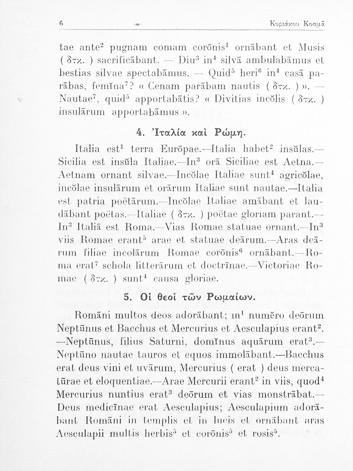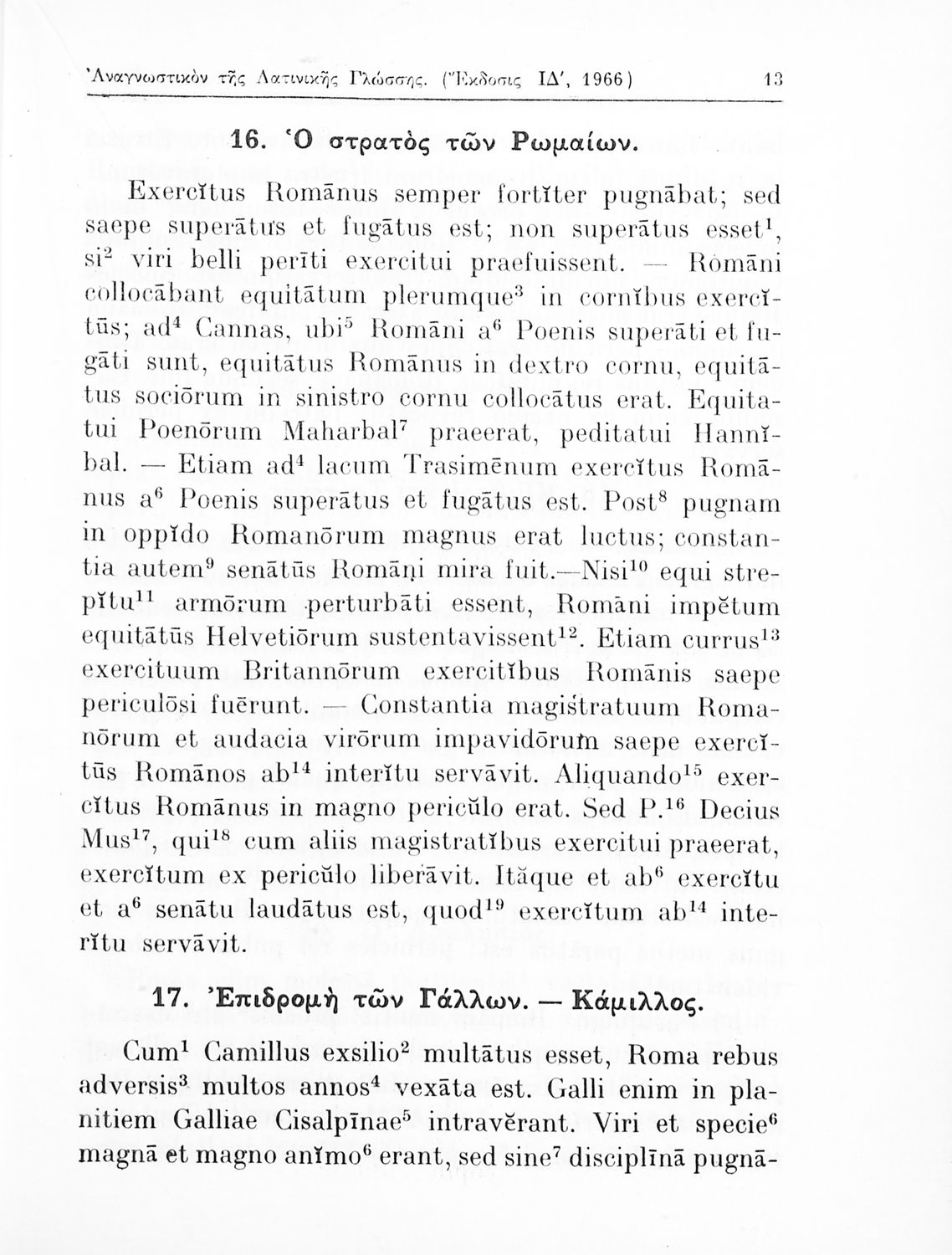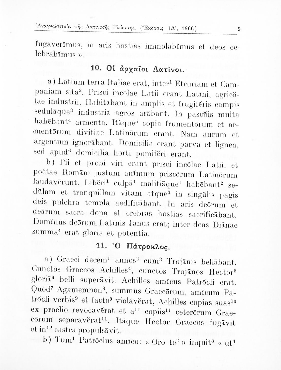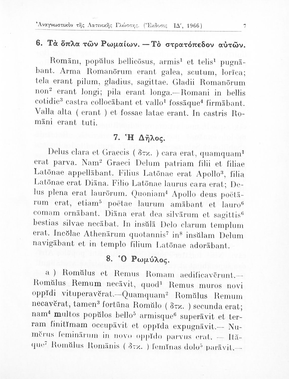 Βαθμίδα εκπαίδευσης: Δευτεροβάθμια Μάθημα: Λατινικά Γλώσσα: Απλή καθαρεύουσα Παρουσίαση περιεχομένου: Σχολικό εγχειρίδιο Λατινικών Β΄ Λυκείου που περιέχει κείμενα προσαρμοσμένα στη διδασκαλία των γραμματικών και συντακτικών φαινομένων, αποσπάσματα από το έργο του Lhomond De viris illustribus urbis Romae, ερμηνευτικές παρατηρήσεις και λεξιλόγιο. |
