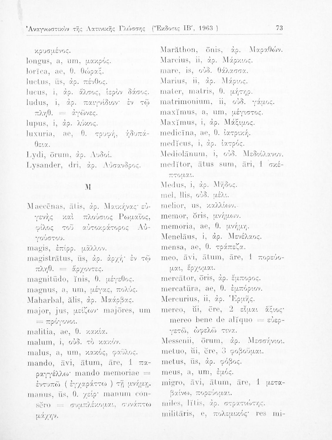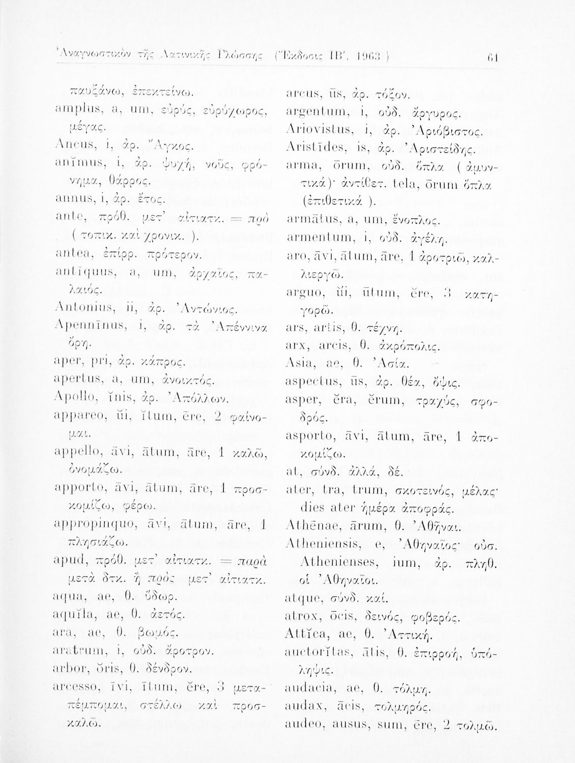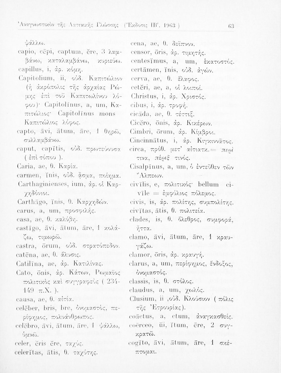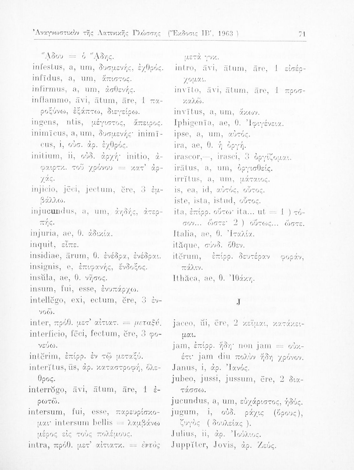 Σχολικό εγχειρίδιο Λατινικών για τη Γ΄ Γυμνασίου που περιέχει 54 κείμενα/περικοπές στα λατινικά, ερμηνευτικά υπομνήματα, λεξιλόγιο και κατάλογο με τα συντακτικά φαινόμενα (αφαιρετική, προθέσεις, σύνδεσμοι) που