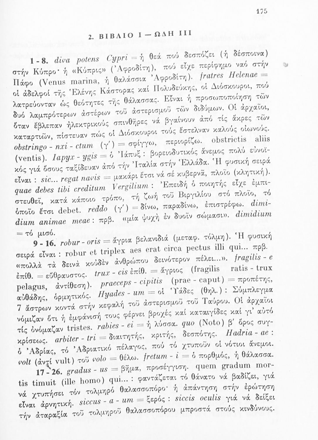 520 ## _aΣχολικό εγχειρίδιο Λατινικών Γ΄ Λυκείου που περιέχει αποσπάσματα από την Αινειάδα του Βιργίλιου, τον Ενύπνιο Σκιπίωνα του Κικέρωνα και τις Ωδές του Οράτιου, βιογραφικά σημειώματα των συγγραφέων, εισαγωγικά σχόλια, και ερμηνευτικές παρατηρήσεις.