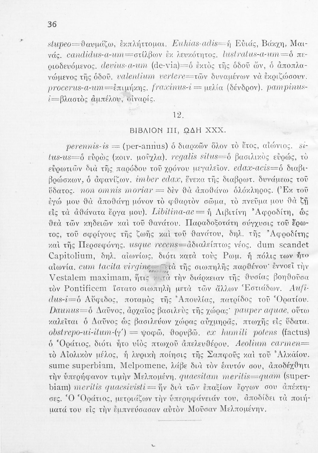 Βαθμίδα εκπαίδευσης: Δευτεροβάθμια Τάξη: ΣΤ' Γυμνασίου Μάθημα: Λατινικά Γλώσσα: Απλή καθαρεύουσα Παρουσίαση περιεχομένου: Σχολικό εγχειρίδιο Λατινικών της ΣΤ ' τάξις Γυμνασίων παλαιού τύπου. Το βιβλίο περιέχει επιλογές από το έργο του Οράτιου, Ωδαί. Αρχίζει με μια εισαγωγή για τη ζωή και το έργο του Οράτιου. Στο δεύτερο μέρος παραθέτει το κείμενο στο πρωτότυπο. Τέλος, περιλαμβάνει ερμηνευτικές σημειώσεις επί του κειμένου. |