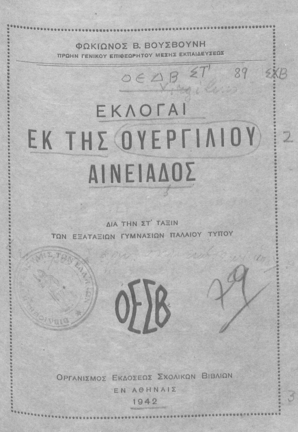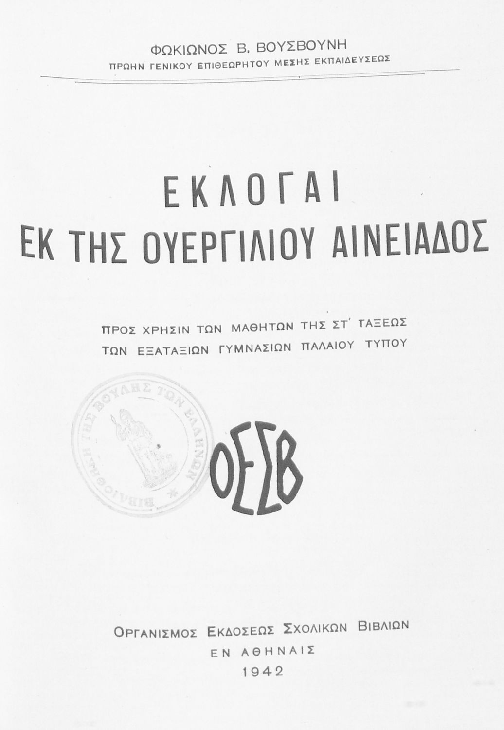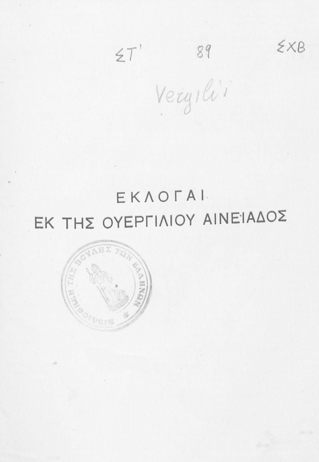 Τίτλος: Εκλογαί εκ της Ουεργιλίου Αινειάδος προς χρήσιν των μαθητών της ΣΤ΄ τάξεως των Εξαταξίων Γυμνασίων παλαιού τύπου
