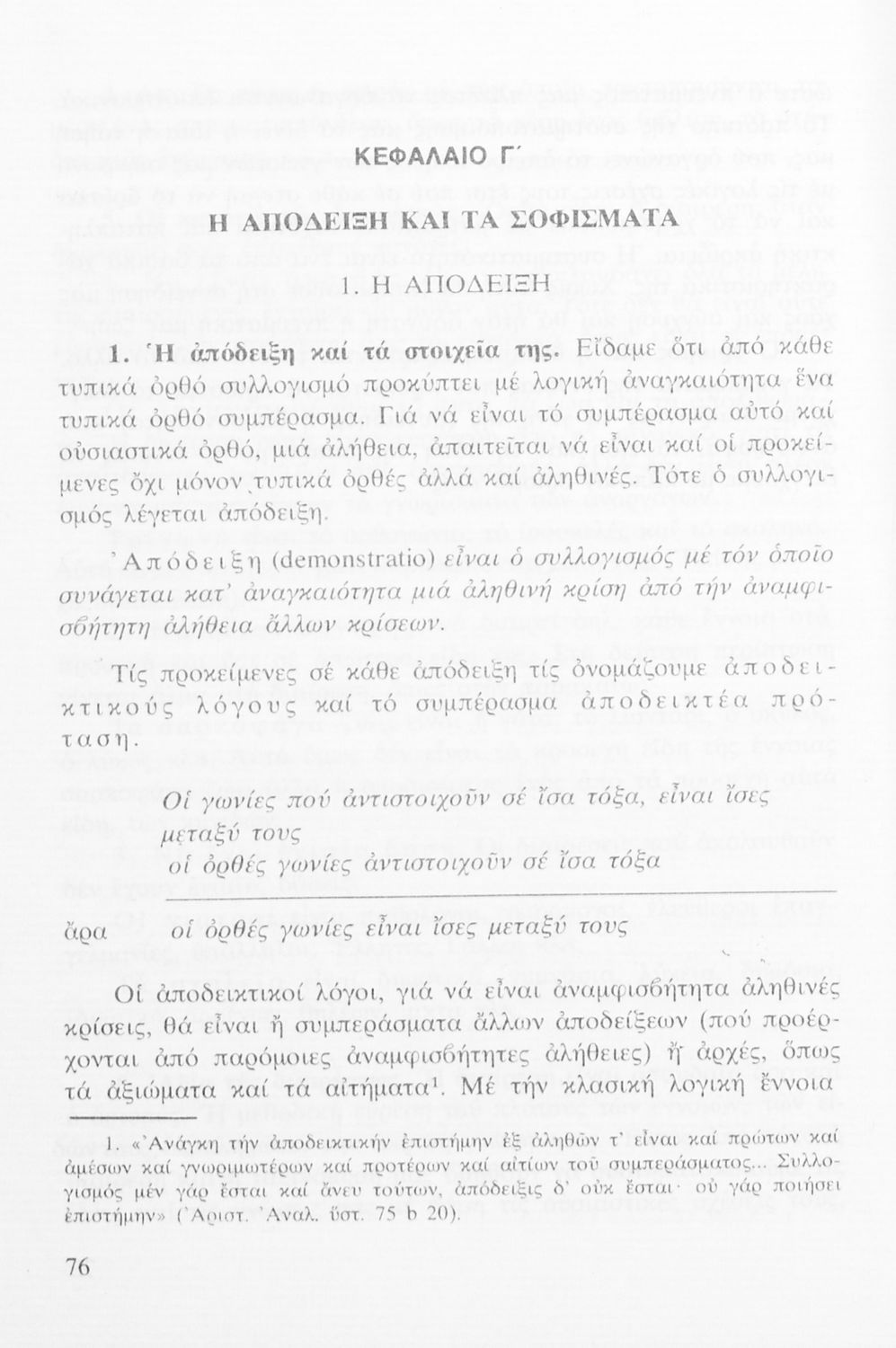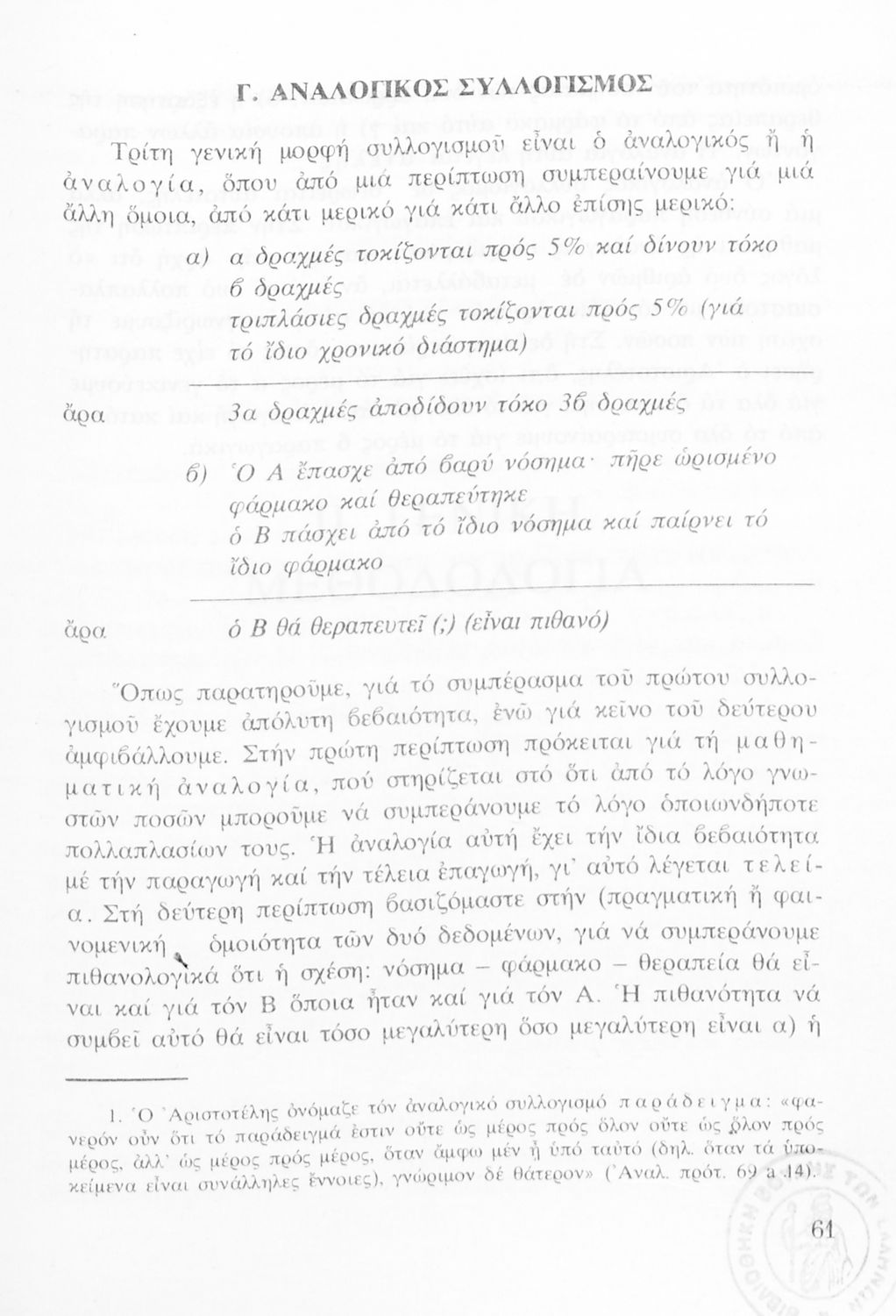 Σχολικό εγχειρίδιο Λογικής Γυμνασίου που είναι χωρισμένο σε στοιχειολογία ή τυπική λογική, μεθοδολογία και γνωσιολογία. Περιέχει ασκήσεις λογικής.