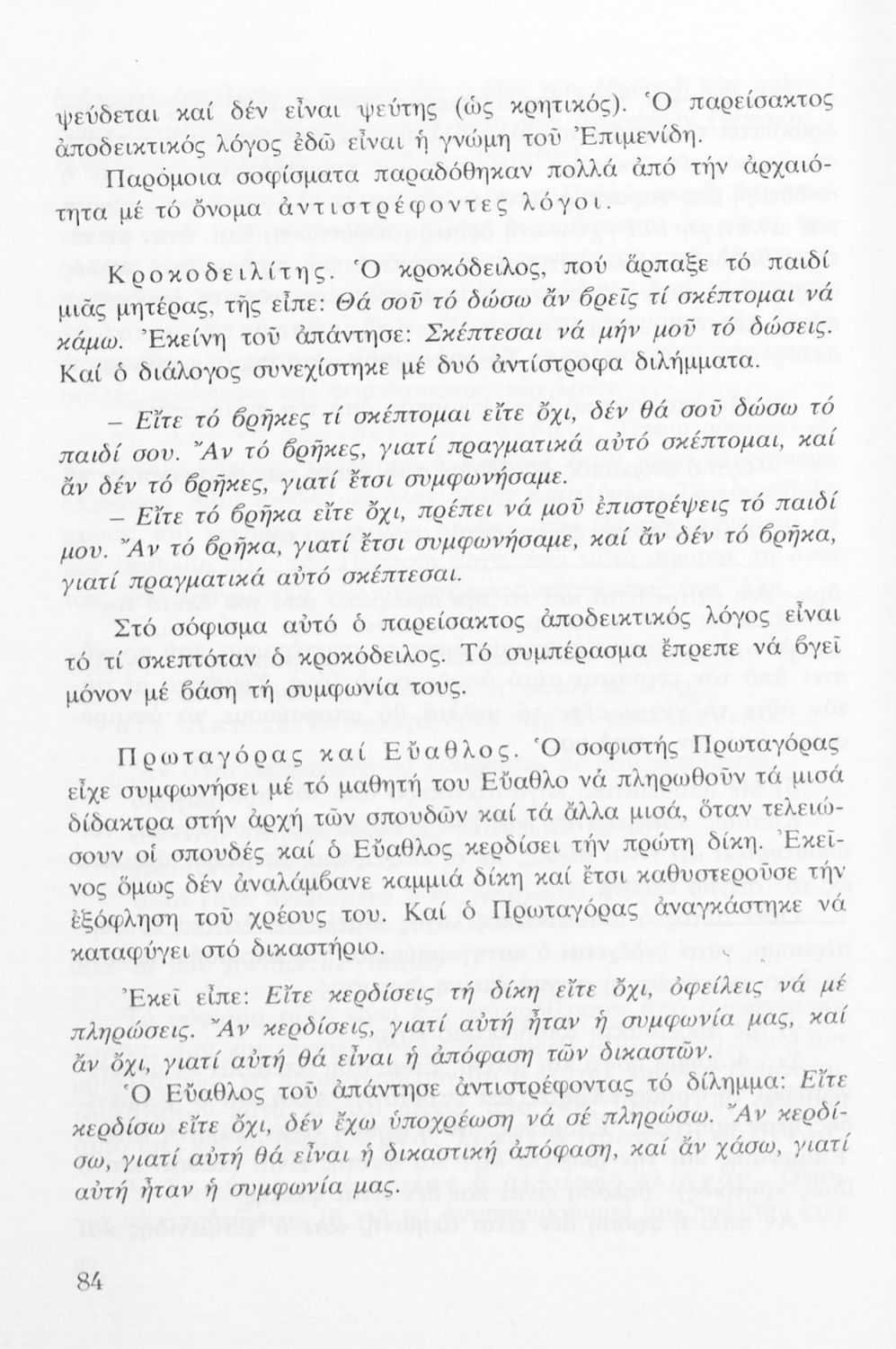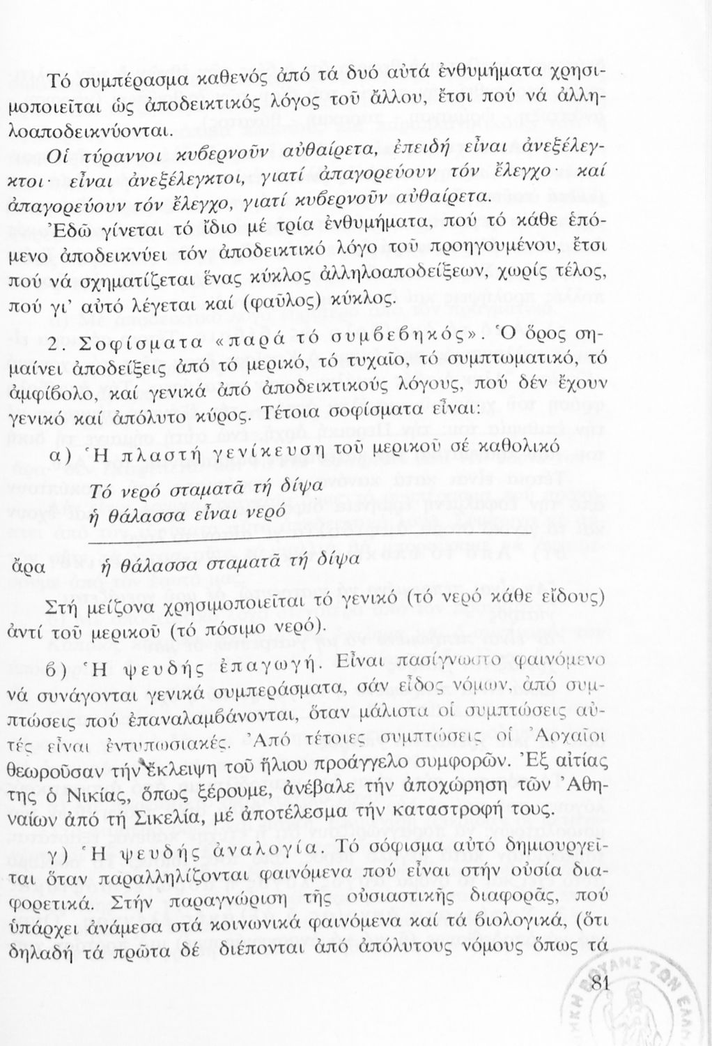 Σχολικό εγχειρίδιο Λογικής ΣΤ΄ Γυμνασίου που είναι δομημένο θεματικά και περιλαμβάνει ζητήματα τυπικής λογικής, μεθοδολογίας και γνωσιολογίας. Περιέχει παράρτημα με ασκήσεις λογικής.