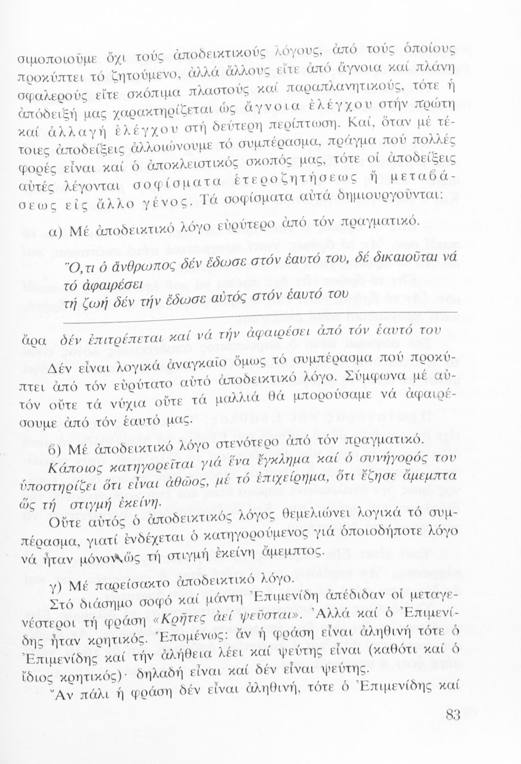 Σχολικό εγχειρίδιο Λογικής για τη ΣΤ΄ Γυμνασίου που είναι χωρισμένο σε στοιχειολογία ή τυπική λογική, μεθοδολογία και γνωσιολογία. Περιέχει ασκήσεις λογικής.