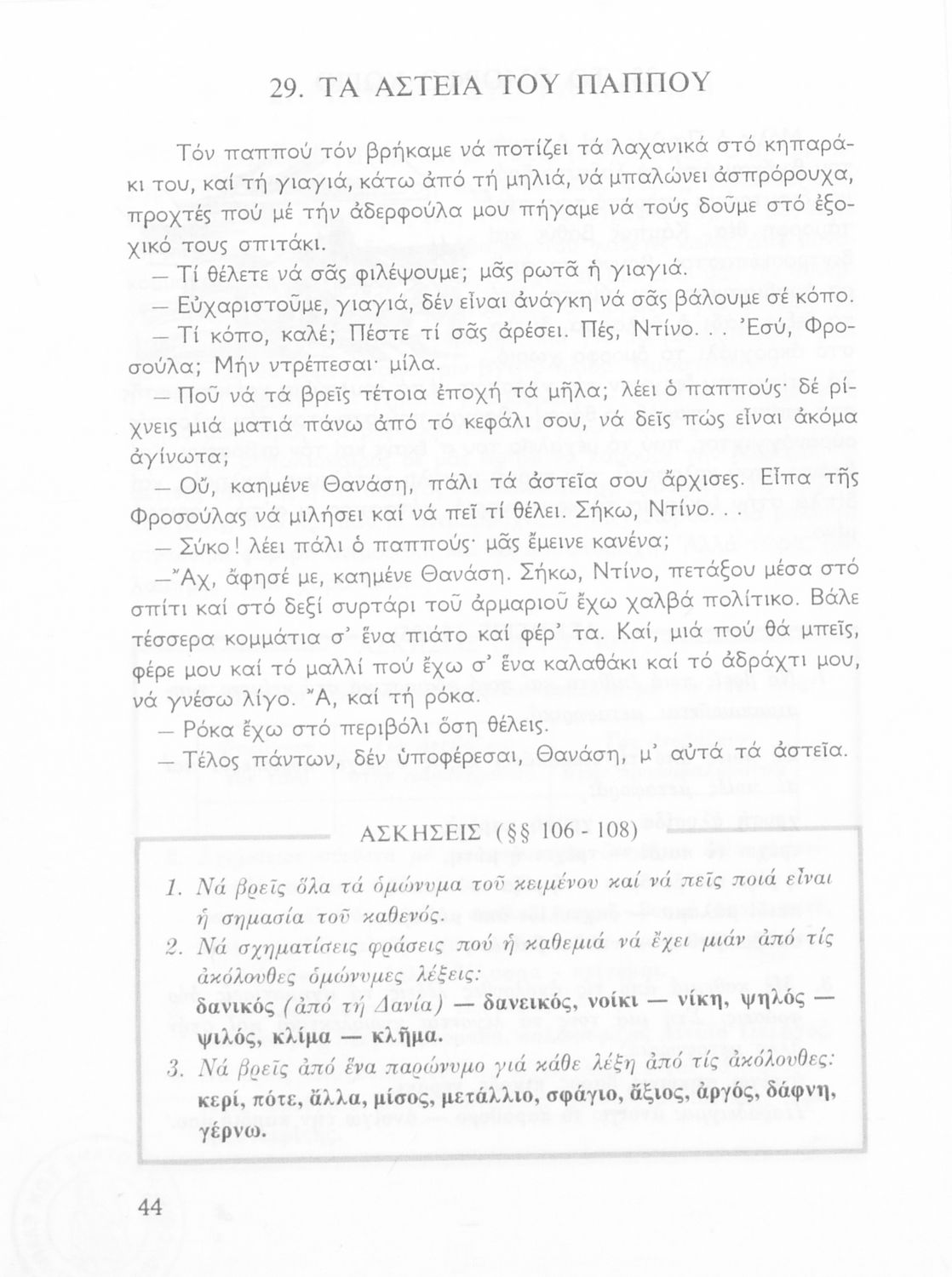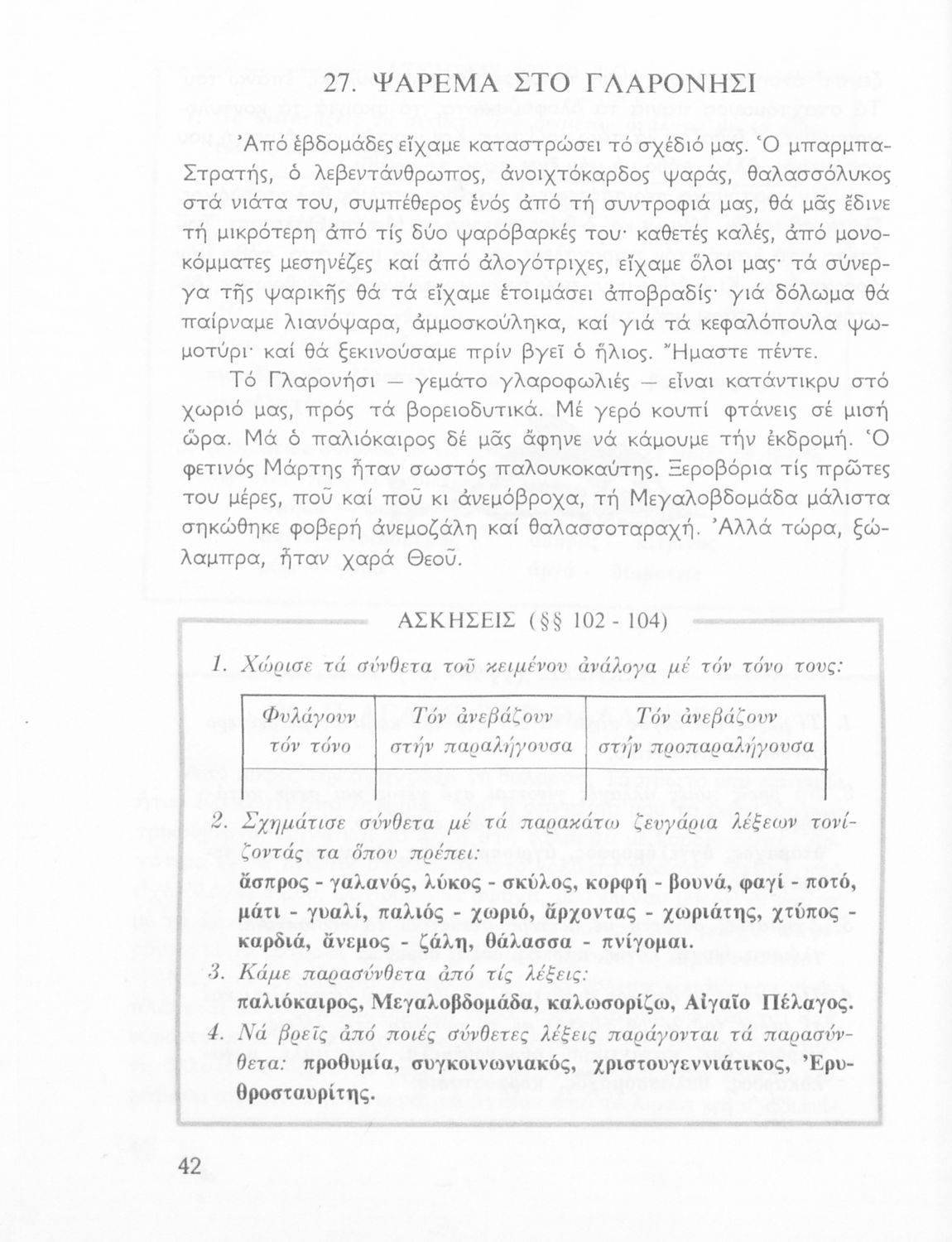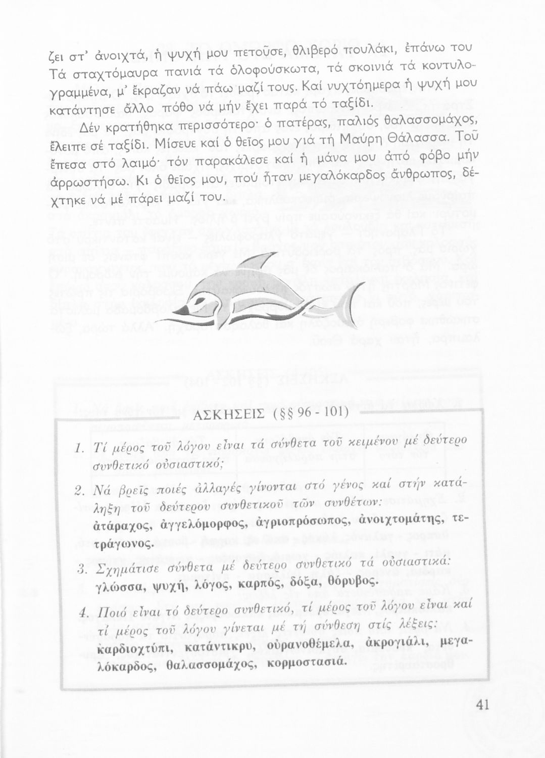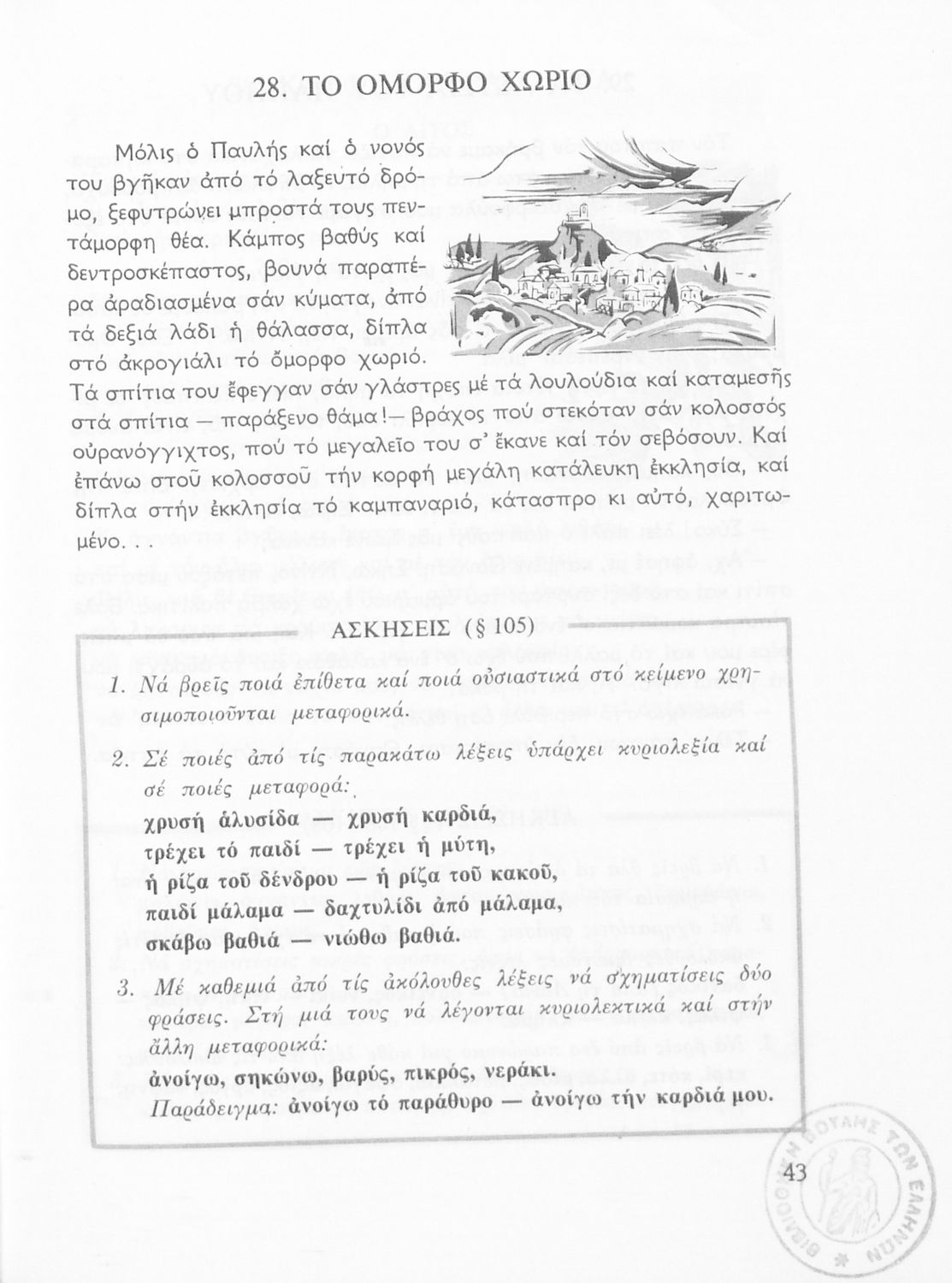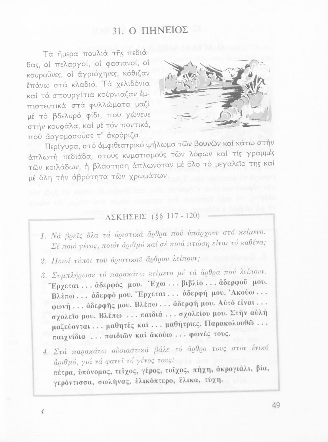 Βαθμίδα εκπαίδευσης: Πρωτοβάθμια Μάθημα: Νέα Ελληνικά Γλώσσα: Δημοτική Παρουσίαση περιεχομένου: Το σύγγραμμα ήταν σχολικό εγχειρίδιο για το μάθημα της Γλώσσας στο Δημοτικό. Περιέχει κείμενα πεζά και διηγήματα μέσα από τα οποία παρουσιάζονται γραμματικά και συντακτικά φαινόμενα. |