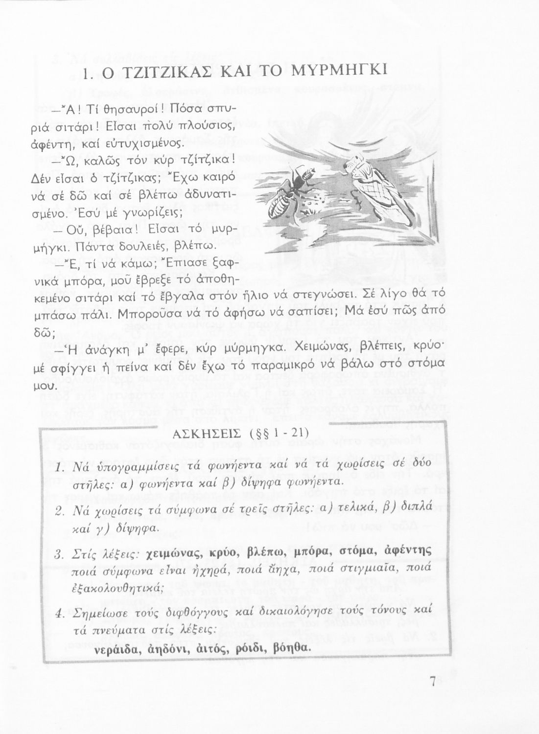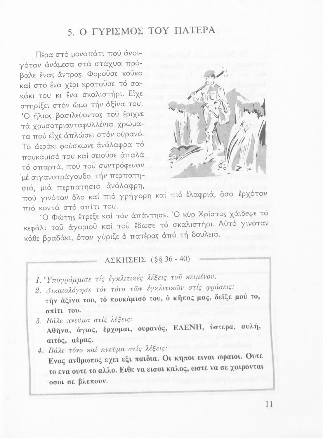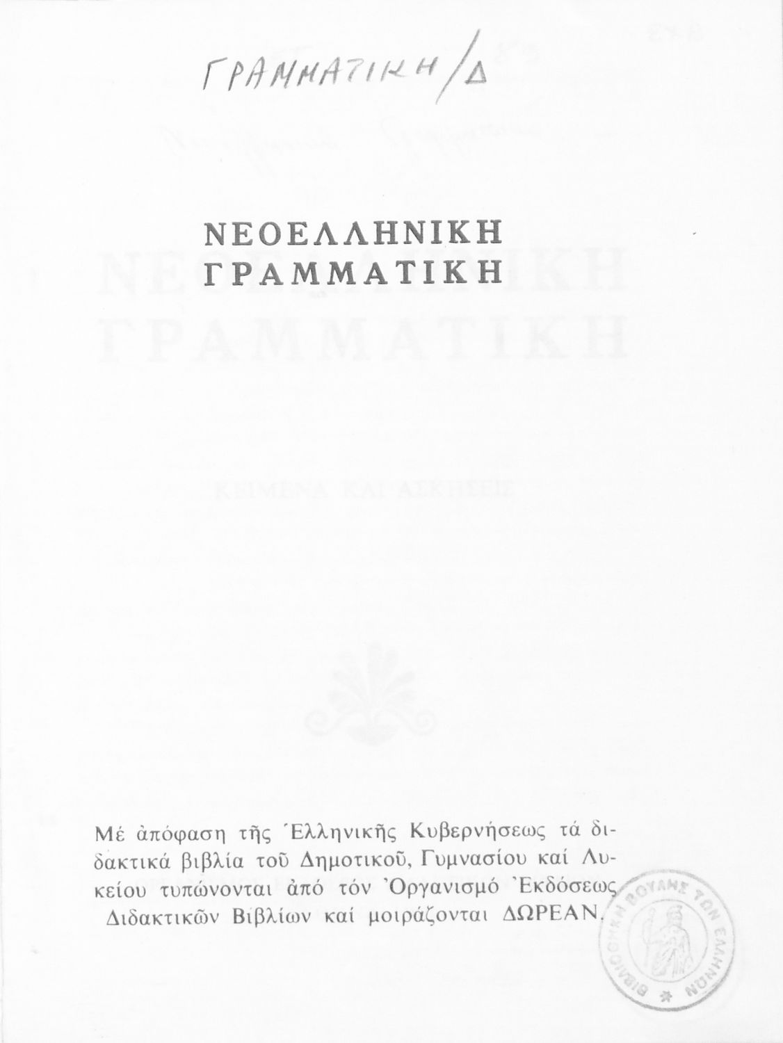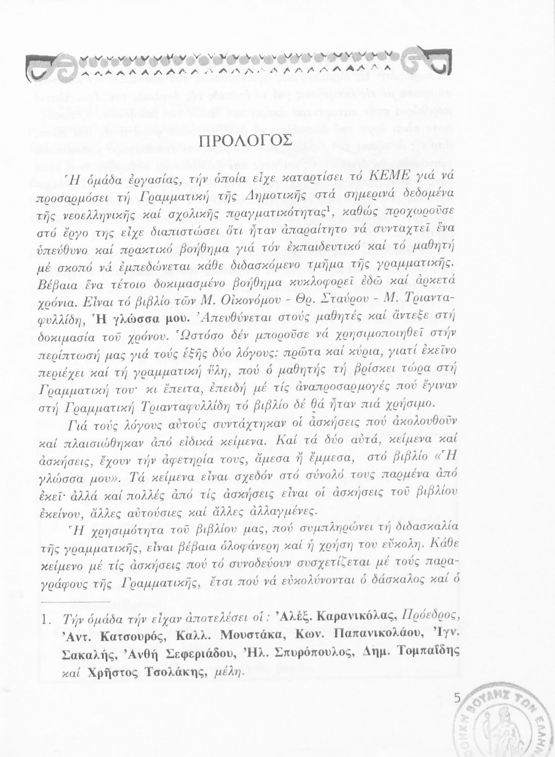 Βαθμίδα εκπαίδευσης: Πρωτοβάθμια Μάθημα: Νέα Ελληνικά Γλώσσα: Δημοτική Παρουσίαση περιεχομένου: Το σύγγραμμα ήταν σχολικό εγχειρίδιο για το μάθημα της Γλώσσας στο Δημοτικό. Περιέχει κείμενα πεζά και διηγήματα μέσα από τα οποία παρουσιάζονται γραμματικά και συντακτικά φαινόμενα. |