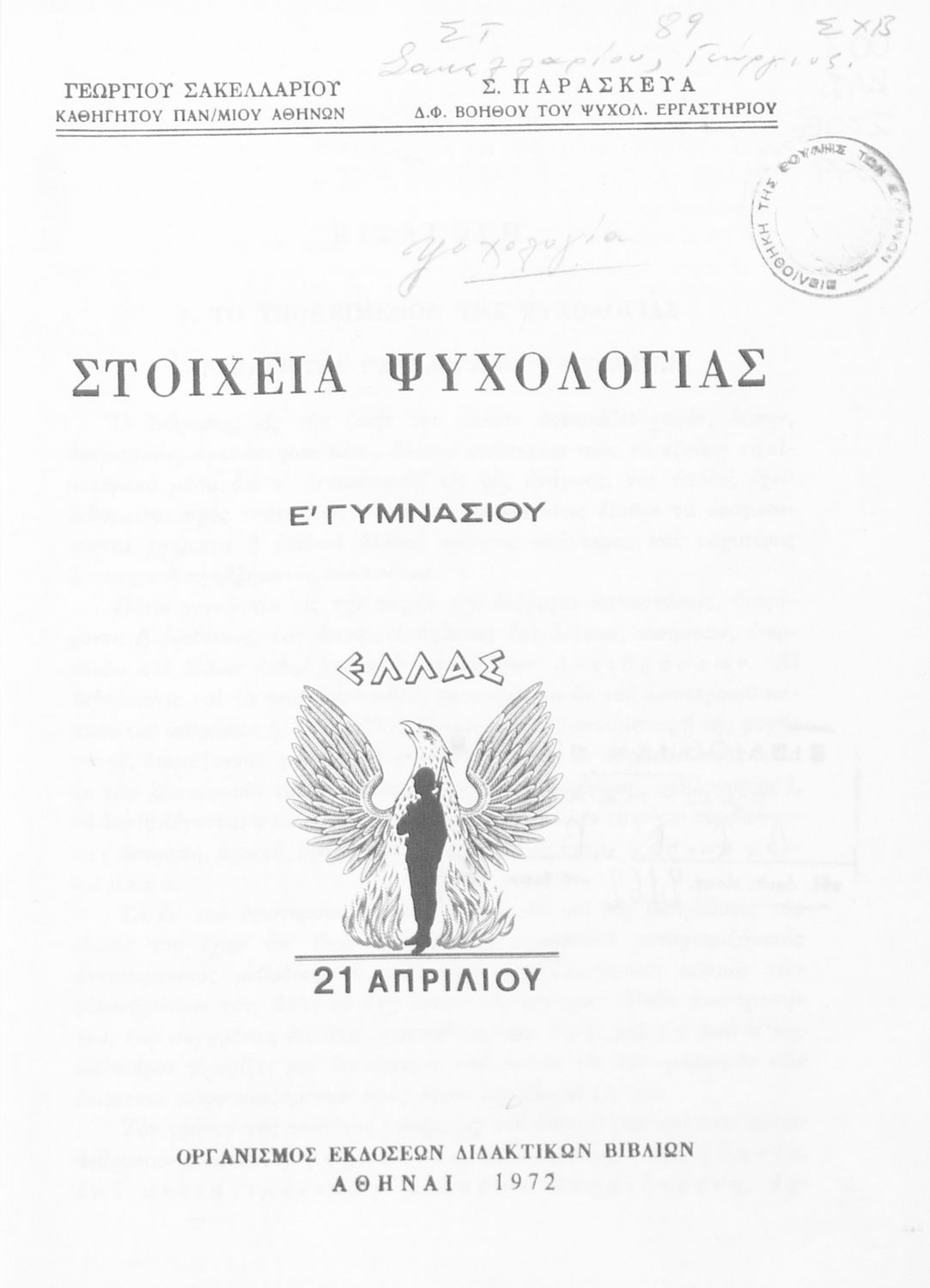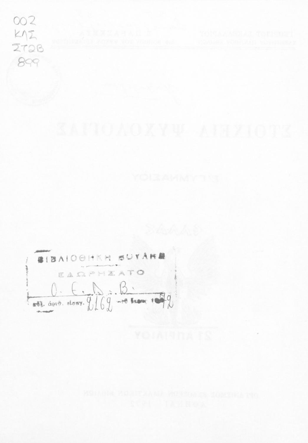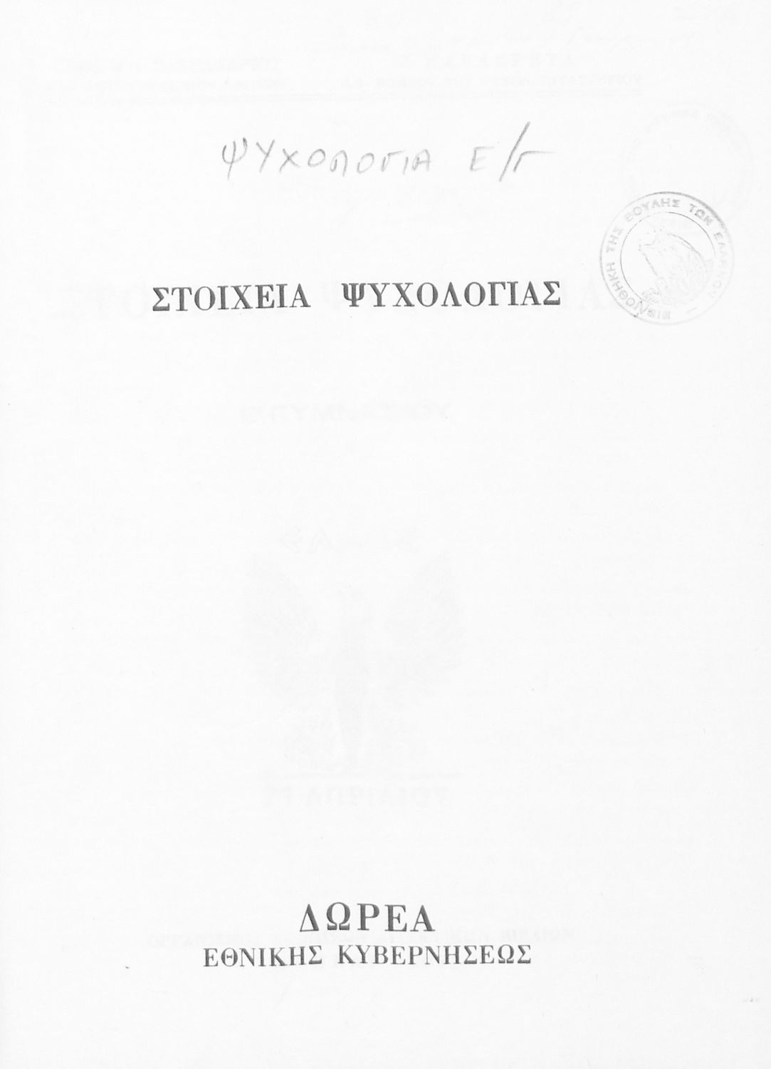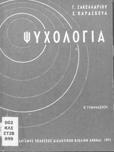 Σχολικό εγχειρίδιο Ψυχολογίας για την Ε΄ Γυμνασίου που περιλαμβάνει θεωρία και ασκήσεις και εξετάζει τον ψυχικό βίο από νοητική, συναισθηματική και βουλητική άποψη. Φέρει το σύμβολο της δικτατορίας.