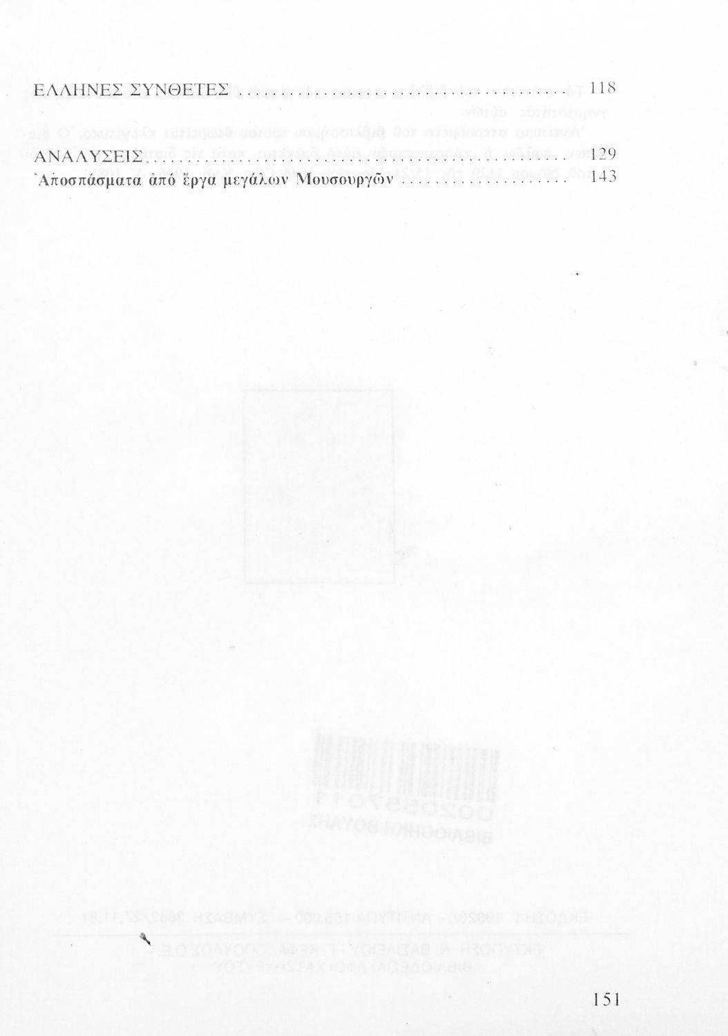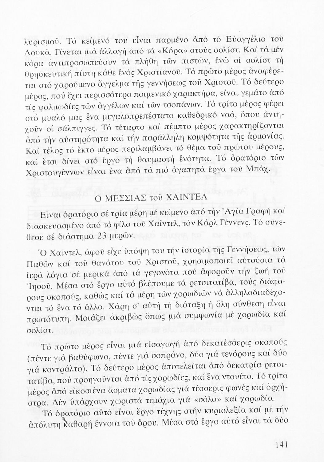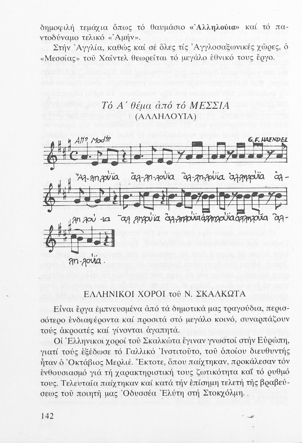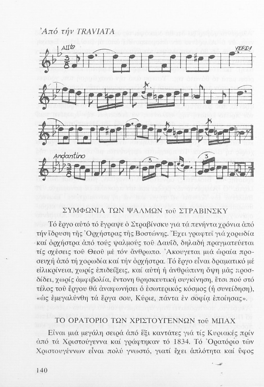 Σχολικό εγχειρίδιο Μουσικής της Α ' Λυκείου. Το βιβλίο ξεκινάει με μια σύντομη επισκόπηση της ελληνικής μουσικής από τα αρχαία χρόνια μέχρι και τον 20ο αιώνα. Στη συνέχεια εισάγει τους μαθητές στη θεωρία της μουσικής, τα είδη των μουσικών συνθέσεων, αναλύοντας τη Βυζαντινή μουσική και την ιστορία της ευρωπαϊκής μουσικής. Στο βιβλίο περιέχονται αποσπάσματα από παρτιτούρες διάσημων συνθέσεων.