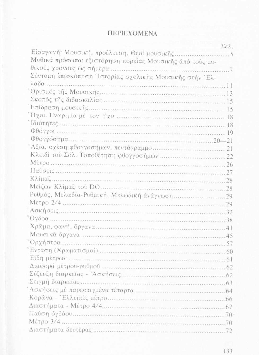 Σχολικό εγχειρίδιο Μουσικής για τους μαθητές της Α' Γυμνασίου. Το βιβλίο περιέχει το σκοπό και το ρόλο της μουσικής, τα μέτρα και τις κλίμακες και τέλος τα διαφορετικά είδη τραγουδιών.