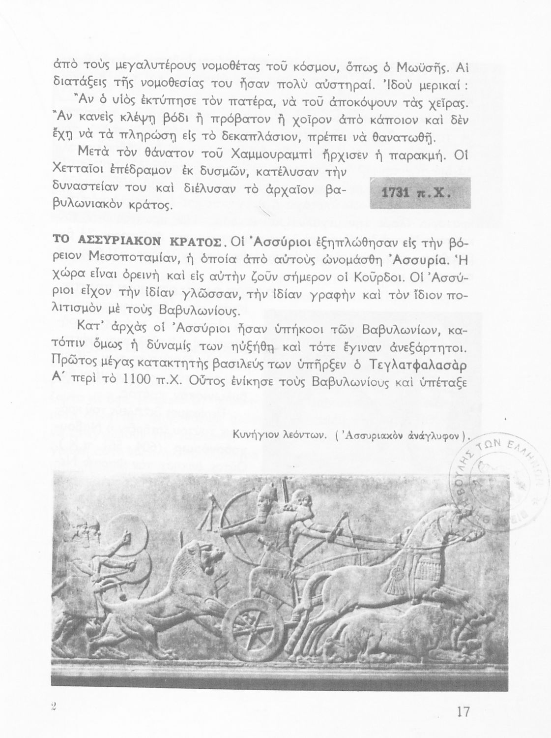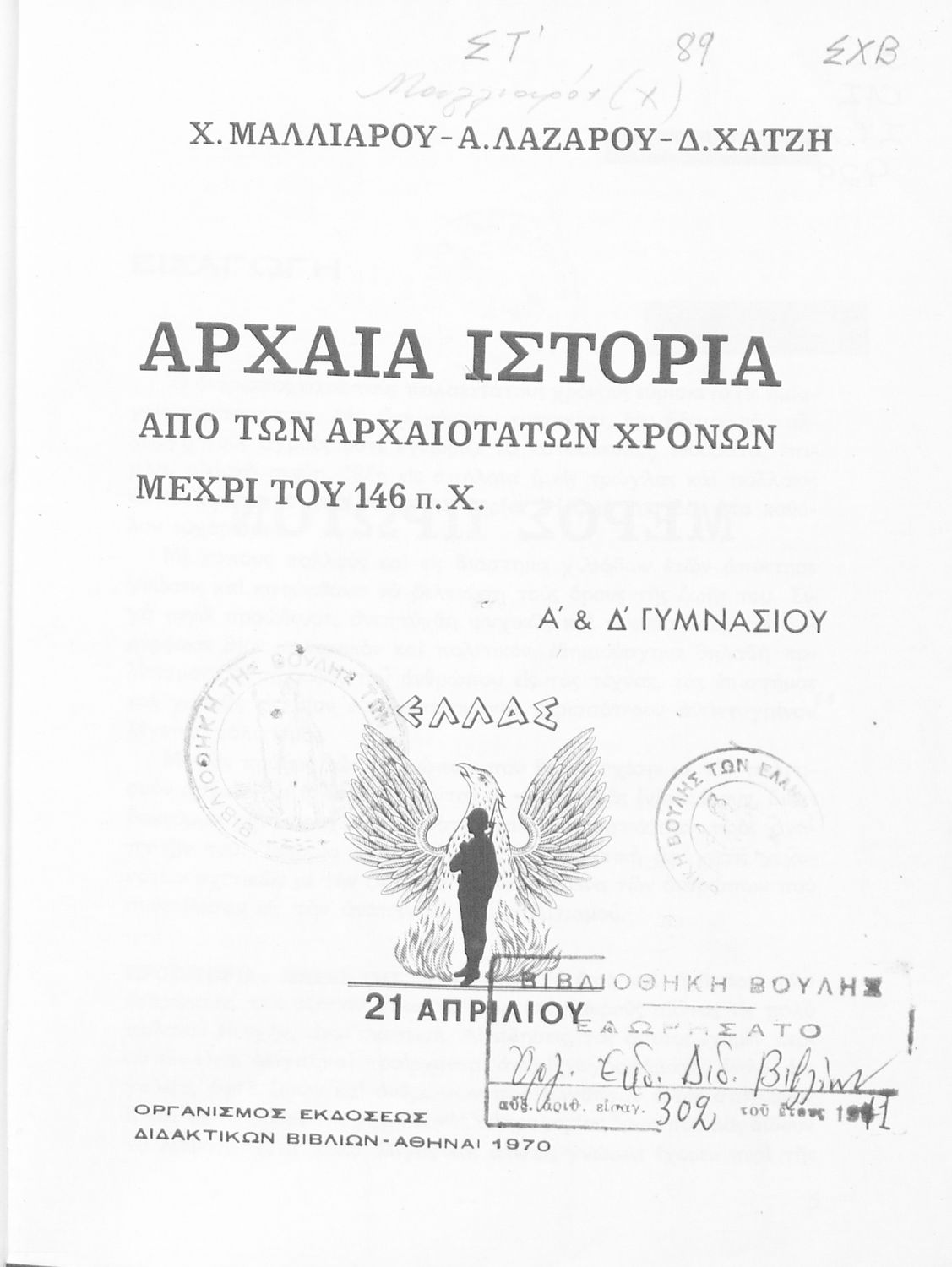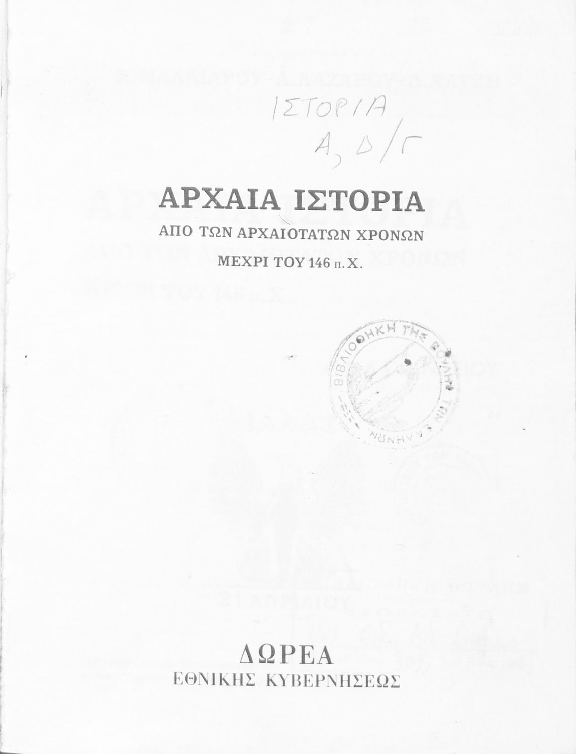 Κωδικός αναγνώρισης: 03-20557027 Τίτλος: Αρχαία Ιστορία από των αρχαιοτάτων χρόνων μέχρι του 146 π. Χ. Α' και Δ΄ Γυμνασίου Συγγραφέας: Χ. Μαλλιαρός, Α. Λαζάρου, Δ. Χατζής Μέγεθος και υπόστρωμα: Σχολικό εγχειρίδιο, μαλακό εξώφυλλο, 438 σελίδες. Σκίτσα, εικόνες, χάρτης (ασπρόμαυρα). |