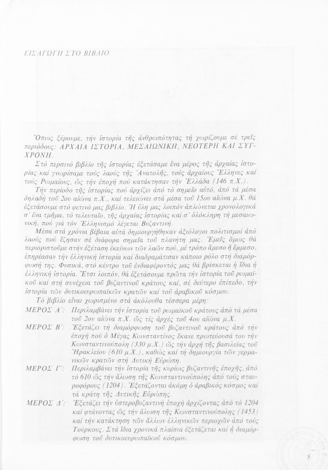 Σχολικό εγχειρίδιο Ιστορίας Β΄ και Ε΄ Γυμνασίου που καλύπτει την περίοδο από την άνοδο του Μ. Κωνσταντίνου στο θρόνο μέχρι και την άλωση της Κωνσταντινούπολης. Παρουσιάζει και τα πνευματικά και καλλιτεχνικά ...