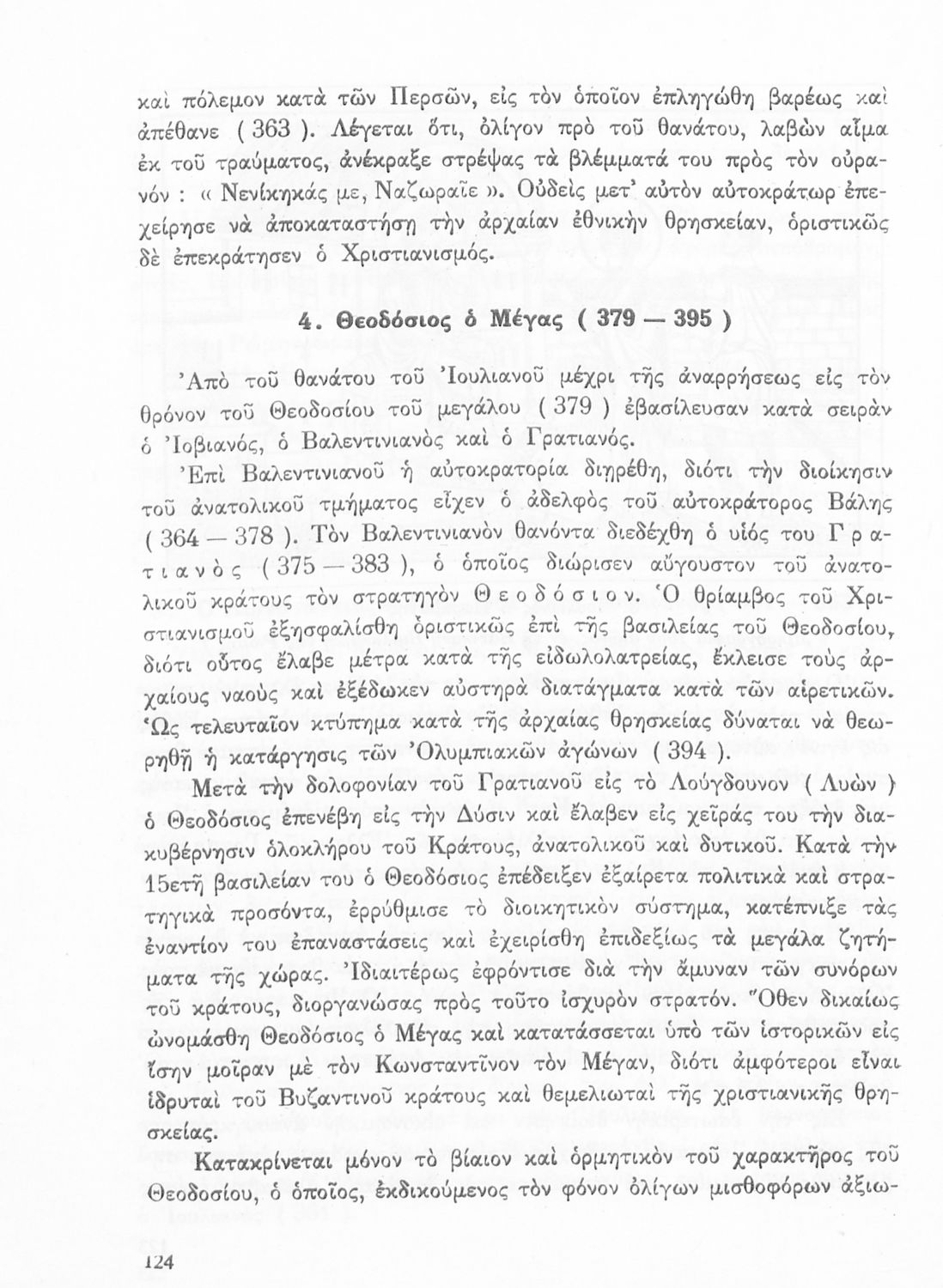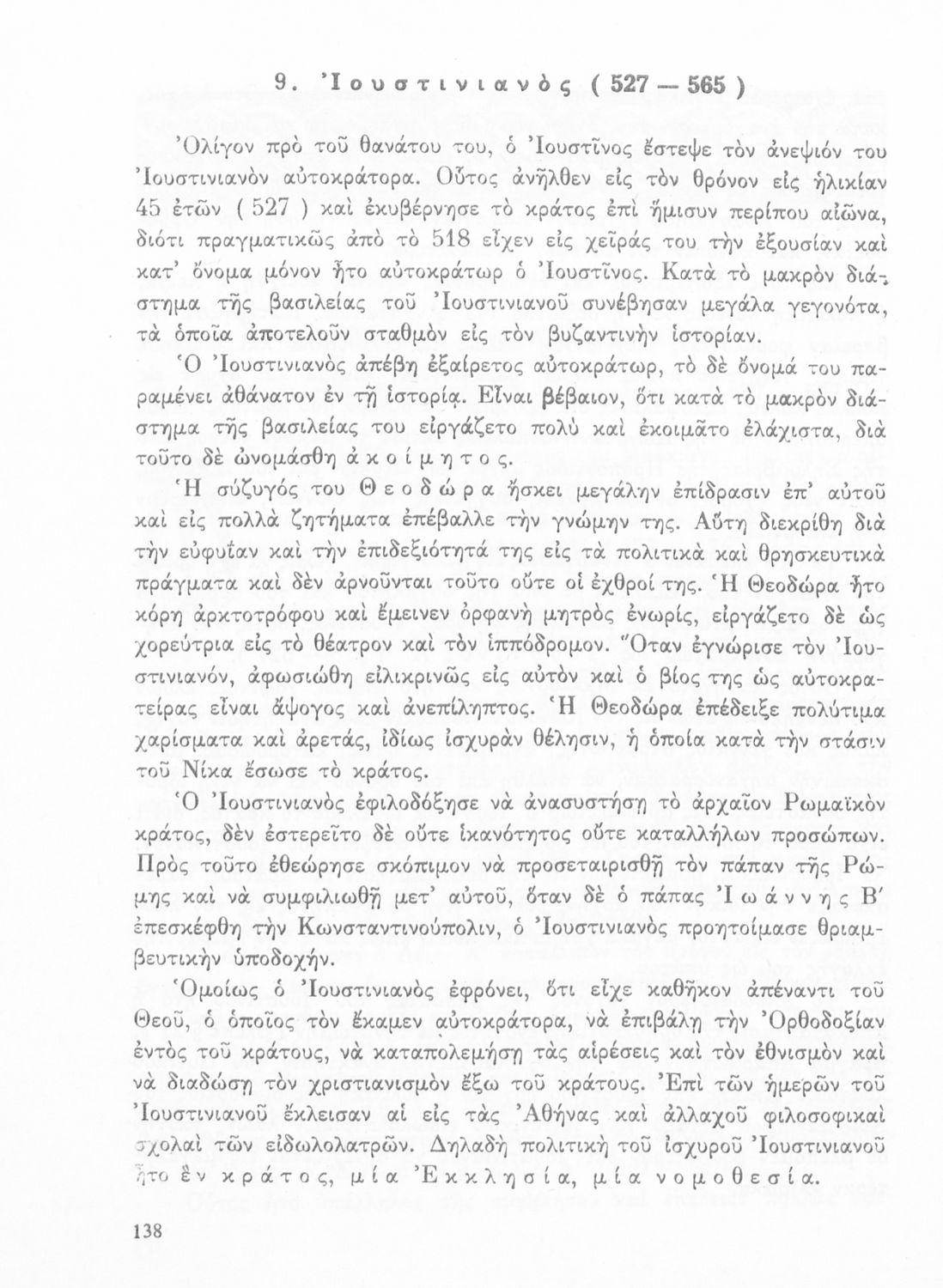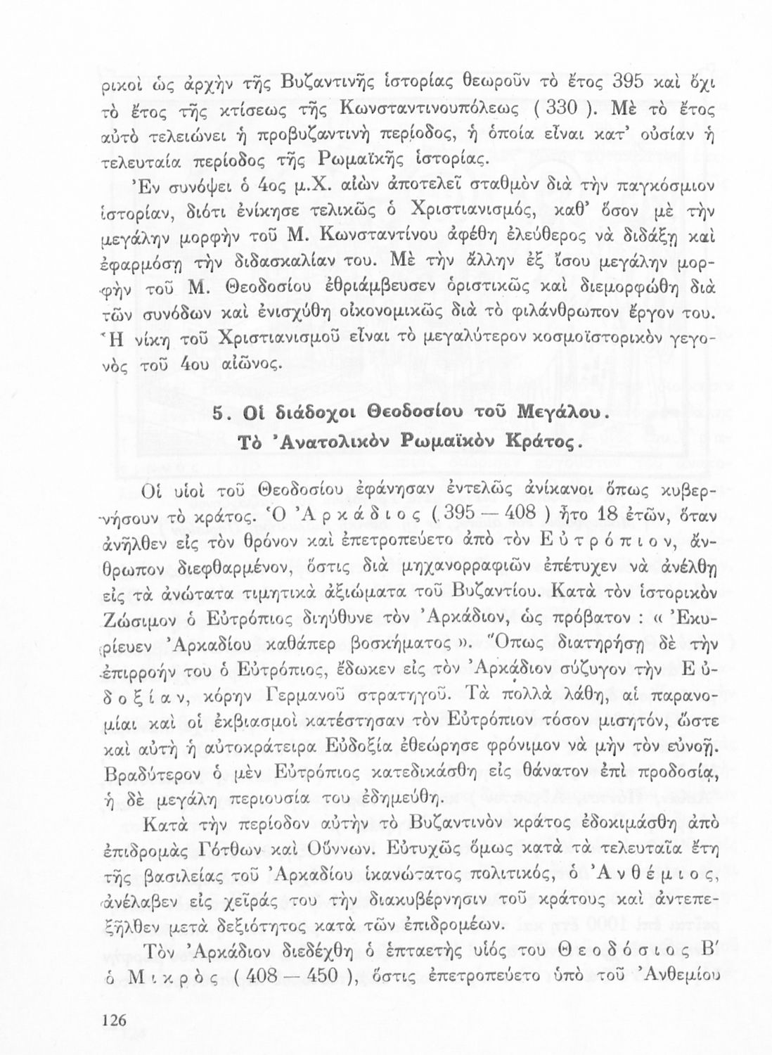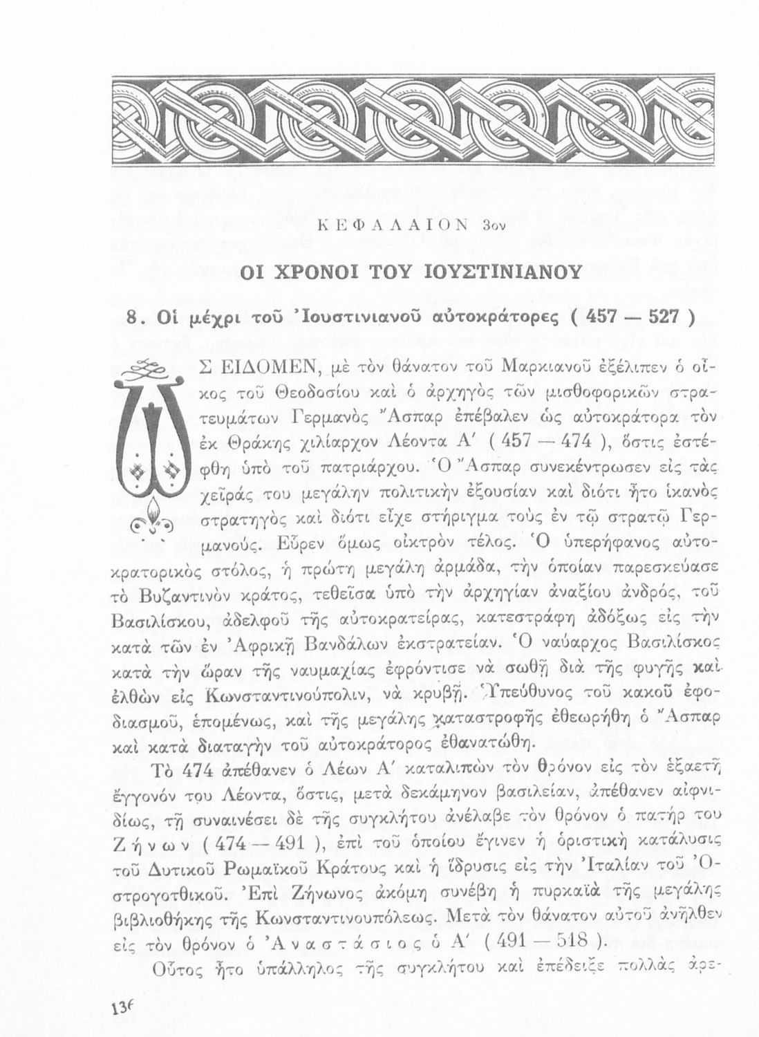 Σχολικό εγχειρίδιο Ιστορίας Β΄ και Ε΄ Γυμνασίου που καλύπτει την περίοδο από την άνοδο του Μ. Κωνσταντίνου στο θρόνο μέχρι και την άλωση της Κωνσταντινούπολης. Παρουσιάζει και τα πνευματικά και καλλιτεχνικά ρεύματα της περιόδου. Φέρει το σύμβολο της δικτατορίας.