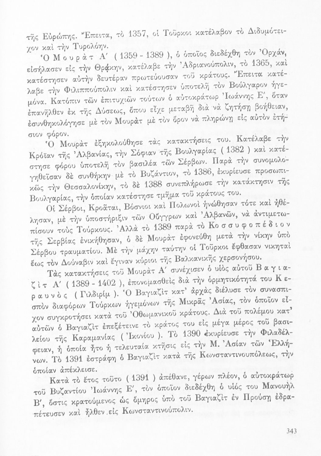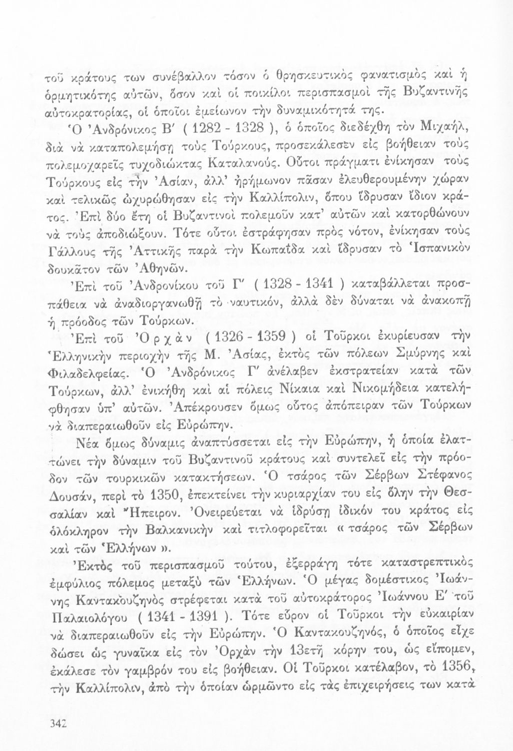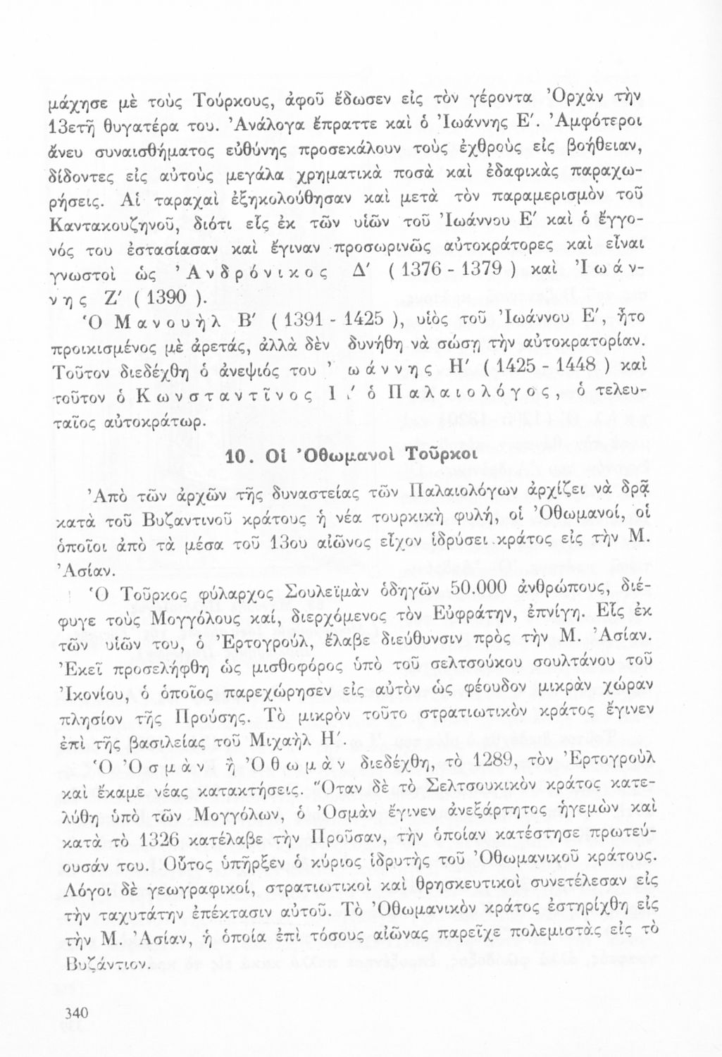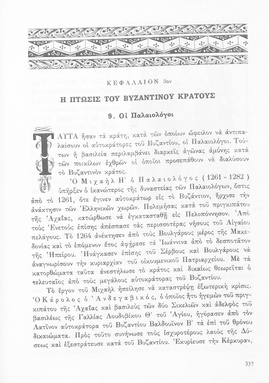 Σχολικό εγχειρίδιο Ιστορίας Β΄ και Ε΄ Γυμνασίου που καλύπτει την περίοδο από την άνοδο του Μ. Κωνσταντίνου στο θρόνο μέχρι και την άλωση της Κωνσταντινούπολης. Παρουσιάζει και τα πνευματικά και καλλιτεχνικά ρεύματα της περιόδου. Φέρει το σύμβολο της δικτατορίας.