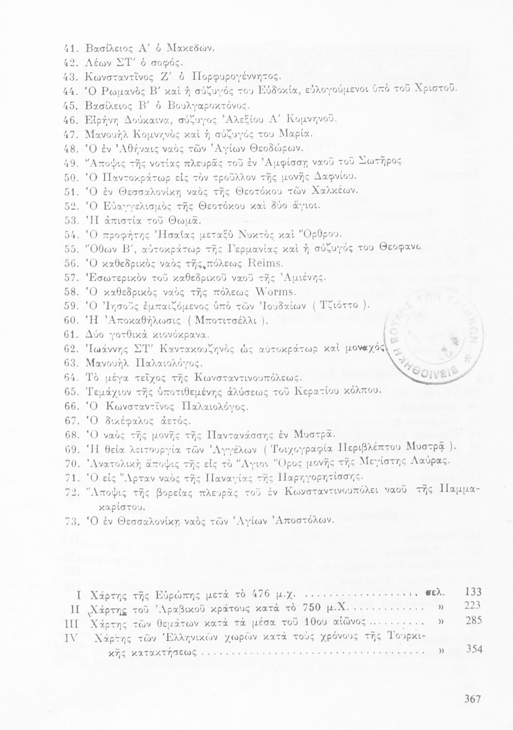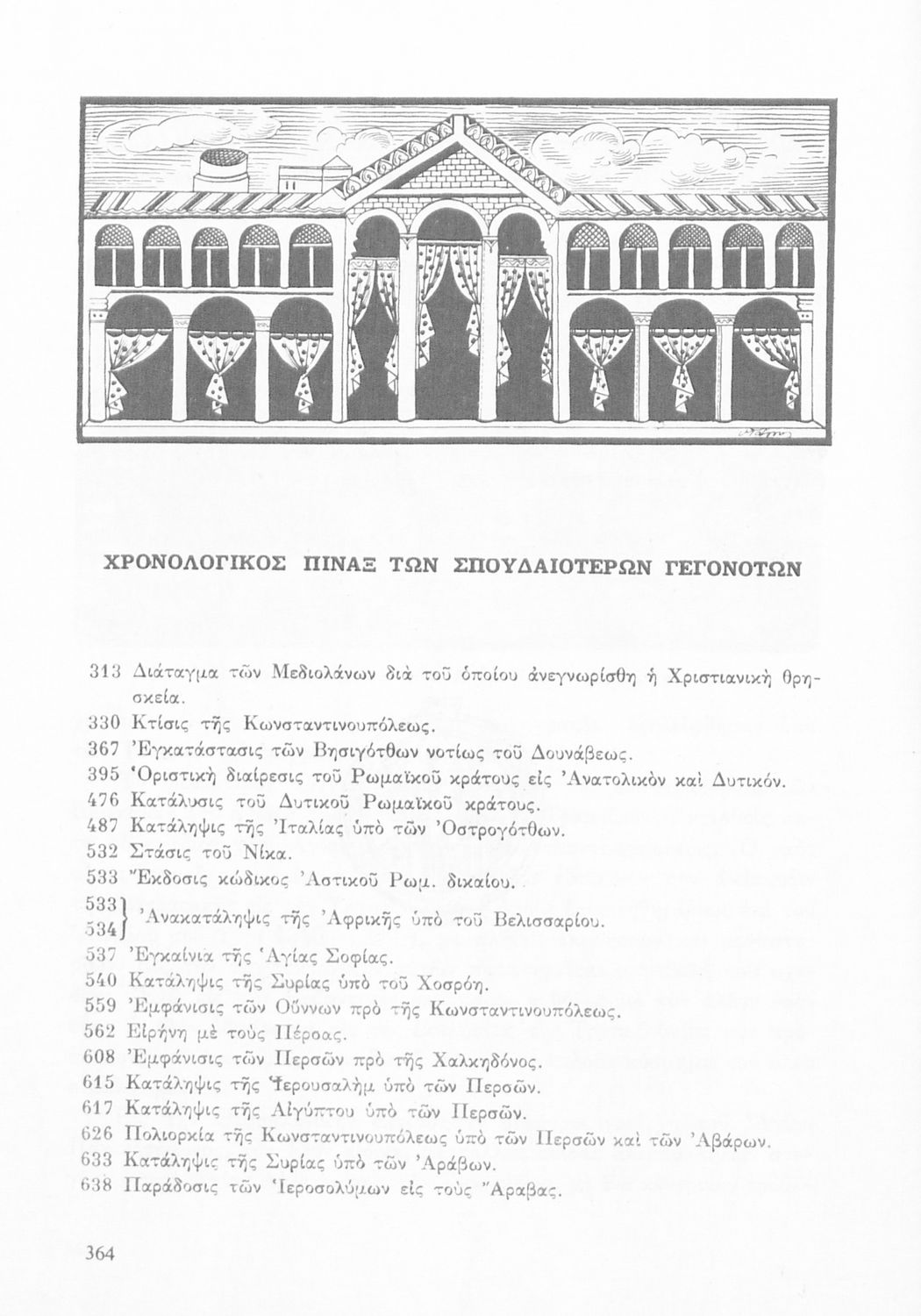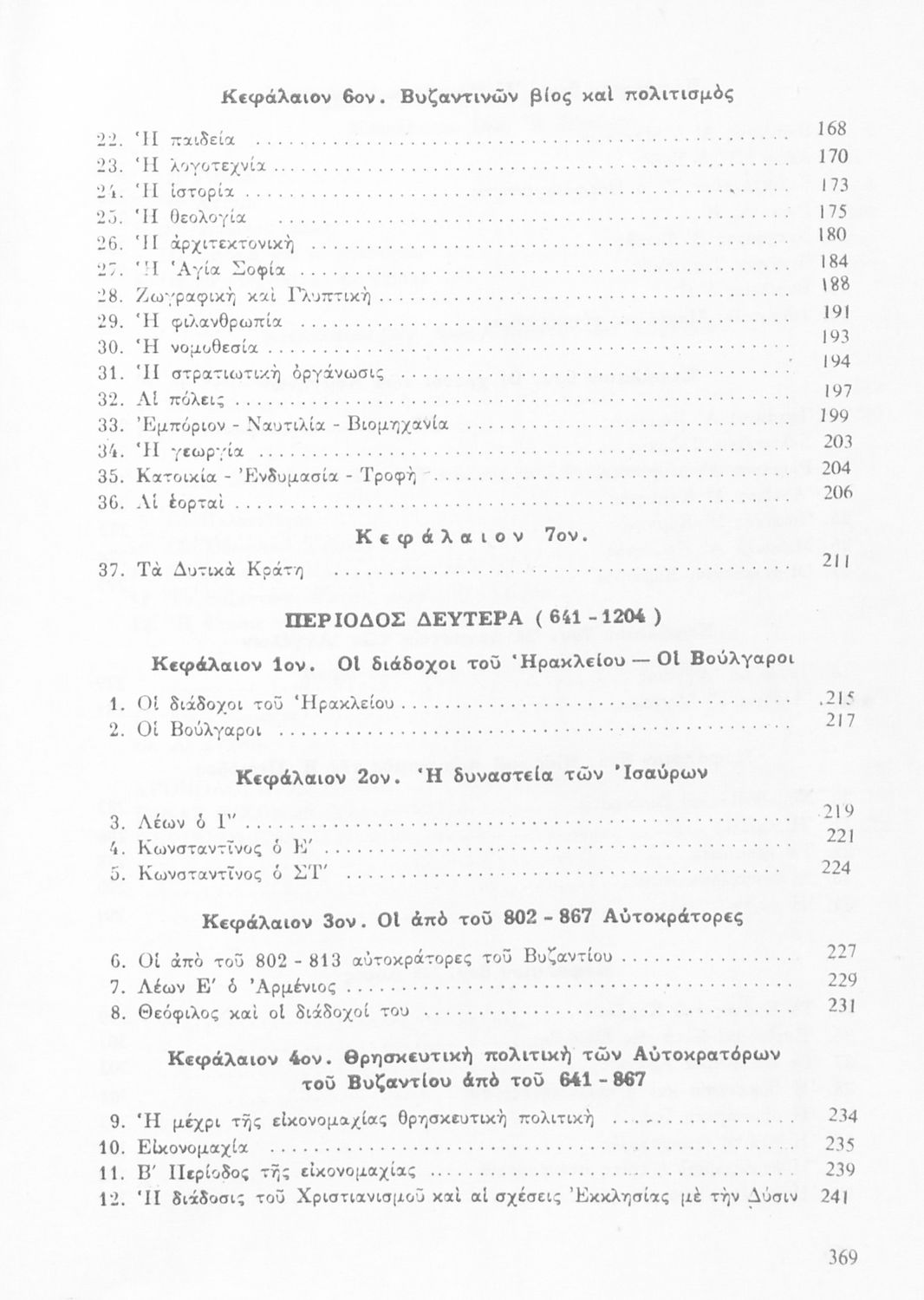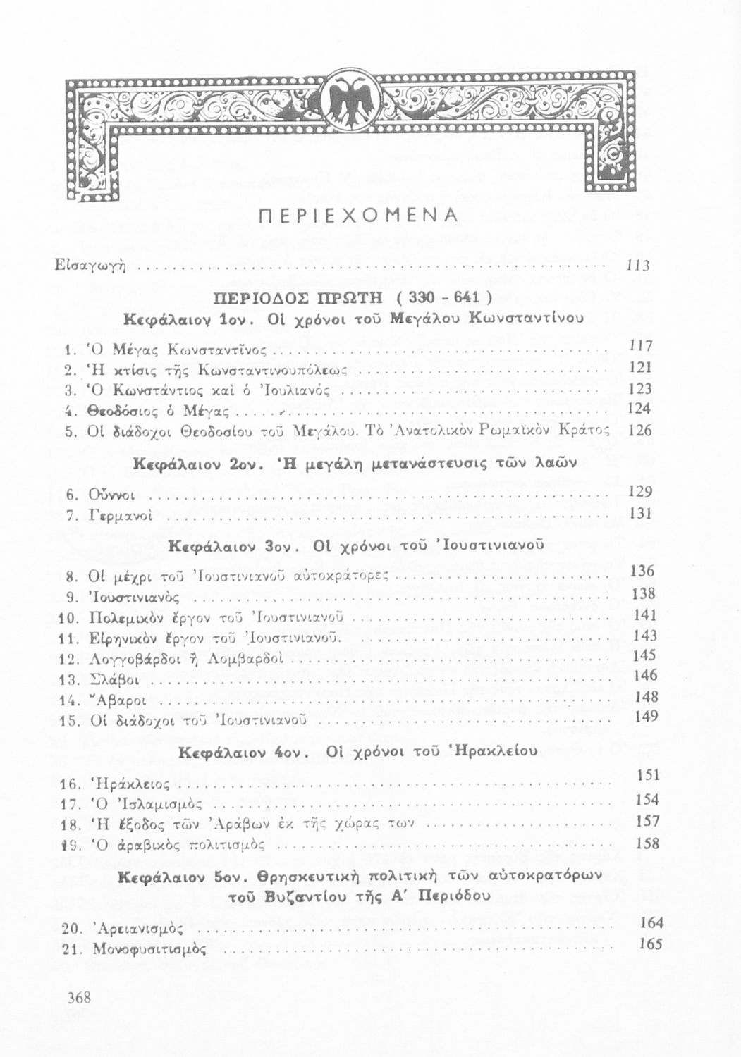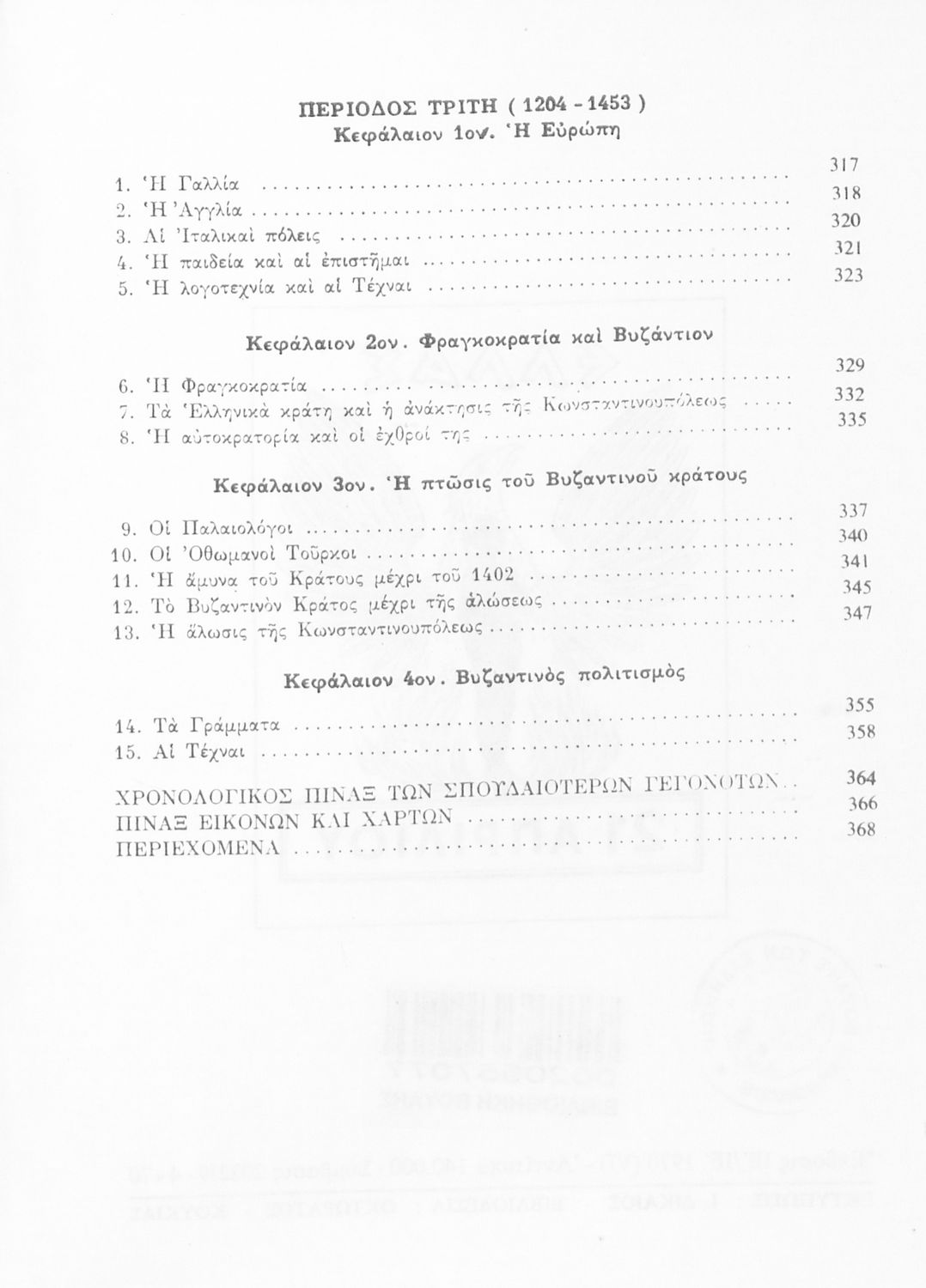 Σχολικό εγχειρίδιο Ιστορίας Β΄ και Ε΄ Γυμνασίου που καλύπτει την περίοδο από την άνοδο του Μ. Κωνσταντίνου στο θρόνο μέχρι και την άλωση της Κωνσταντινούπολης. Παρουσιάζει και τα πνευματικά και καλλιτεχνικά ρεύματα της περιόδου. Φέρει το σύμβολο της δικτατορίας.