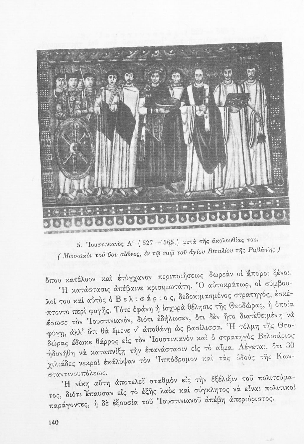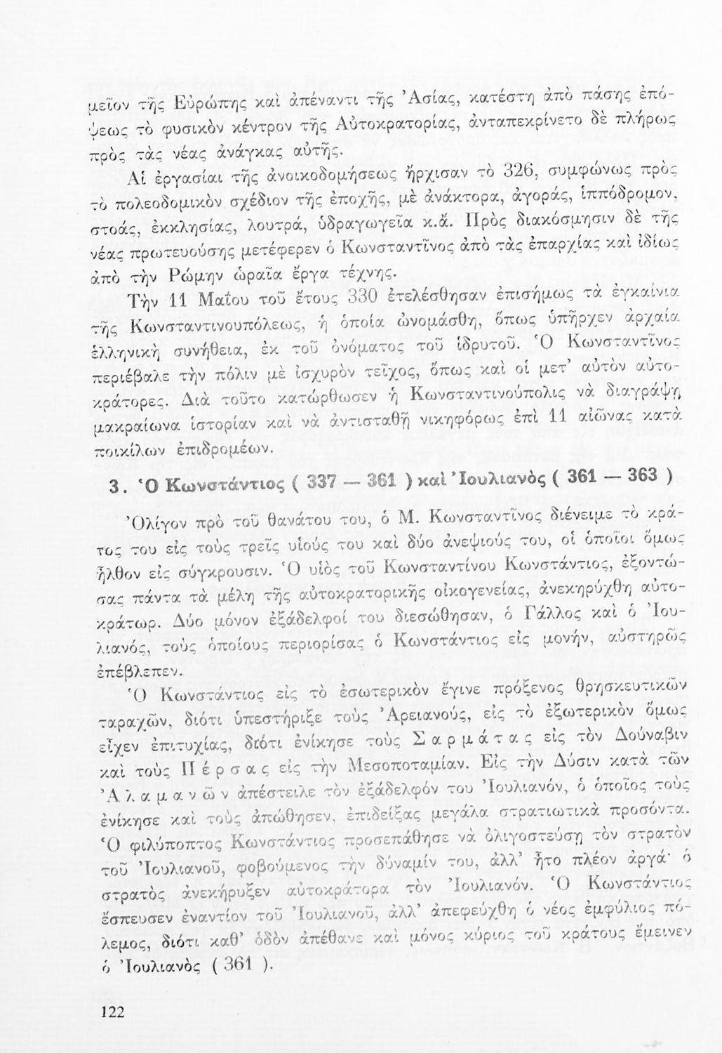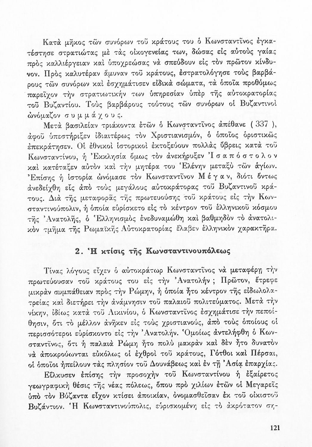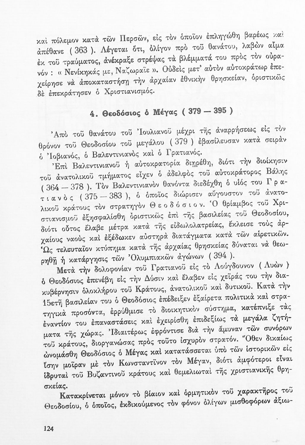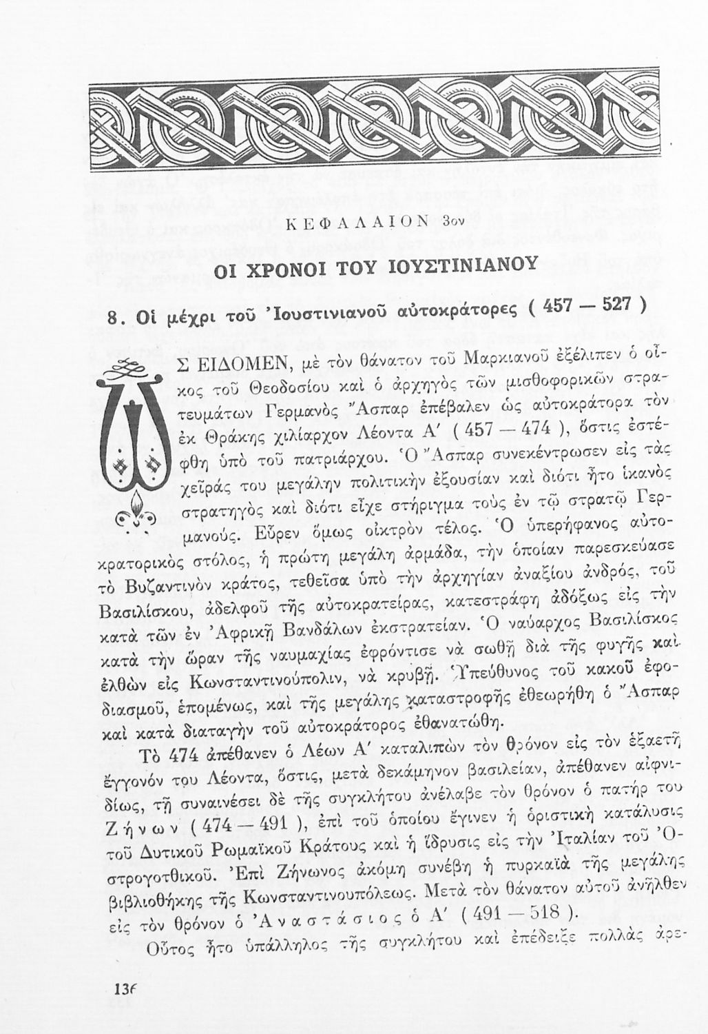 Σχολικό εγχειρίδιο Ιστορίας Β΄ και Ε΄ Γυμνασίου που καλύπτει την περίοδο από την άνοδο του Μ. Κωνσταντίνου στο θρόνο μέχρι και την άλωση της Κωνσταντινούπολης. Παρουσιάζει και τα πνευματικά και καλλιτεχνικά ρεύματα της περιόδου. Φέρει το σύμβολο της δικτατορίας.