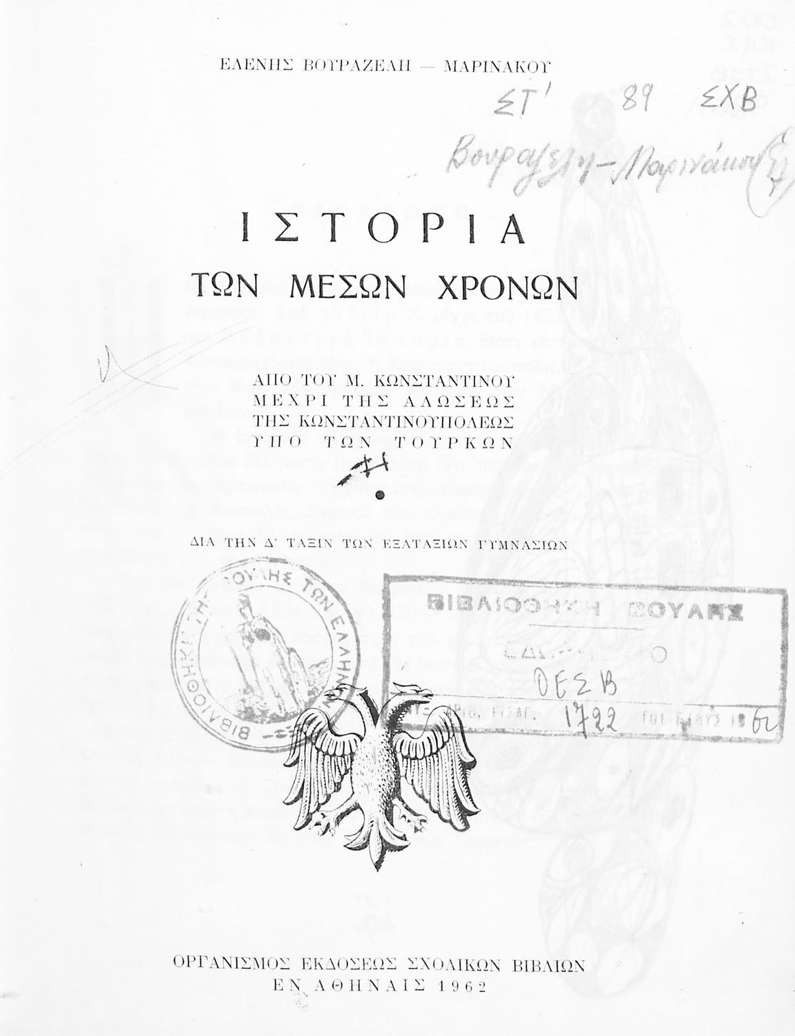 Τίτλος: Ιστορία των μέσων χρόνων από του Μ. Κωνσταντίνου μέχρι της Αλώσεως της Κωνσταντινουπόλεως υπό των Τούρκων δια την Δ' τάξιν των Εξαταξίων Γυμνασίων