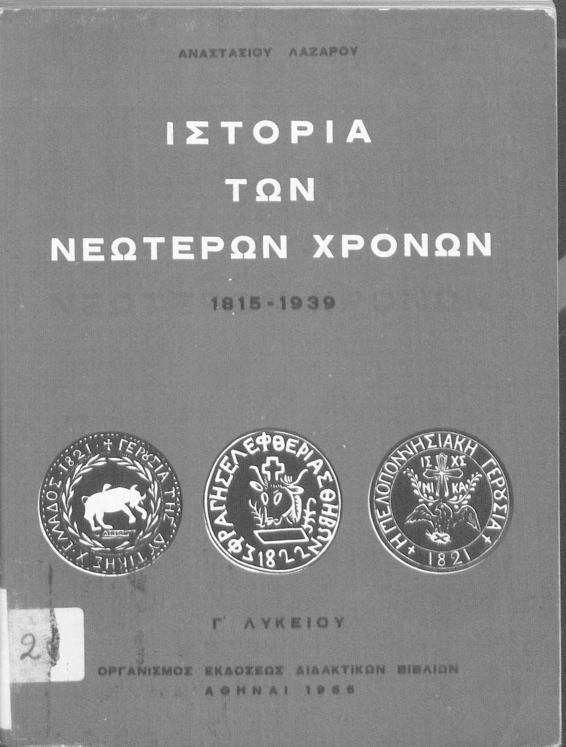 Κωδικός αναγνώρισης: 03-20557127 Τίτλος: Ιστορία των Νεώτερων Χρόνων από της συνθήκης της Βιέννης (1815) μέχρι του 2ου Παγκοσμίου Πολέμου (1939) Γ΄ Λυκείου Συγγραφέας: Αναστάσιος Λαζάρου Εικονογράφος: Γεώργιος Λυδάκης Μέγεθος και υπόστρωμα: Σχολικό εγχειρίδιο, μαλακό εξώφυλλο, 310 σελίδες. Εικόνες (ασπρόμαυρες), σκίτσα (ασπρόμαυρα). |