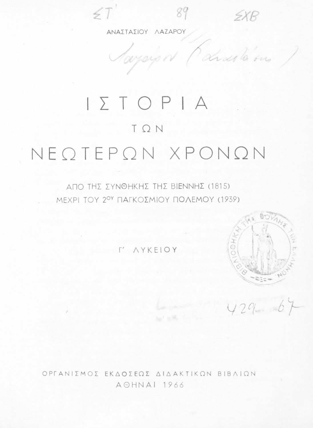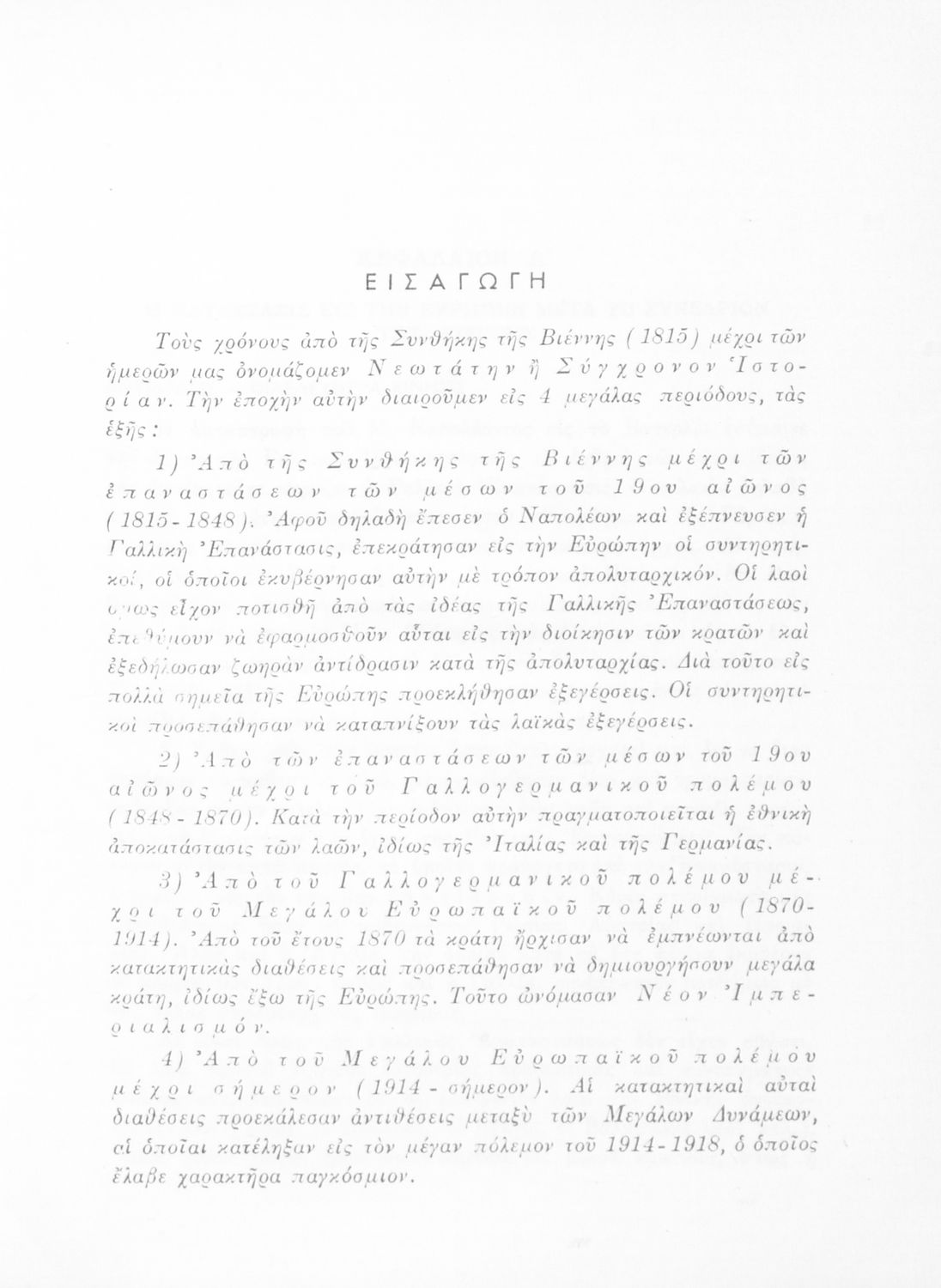 Βαθμίδα εκπαίδευσης: Δευτεροβάθμια Τάξη: Γ' Λυκείου Μάθημα: Ιστορία Γλώσσα: Καθαρεύουσα Παρουσίαση περιεχομένου: Σχολικό εγχειρίδιο Ιστορίας που καλύπτει την περίοδο από τη Συνθήκη της Βιέννης και την εδραίωση των εθνικών κρατών μέχρι τον Α΄ Παγκόσμιο Πόλεμο και τις εξελίξεις στην Ευρώπη. Αναφέρεται και στα επιτεύγματα του ευρωπαϊκού πολιτισμού, τις τέχνες και τα γράμματα. |