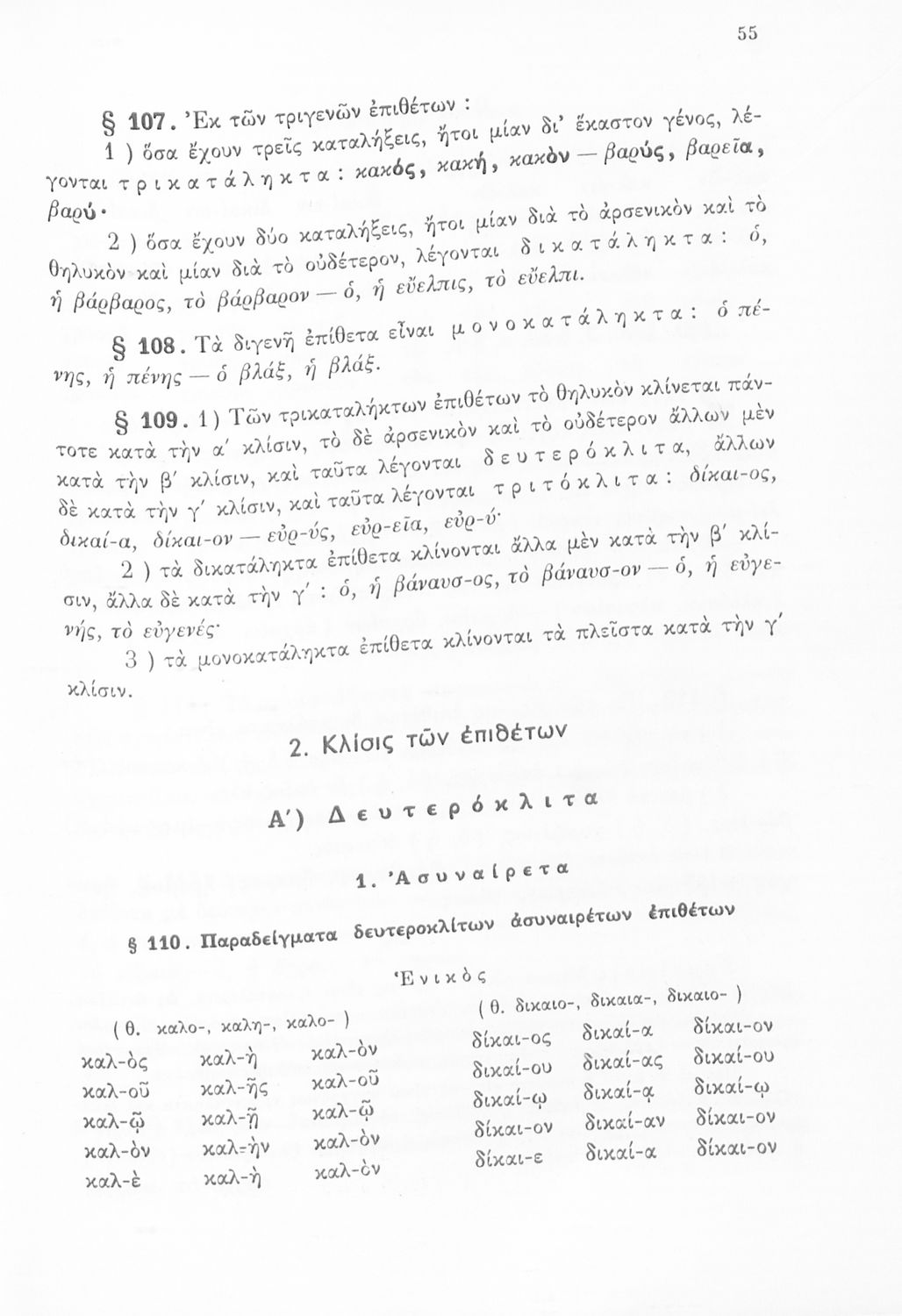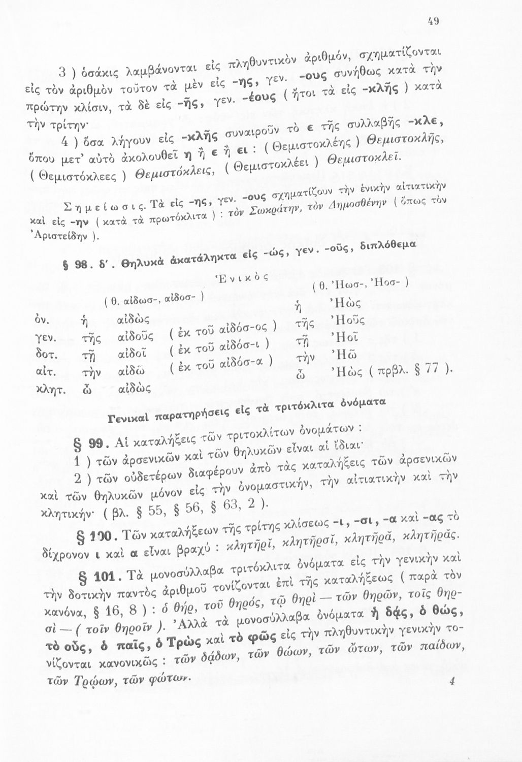 Γραμματική Αρχαίων Ελληνικών της Α΄, Β΄, Γ΄ και Δ΄ Γυμνασίου το οποίο εστιάζει στα μέρη του λόγου και στην σύνταξή τους και είναι χωρισμένο σε φθογγολογικό και τυπολογικό μέρος.