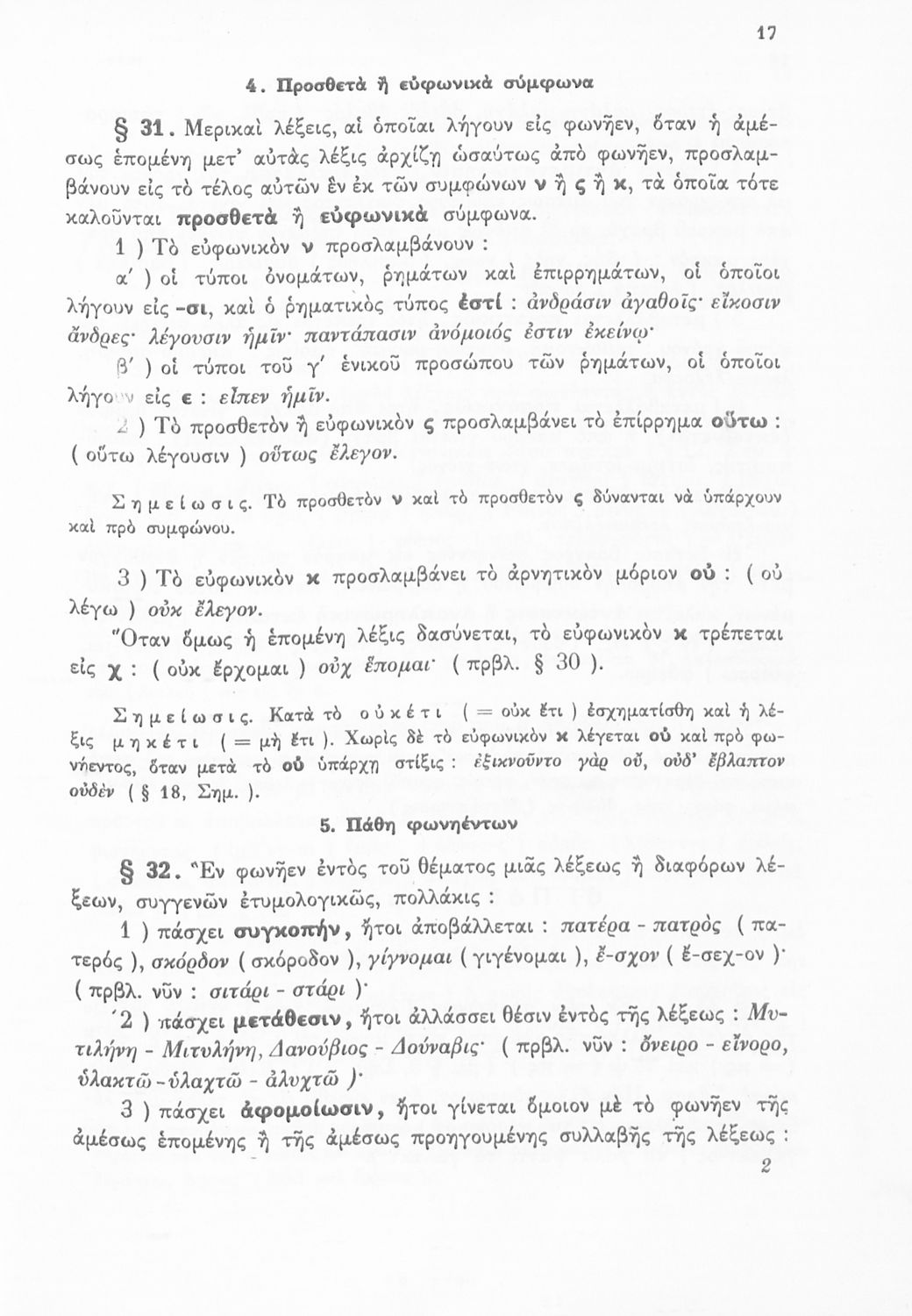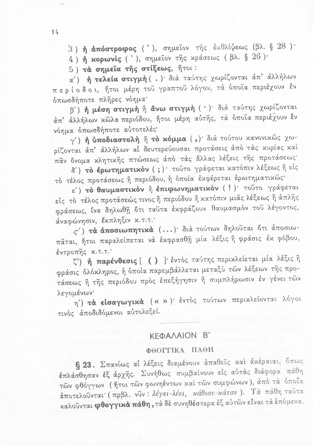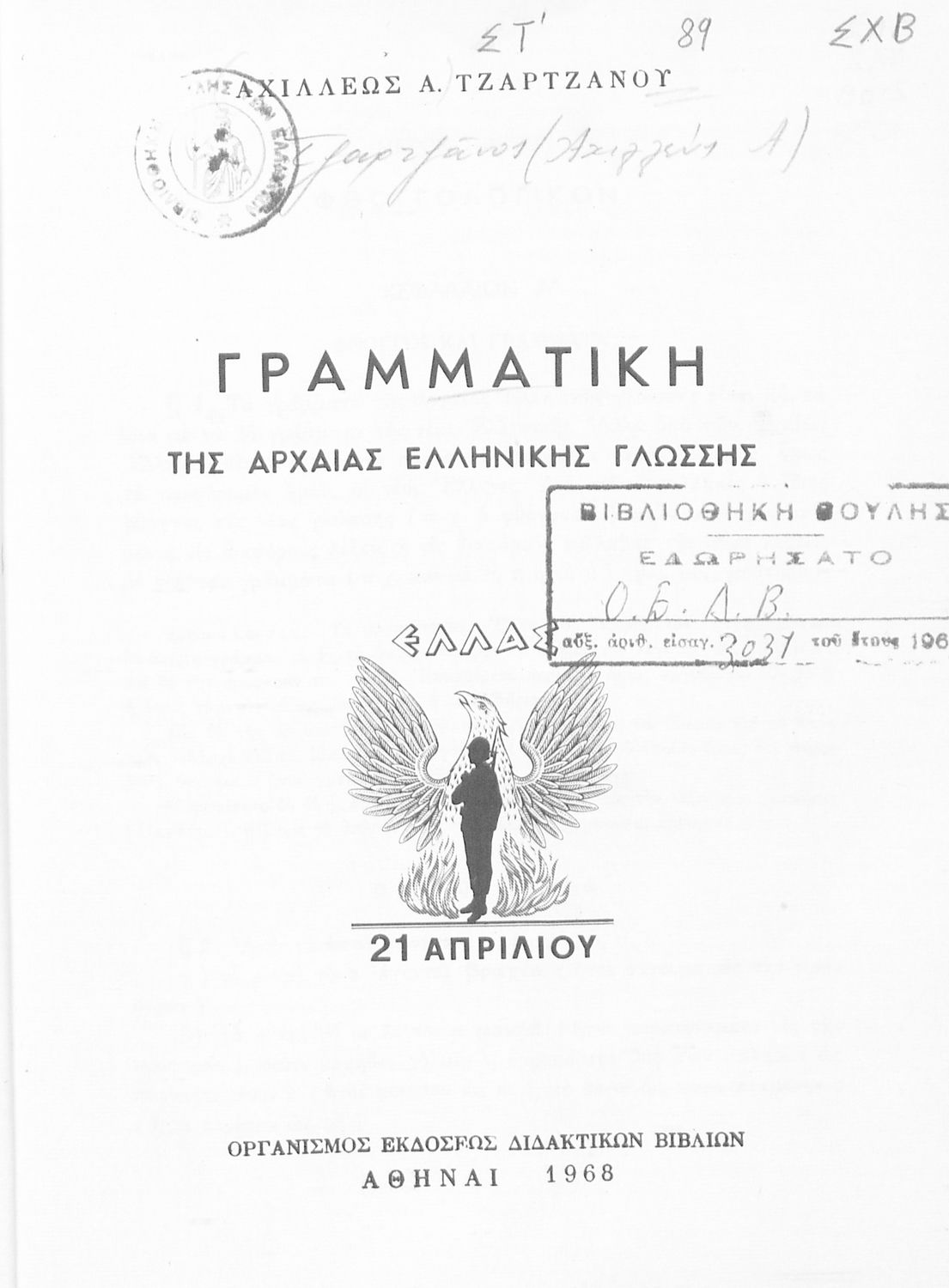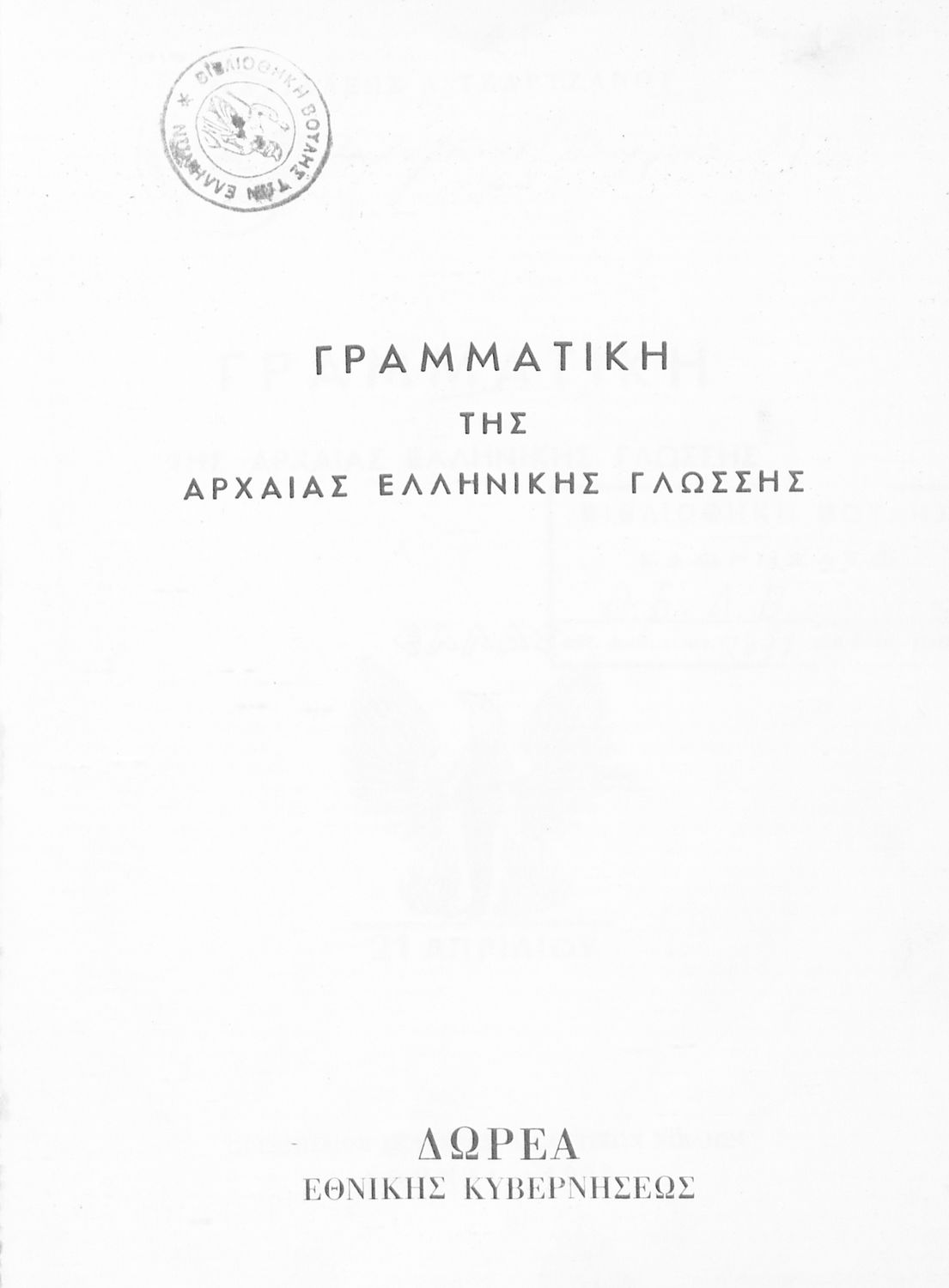 Γραμματική Αρχαίων Ελληνικών της Α΄, Β΄, Γ΄ και Δ΄ Γυμνασίου το οποίο εστιάζει στα μέρη του λόγου και στην σύνταξή τους και είναι χωρισμένο σε φθογγολογικό και τυπολογικό μέρος.