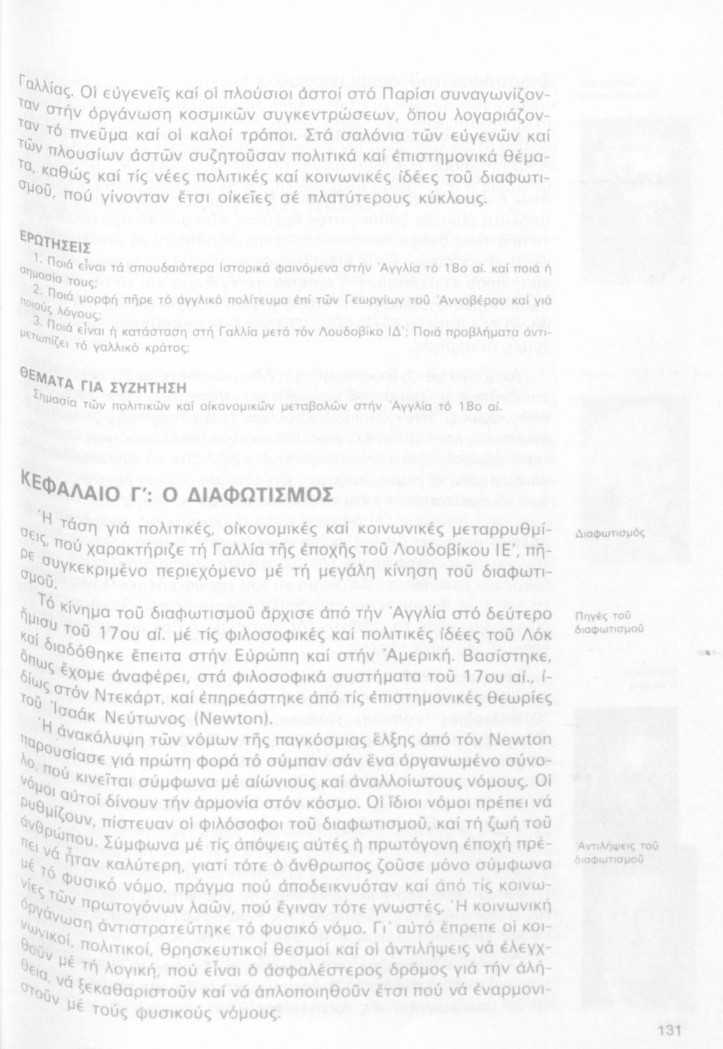 Σχολικό εγχειρίδιο Ιστορίας της Γ΄ Γυμνασίου. Το βιβλίο περιγράφει τη μετάβαση από την περίοδο των μοναρχιών και των αυτοκρατοριών στη δημιουργία των εθνών κρατών στην Ευρώπη. Εστιάζει στην Αναγέννηση και στον Διαφωτισμό και εξετάζει την εξέλιξη του αγγλικού κοινοβουλευτισμού. Τέλος, αναφέρεται στη ελληνική περίπτωση, την διάλυση της Οθωμανικής αυτοκρατορίας και τη δημιουργία του ελληνικού κράτους.