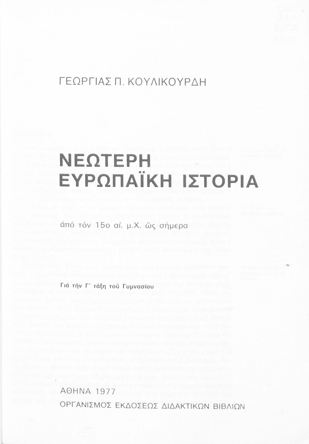 Κωδικός αναγνώρισης: 03-20557135 Τίτλος: Νεώτερη Ευρωπαϊκή Ιστορία από τον 15ο αι. μ. Χ. ως σήμερα για την Γ' τάξη του Γυμνασίου Συγγραφέας: Γεωργία Π. Κουλικούρδη Μέγεθος και υπόστρωμα: Σχολικό εγχειρίδιο, μαλακό εξώφυλλο, 356 σελίδες. Εικόνες, σκίτσα (έγχρωμα). |